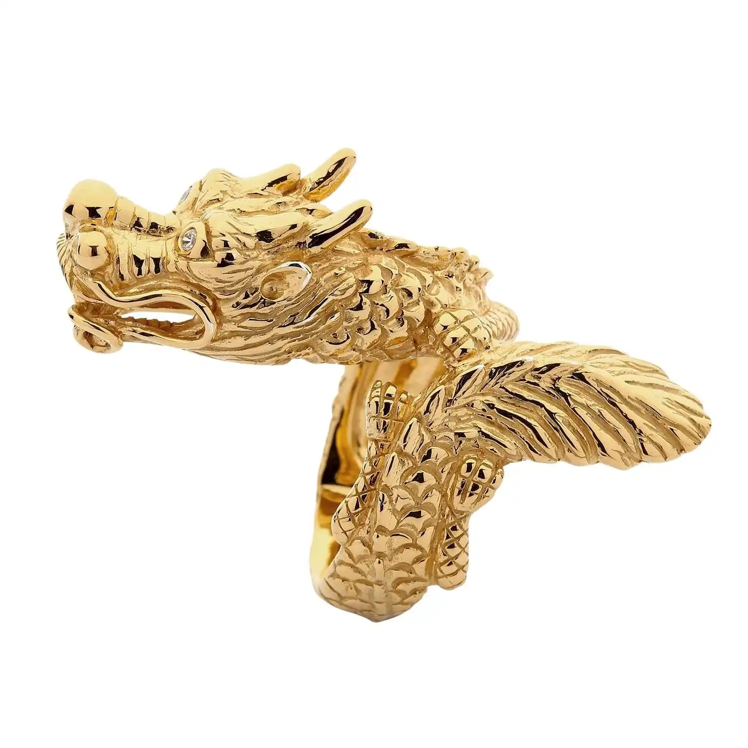 Diamond Eye Handmade 14K Yellow Gold Dragon Ring