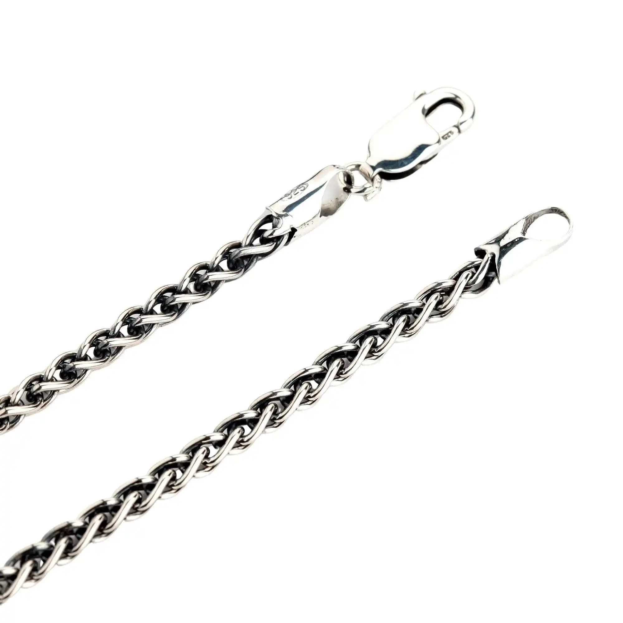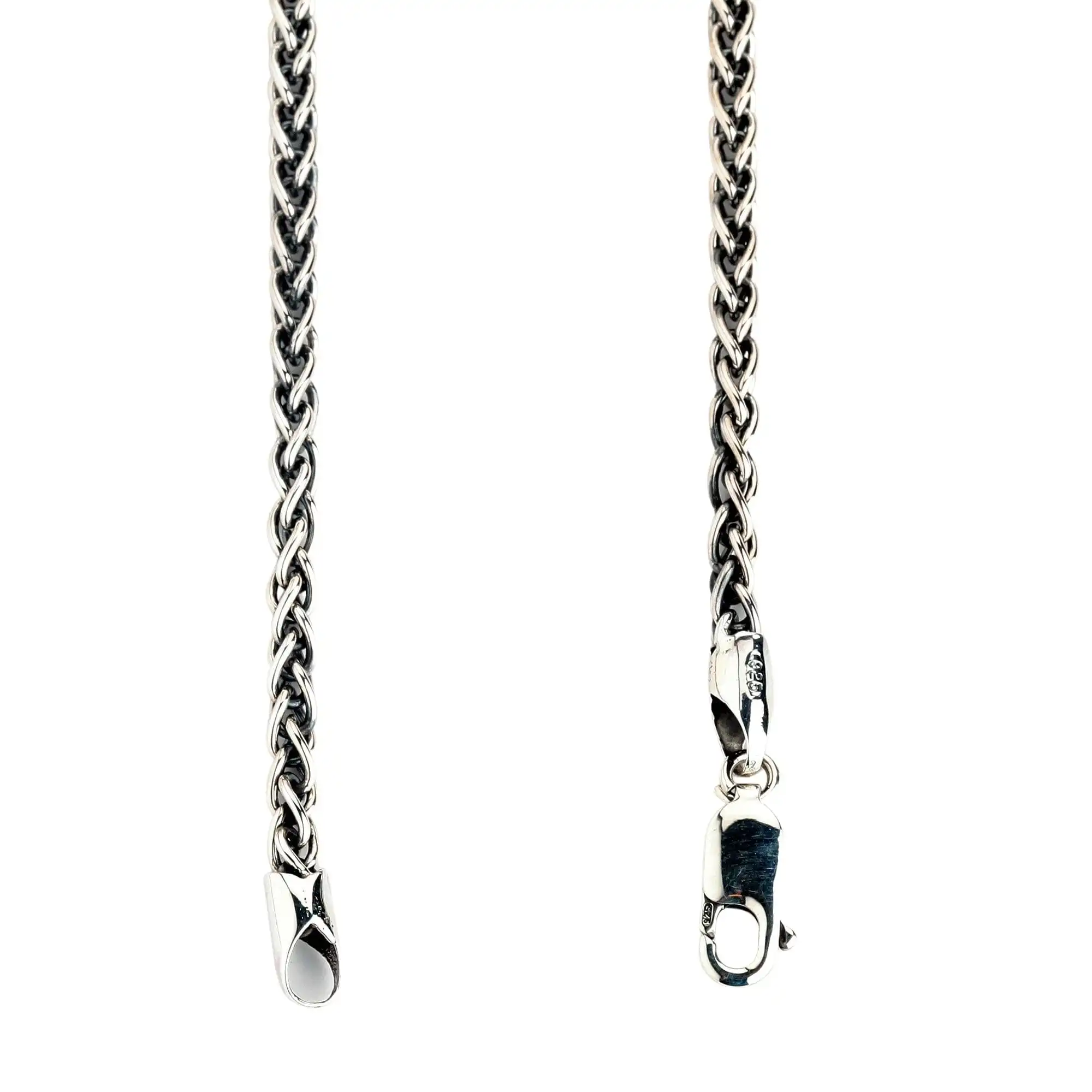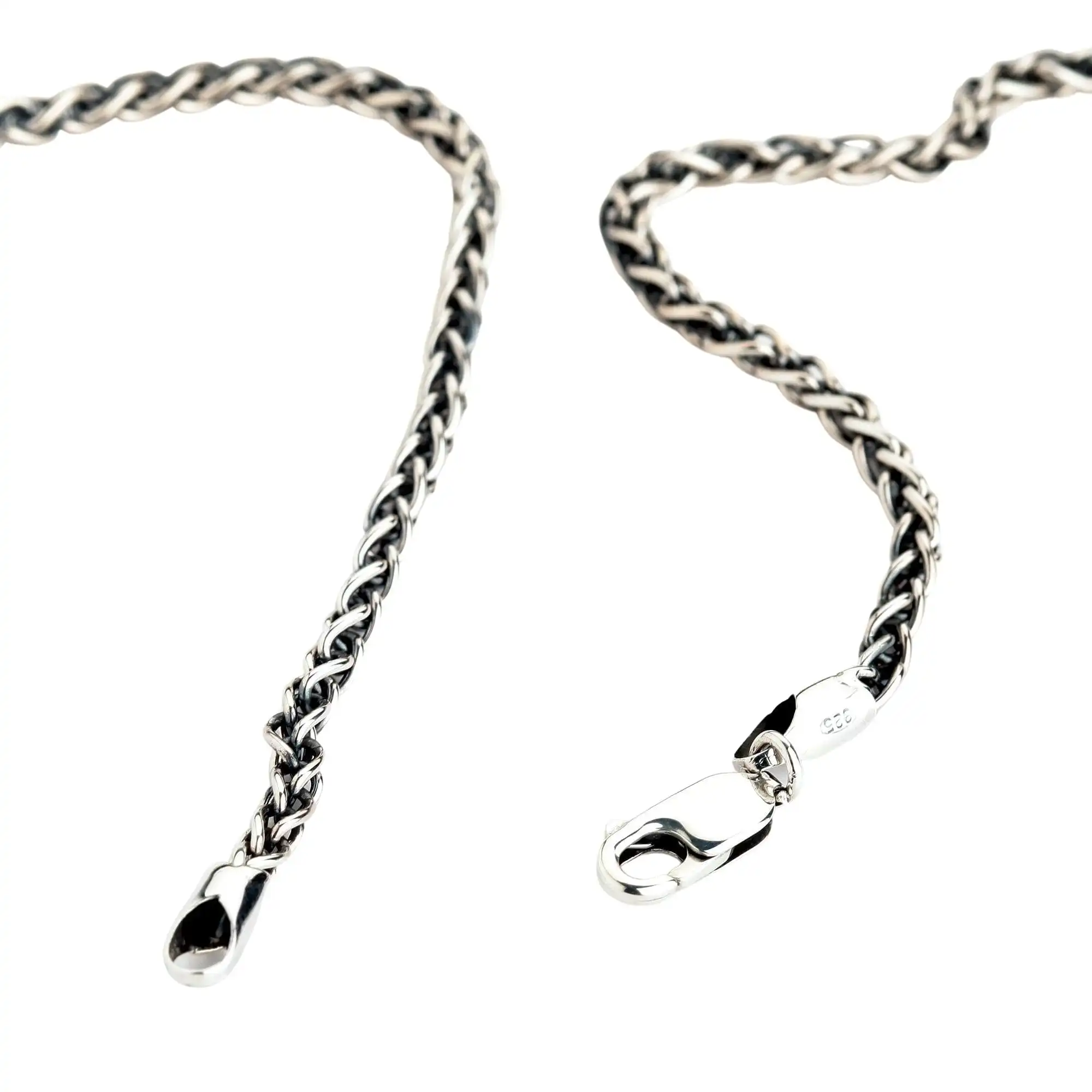We made 3.5 mm wheat chain necklace of 925 sterling silver, and there is a mark referring to this material on the clasp. Here, at Bikerringshop, we always make jewelry by hand, and this piece is no exception. Get to know the quality and resilience of designer jewelry for men and you will never opt for something different.