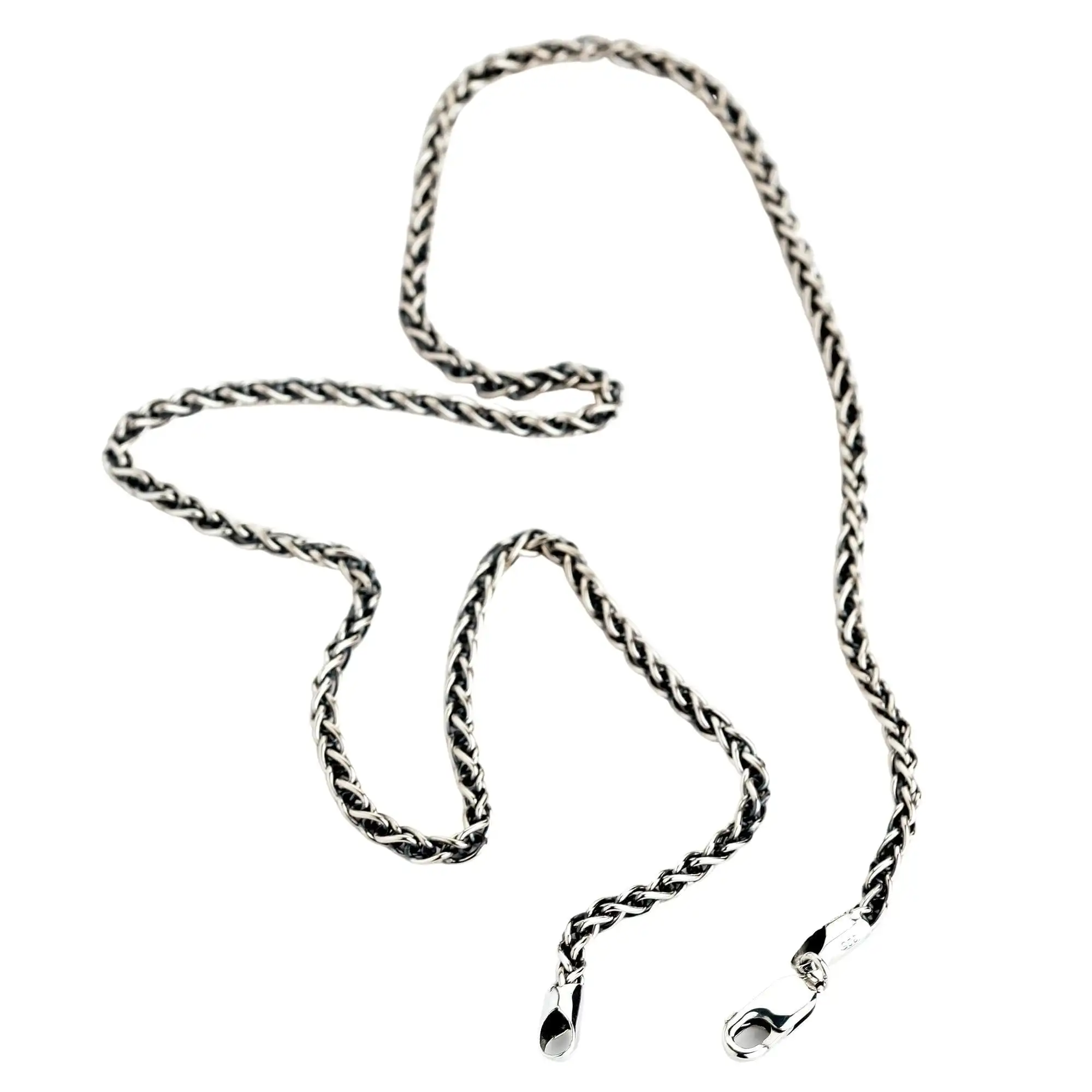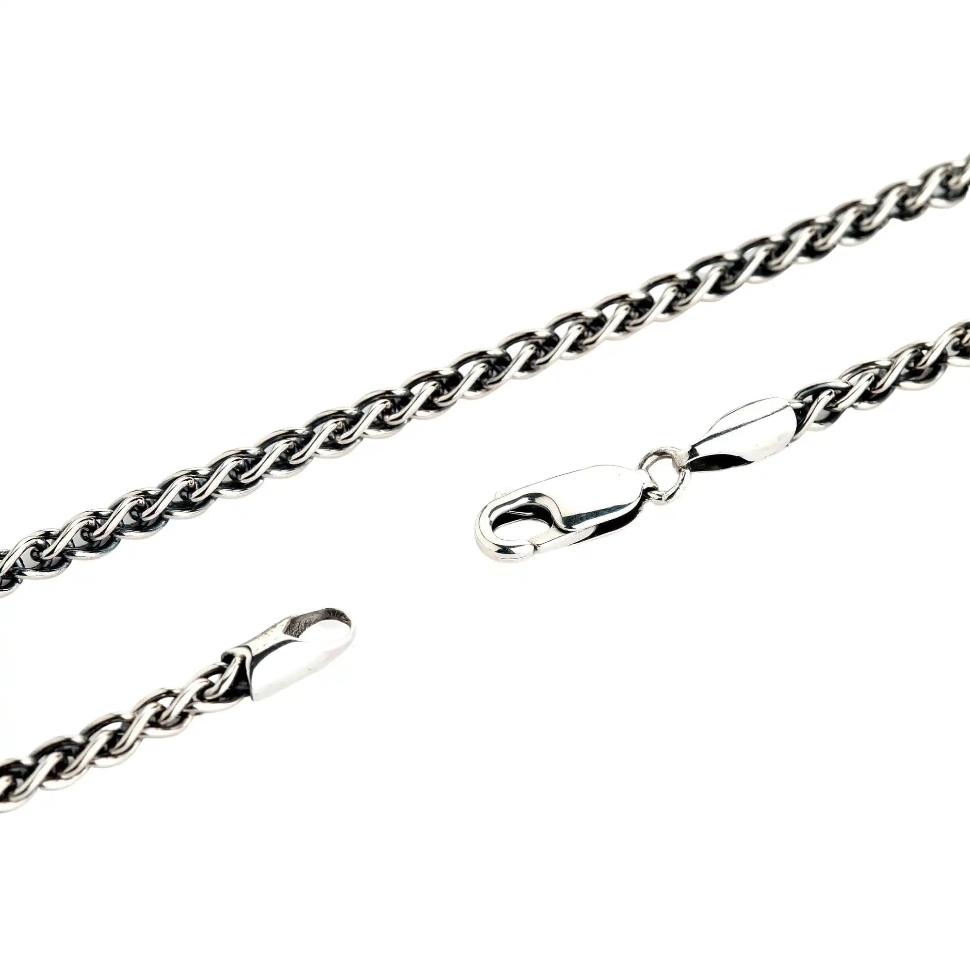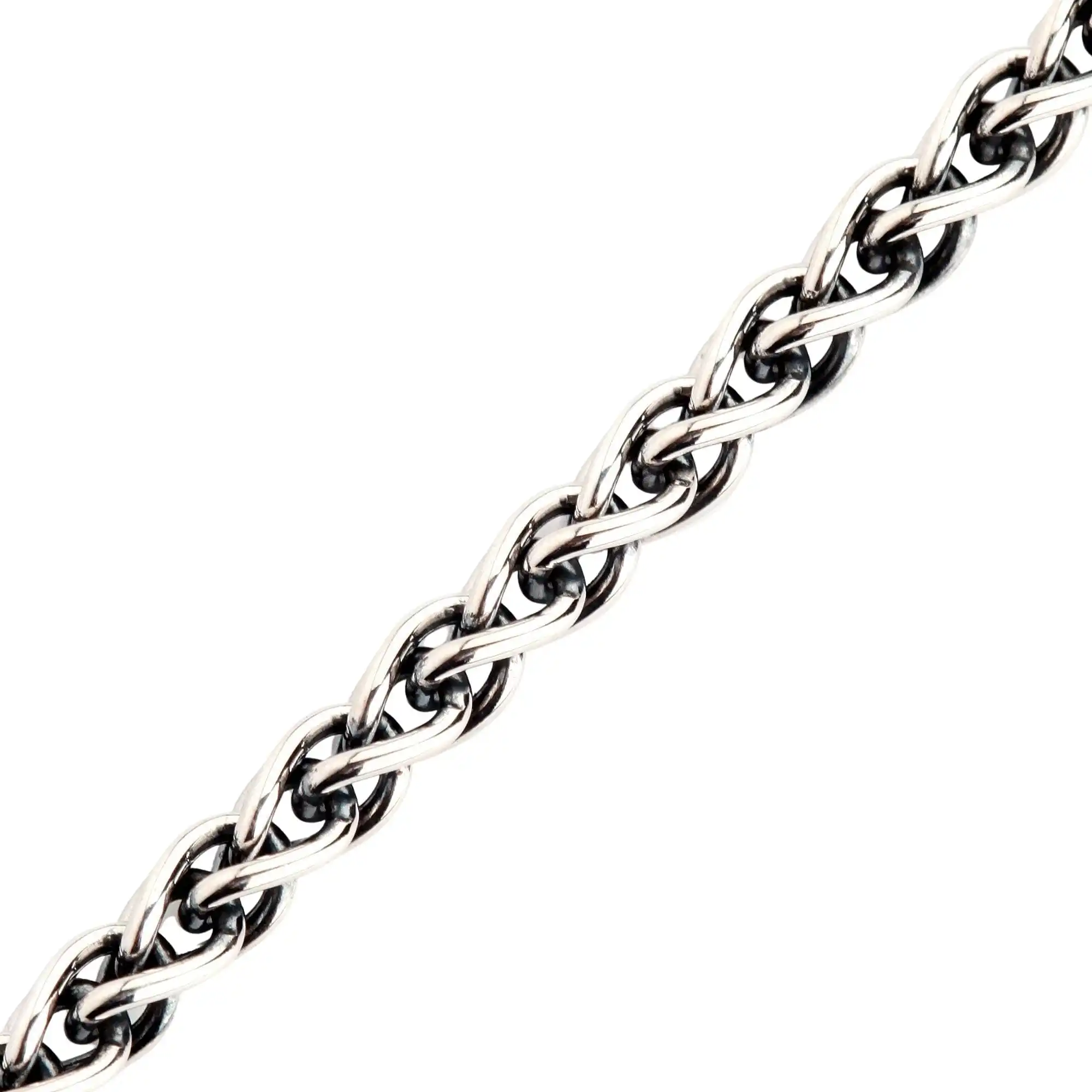 Wheat chains are also known as Persian and Spiga chains. They are woven of four strands for extra strength. The result is oval links tightly attached to each other. This piece of jewelry is made to hold fairly large pendants due to an increased link size – their diameter is 3.5 mm. It’s an excellent choice for men’s jewelry known for extra size and weight. We offer this product in two sizes – 20” and 22” (50 cm and 55 cm respectively).