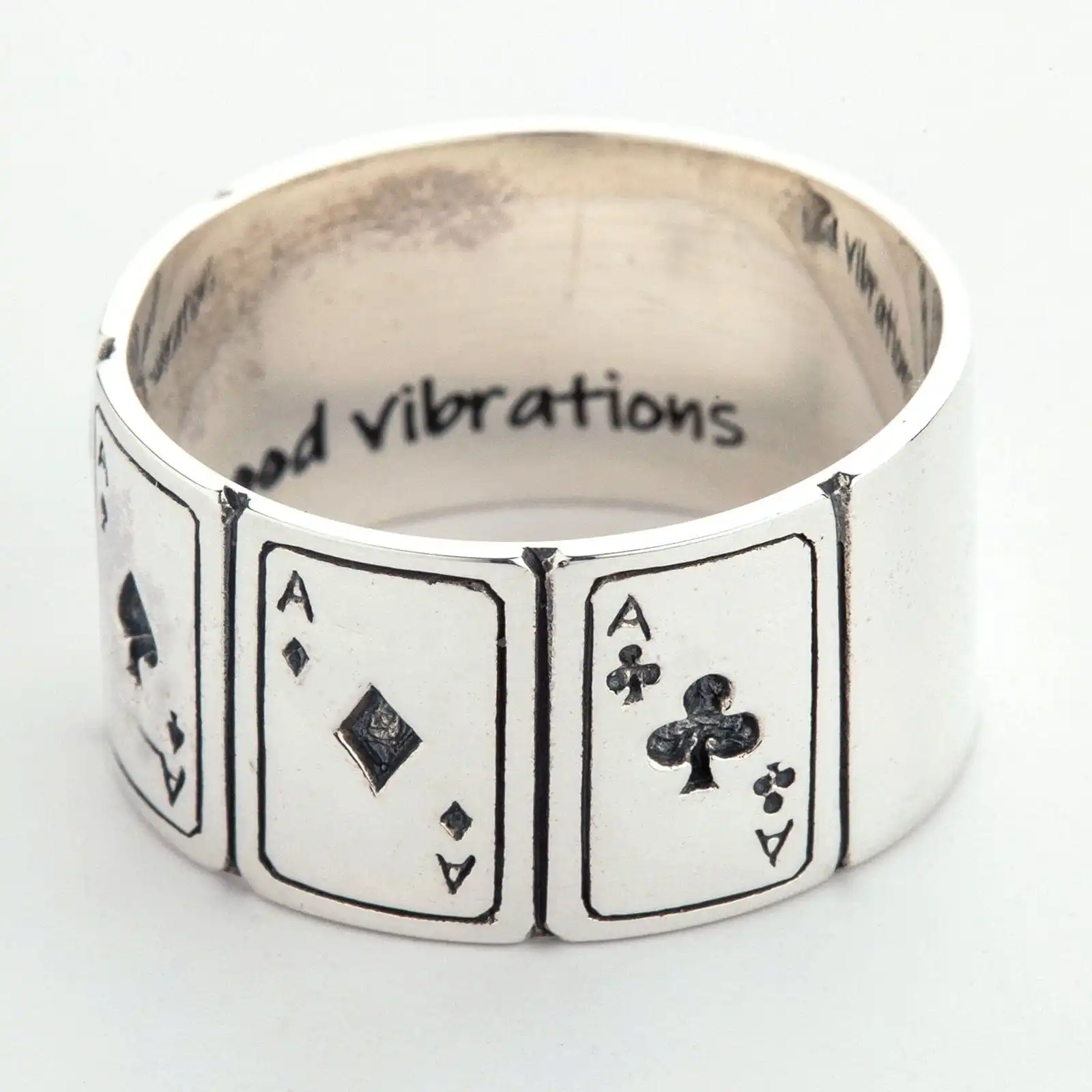 The ring is a fairly wide (11 mm!) band with a smooth, carefully polished exterior. Its face displays the Ace of hearts, spades, diamonds, and clubs in this particular order. The cards and their suits are carved in silver and their silhouettes are darkened for more expressiveness. If you’d like to hide your good luck symbol from the prying eyes, just rotate this ring till it shows its undecorated polished side.