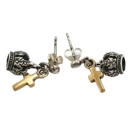 Secondly, these earrings lure due to a favorable combination of silver and gold. The rugged, matte, and intentionally weathered silver crowns stand out against shiny and polished gold crosses. Such a combination is designed to catch glances without being over the top or ‘in your face’. By the way, a cross is one of the most popular symbols in the biker culture (they have adopted many variations of crosses including Maltese, Iron, and Latin crosses). The crown denotes independence, confidence, and the fact that bikers deem themselves to be a better social stratum. Also, bikers are their own masters and nobody can tell them what to do and how to look.To craft these kick-ass earrings, we’ve used jewelry silver of the top quality, i.e. sterling silver with 92.5% silver content. The crosses molded from solid silver and plated with 14 gold. The whole piece has been cast and assembled by hand.