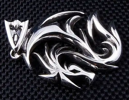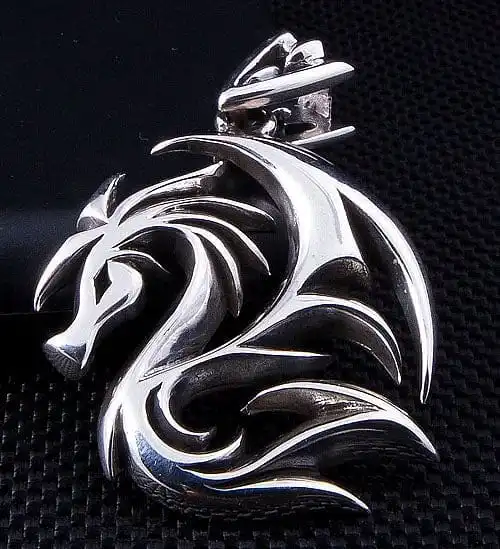 This dragon wolf pendant piece has been inspired by tribal art and incorporates elements of a dragon as well as a wolf. The swift shape represents the elegance of a dragon, whereas the fur like details resembles a wolf. Flipped over the dragon still appears, but looks even fiercer, ready to pounce.This pendant is made from the highest quality, 100% solid sterling silver, making this a durable pendant. A must have for any dragon or wolf lover.