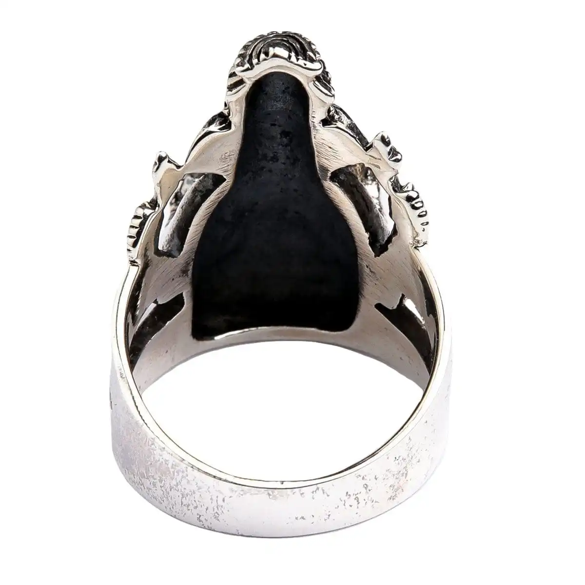To enhance its premium feel, this ring is made entirely from solid sterling silver. Our skilled craftsmen then finish it with a darkened accent which helps to bring out all the smaller details. It sits boldly on any finger and is sure to garner an abundance of attention in no time at all.