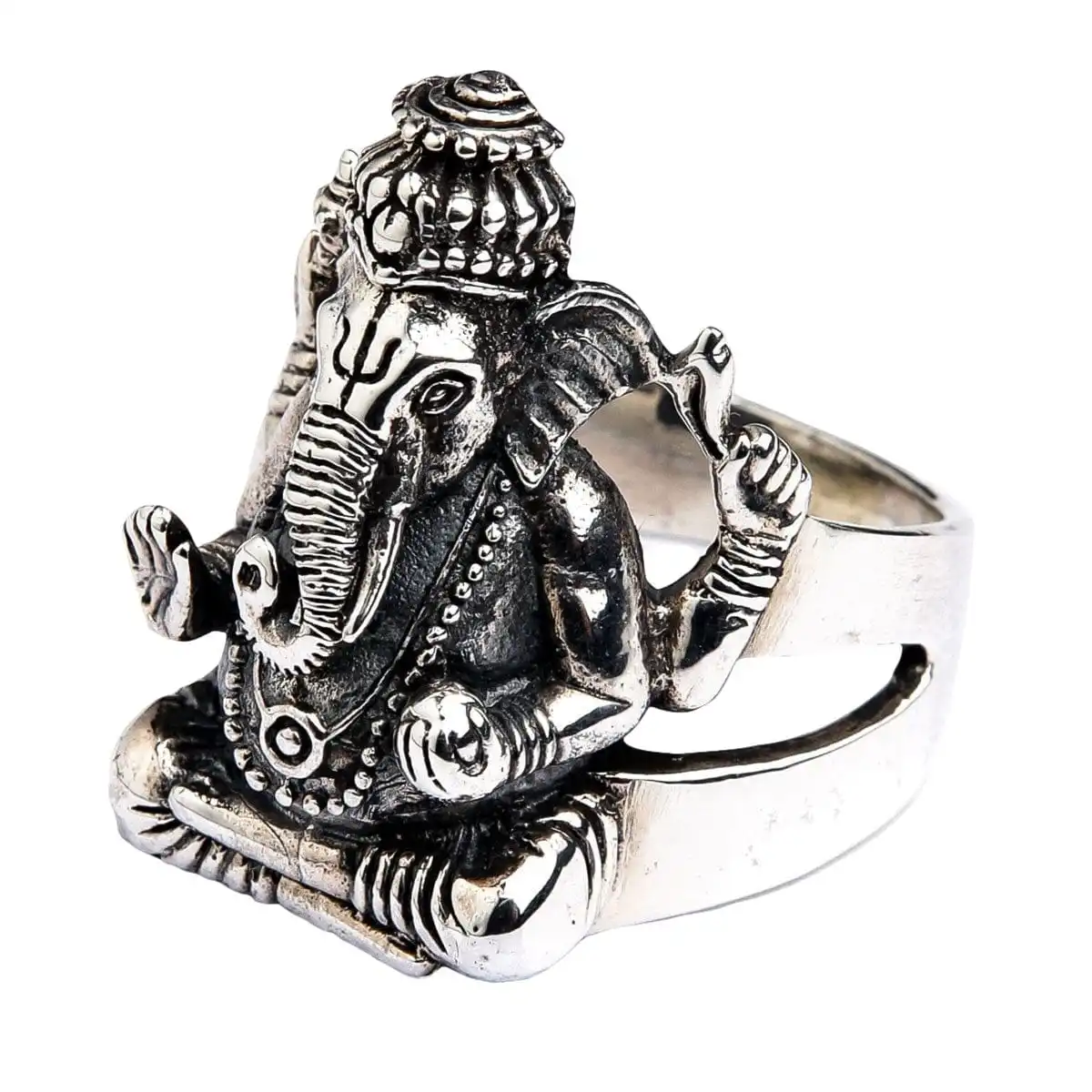 A symbol of intellect and wisdom, this sterling silver Ganesh Ring depicts the recognisable image of Ganesh in a beautiful and striking homage. With an impressive level of detail, this ring stands as its own mini sculpture as well as a truly breathtaking addition to your collection. Each intricate marking has been added with care and consideration, from the detail through his trunk to the raised hands and exquisite jewellery.
