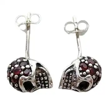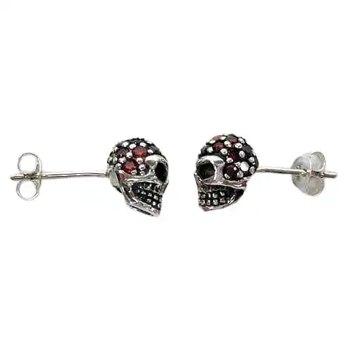 925 Sterling Silver Red Garnet Eyes Skull Stud Earrings