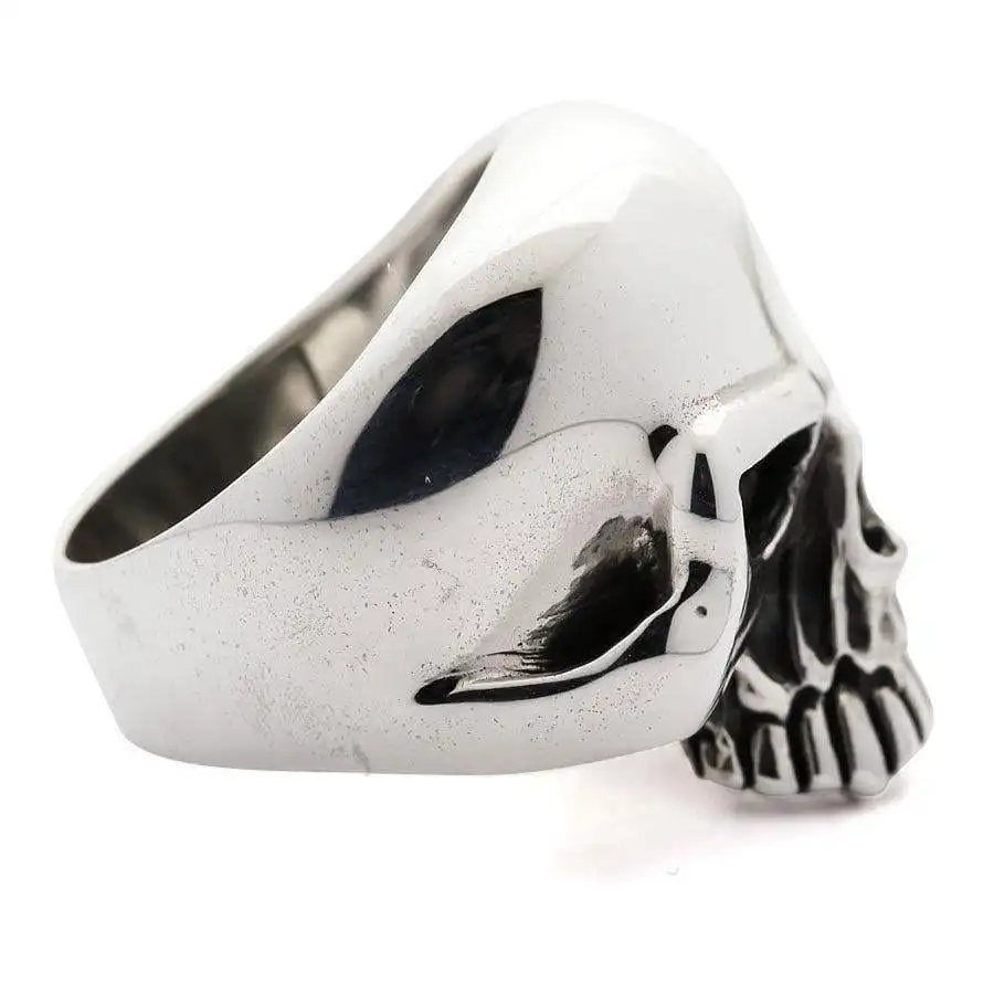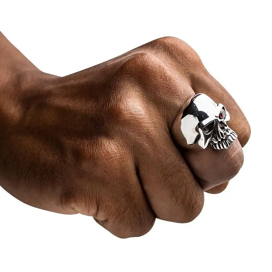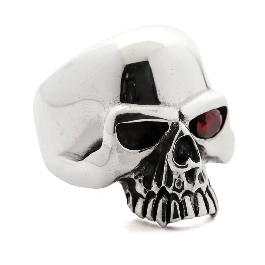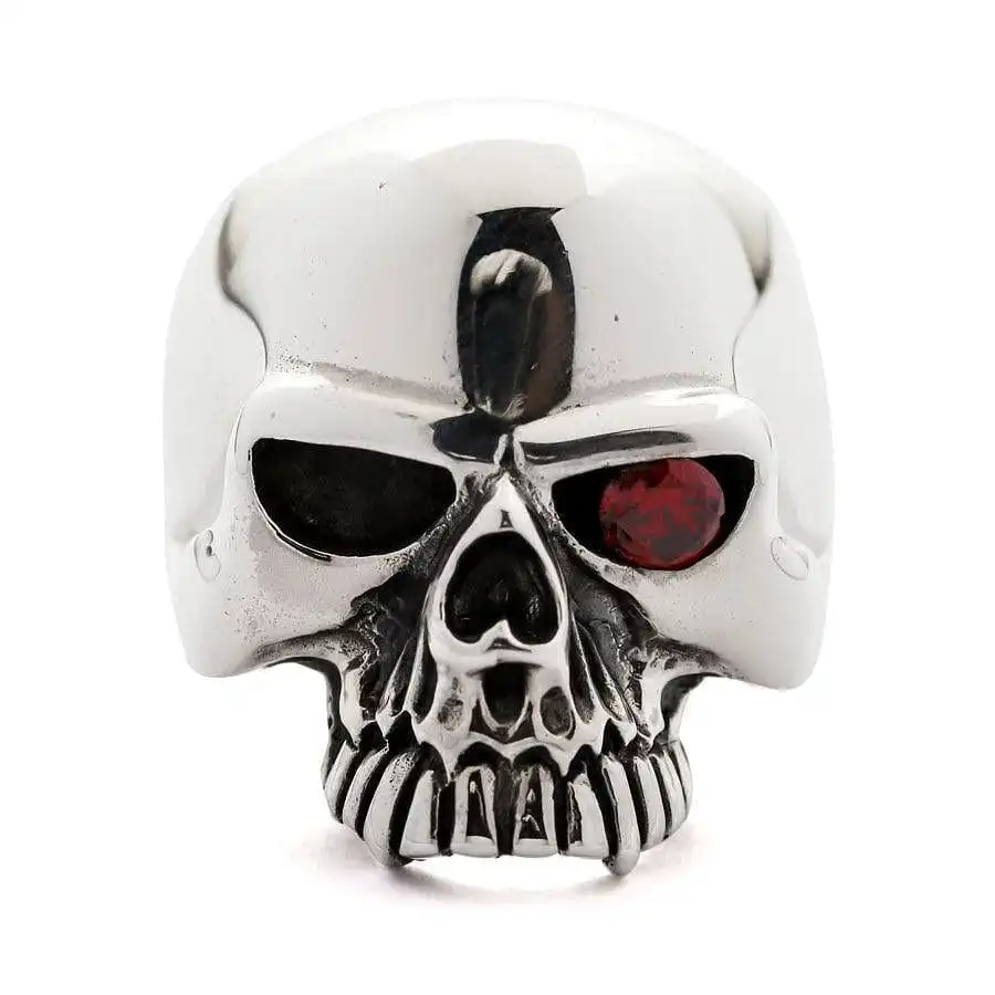 Combine the power of polished silver and deep red to discover true masculinity in our Ruby Red Eye Skull Ring. A face plucked from the depths of the underworld, this heart-racing creature glares out at every passer-by – the glint of red evident from his single ruby eye stone. The gritted teeth, angled cheekbones and hollow nose socket all bring with them an unnerving charm and one that wards off negative interactions with ease.