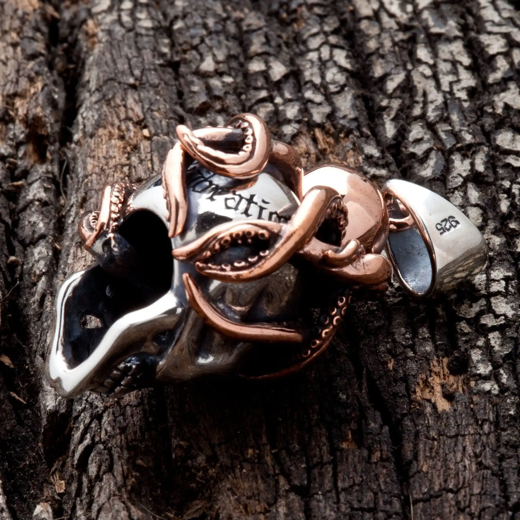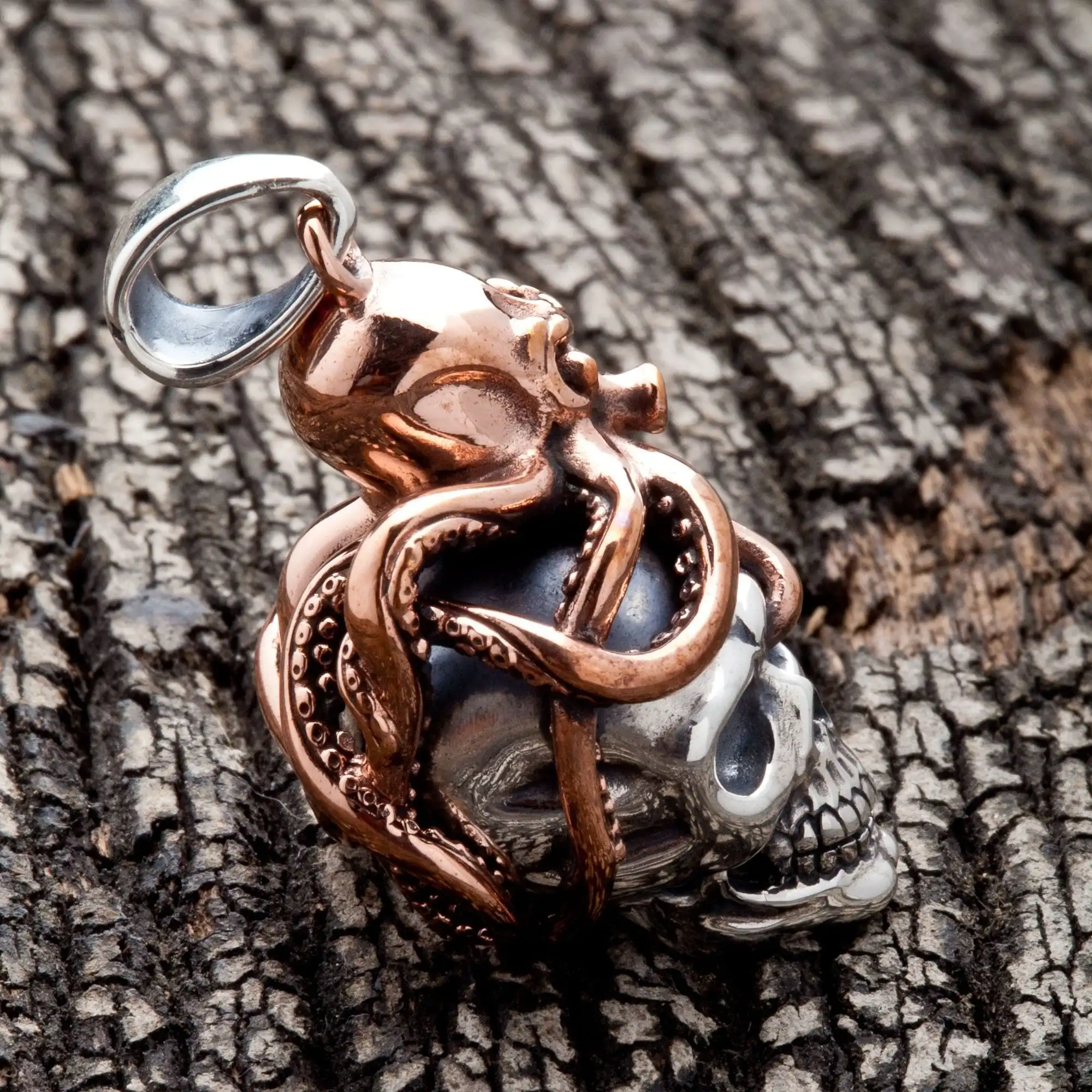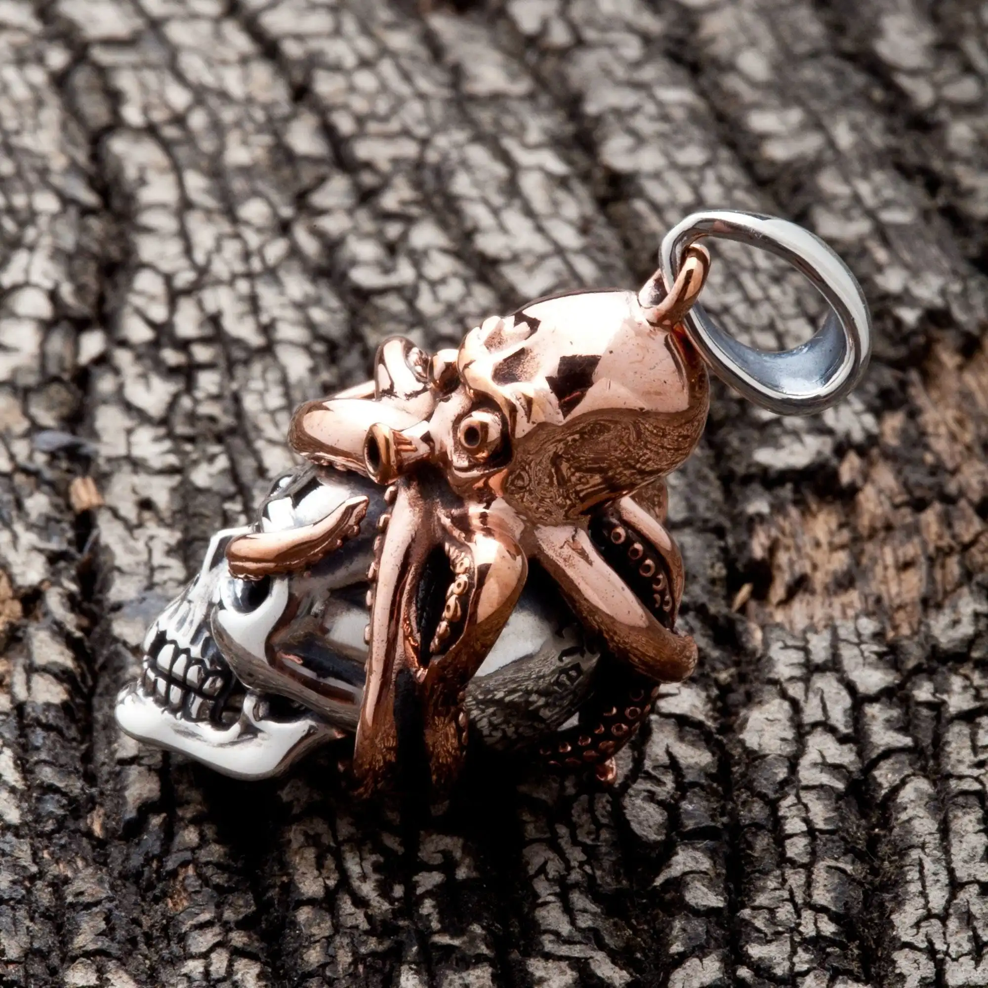 An awesome example of the talent of our artisan jewellers who create our spectacular pieces; the Gothic octopus pendant is a spectacular colour mix of solid Sterling Silver for the skull and polished Bronze Octopus which precariously perches on top.