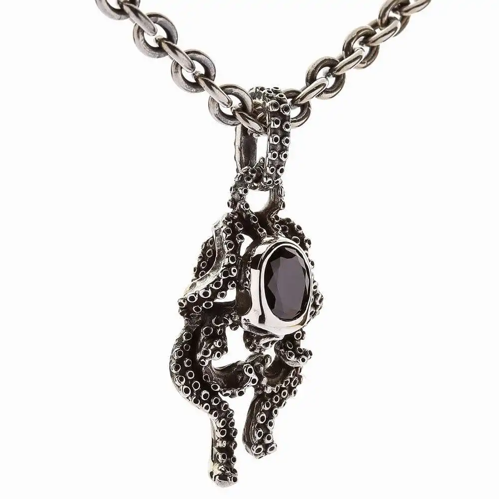 An octopus is the main hero of this pendant and necklace set. Its tentacles, attractive and repulsive at the same time, show off their flexibility, suckers, and out of this world look. But keep in mind that this is a Gothic piece of jewelry; therefore, it showcases a familiar image with a twist. Instead of an octopus head, it has a skull with an impressive black onyx inlay. Both skulls and octopuses are associated with dark and mystery because both came from the depth of the unknown. Simultaneously, both of these symbols denote life (although many could argue that a skull is death and they would be right – a skull stands for life and death alike). The bottom line is that an octopus and a skull have a complex significance. If you enjoy accessories with meaning, this one will be right up your alley.The pendant comes complete with a quite heavy Anchor chain in a matching finish. When putting on such impressive jewelry in terms of size, look, and meaning, your persona will surely command attention. Both pieces are hand-made of sterling silver.