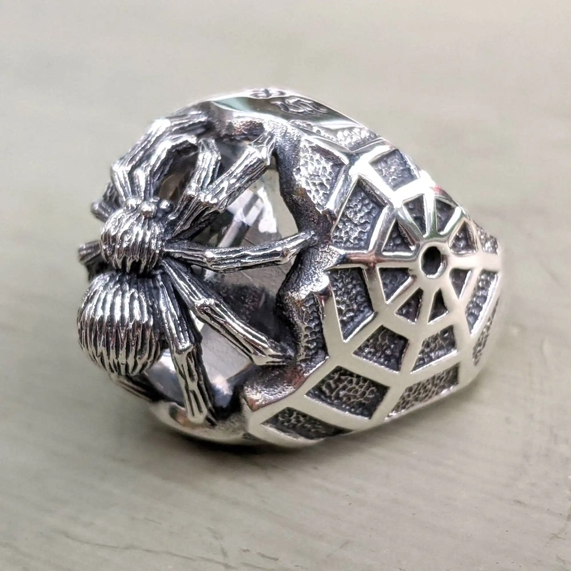 A spider depicted on this ring set up its nets waiting for the next victim. Perhaps you will be the next victim to the charm of this frightening but compelling arthropod. While hunting down its prey, it guards a massive clear stone, its treasure. It organically blends with sterling silver we made this ring of. It perfectly complements both shiny polished patterns and coarse details. Here, at Bikerringshop, we consider silver to be the best metal for men’s jewelry due to its muted yet noble appearance, exceptional durability, and the ability to fit in with biker fashion.