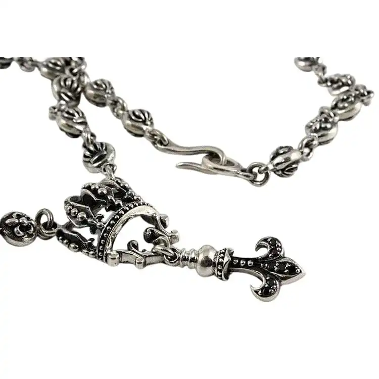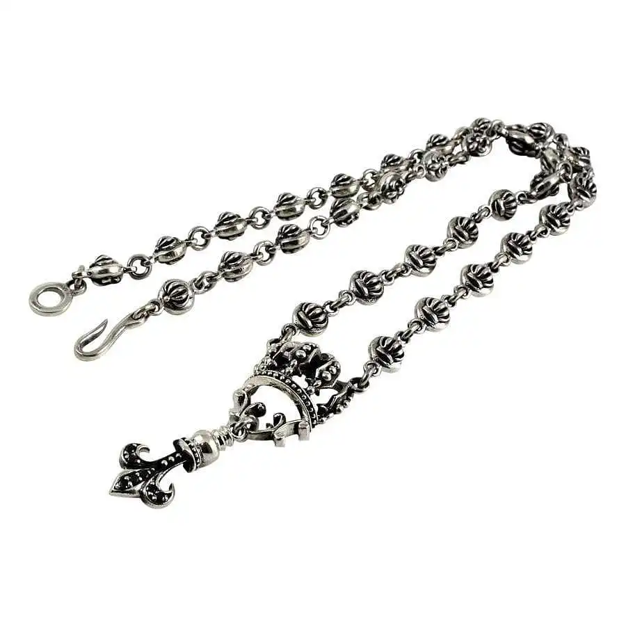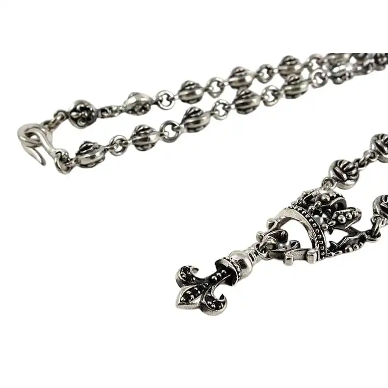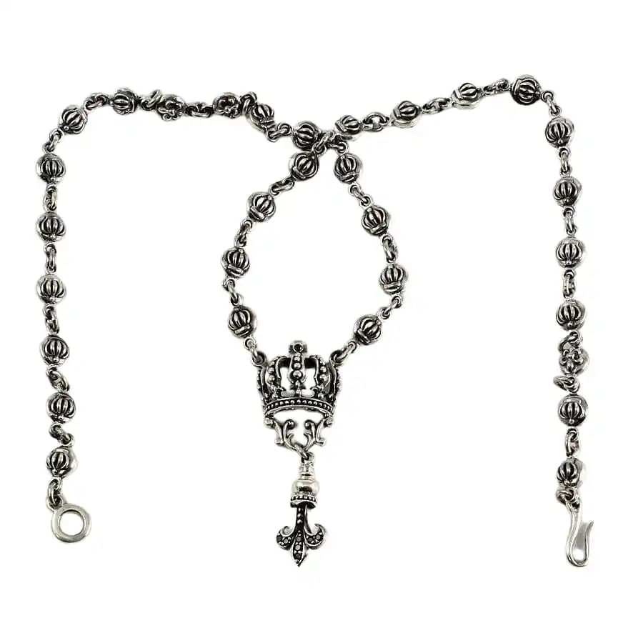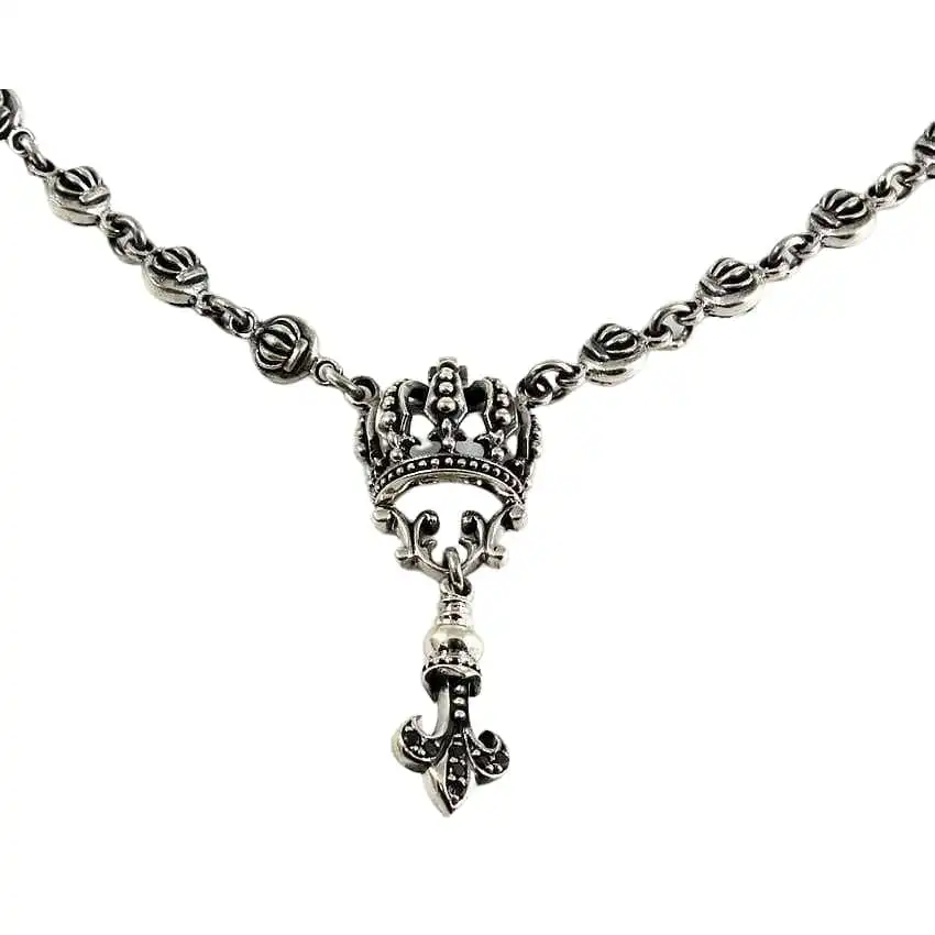 Carved by hand and inspired by gothic design, our Crown Sterling Silver Necklace fits well into your rider wardrobe. It combines a regal symbol – the crown – with the fleur de lis emblem. This creates a majestic piece that seems inspired by rosary beads and one that finds its way easily into your style.