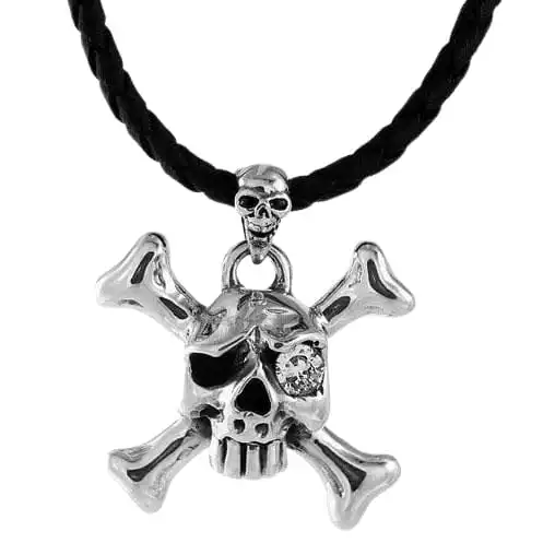 The favorite symbol of every pirate, the crossbones, is a choice of bold, adventurous, and risky men. You don’t have to be a corsair sailing the open seas under the Jolly Roger banner to make this symbol part of your distinct style. If you have guts to wear it, just do it! In case you’re hunting down jewelry adorned with this symbol, here is a piece worthy of consideration – the Diamond Eye Crossbones Skull Pendant Necklace.The crossbones pendant is a centerpiece of this set. The hardy skull lost one of its eyes in a battle, so it wears a clear CZ stone as a patch. To match its shiny quality, we meticulously polished sterling silver. Now you can look at it like in a mirror and imagine leading an adventurous lifestyle or a formidable pirate. We decided this pendant needed more skulls, so we put a small cranium on the pendant’s loop.