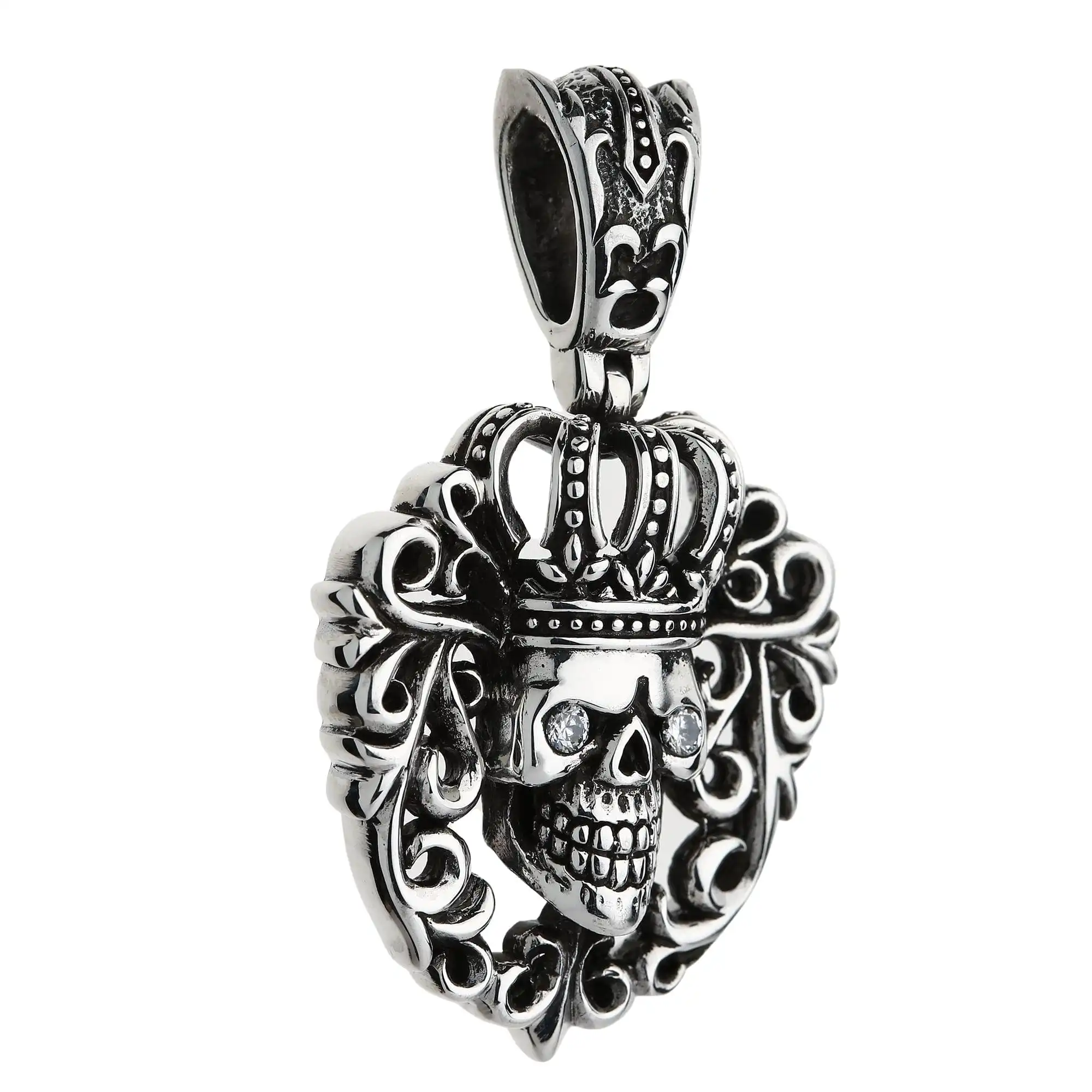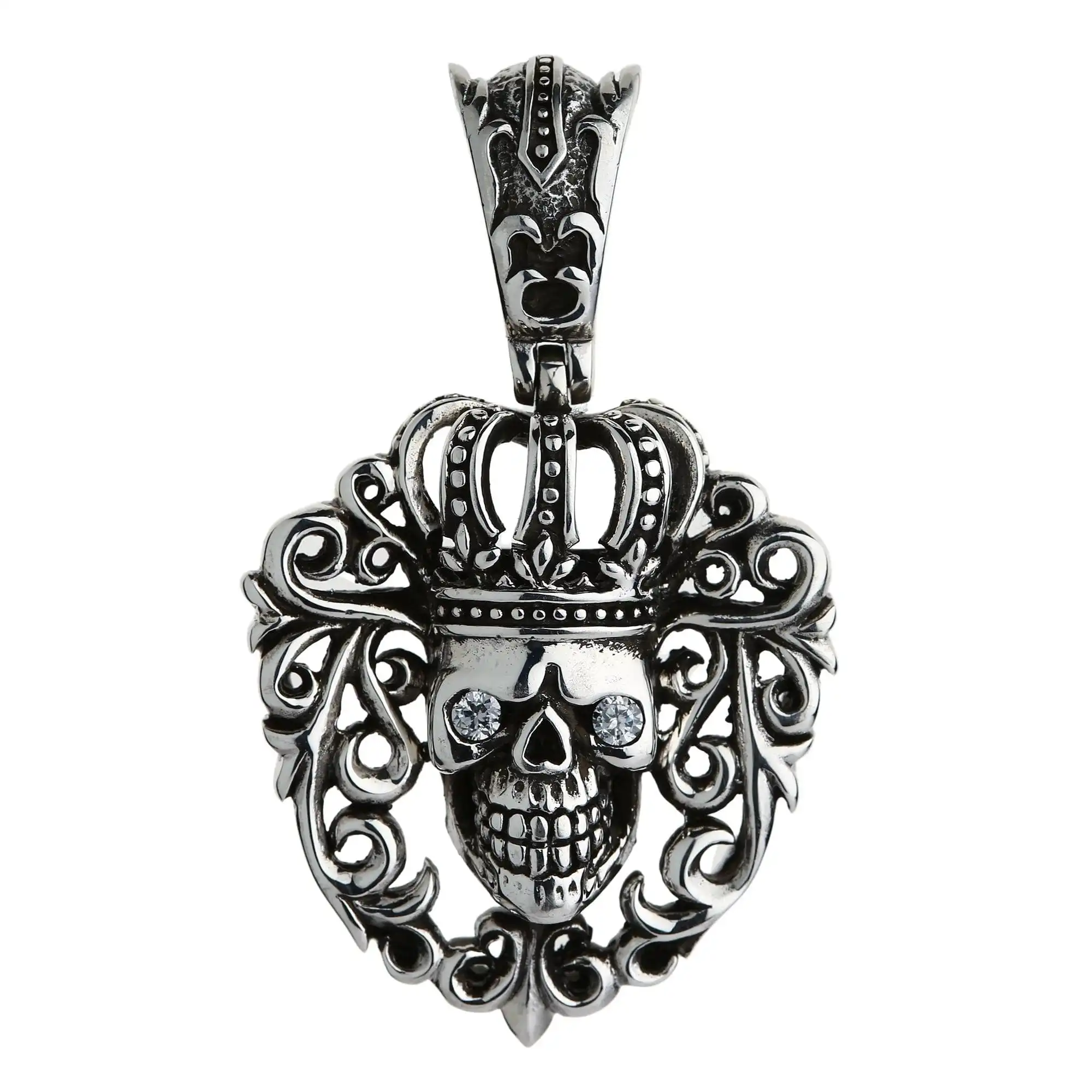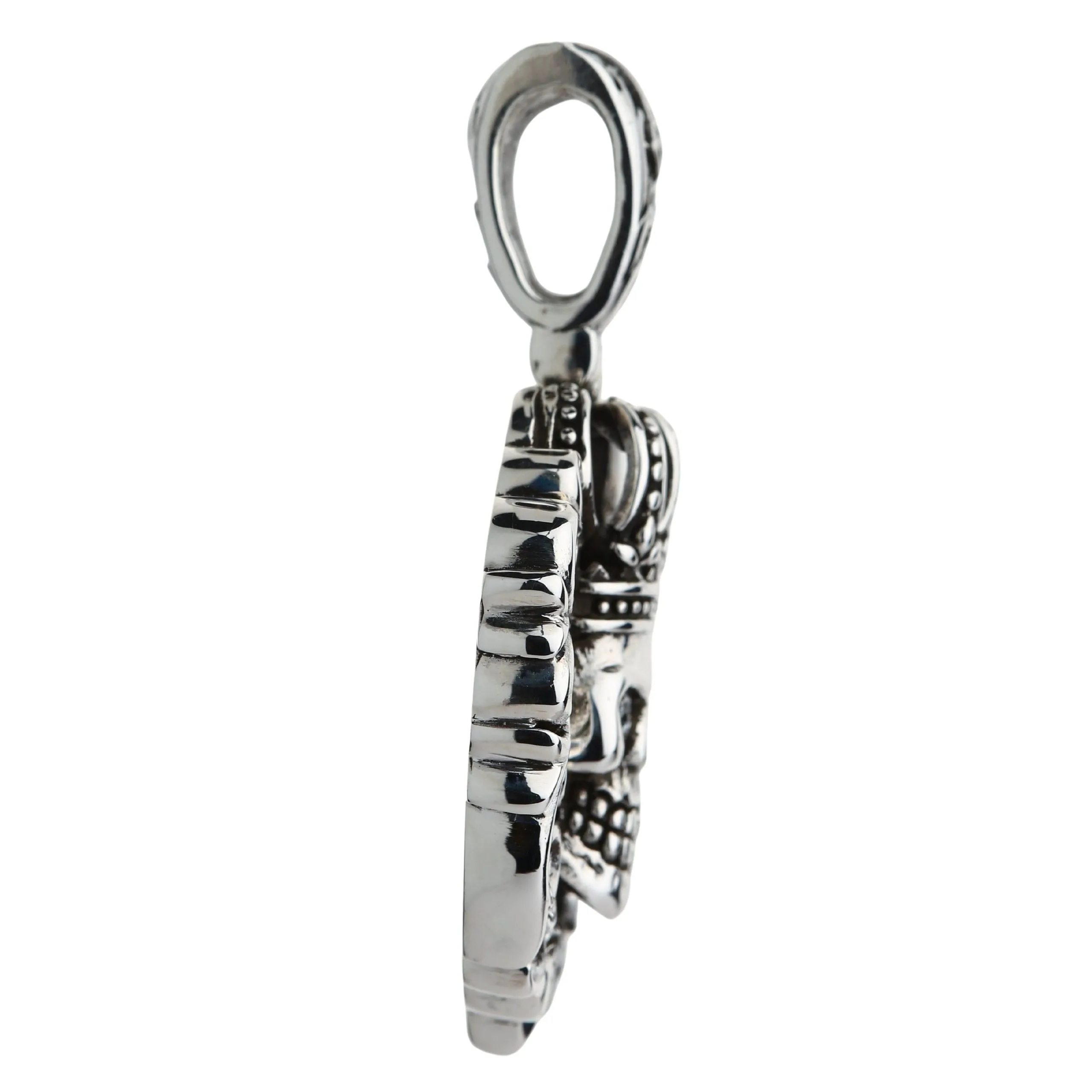 Crowned as queen, our Diamond Queen Crown Skull Pendant strikes respect into all who gaze upon it. Intriguingly intricate, it features a shielded mass of swirls and dips surrounding the snarling face of a diamond-eye skull head. A touch of regal inspiration takes its place in the form of a crown, perched high and proud for all to see.