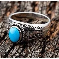 Do you love silver? Are you looking for a new ring to add to your biker accessory collection? This biker ring is a powerful piece that is visually stunning with intricate carvings and designing and a beautiful turquoise gemstone center inlay.