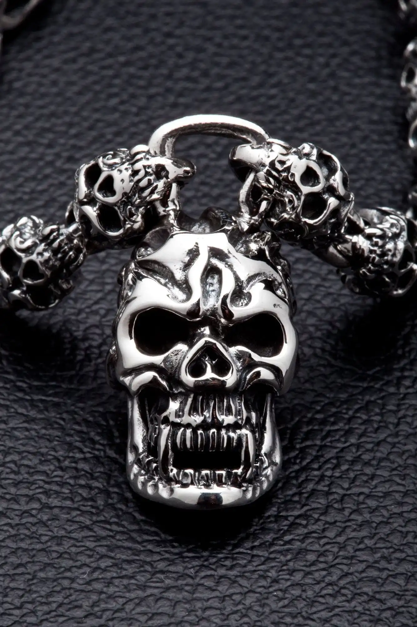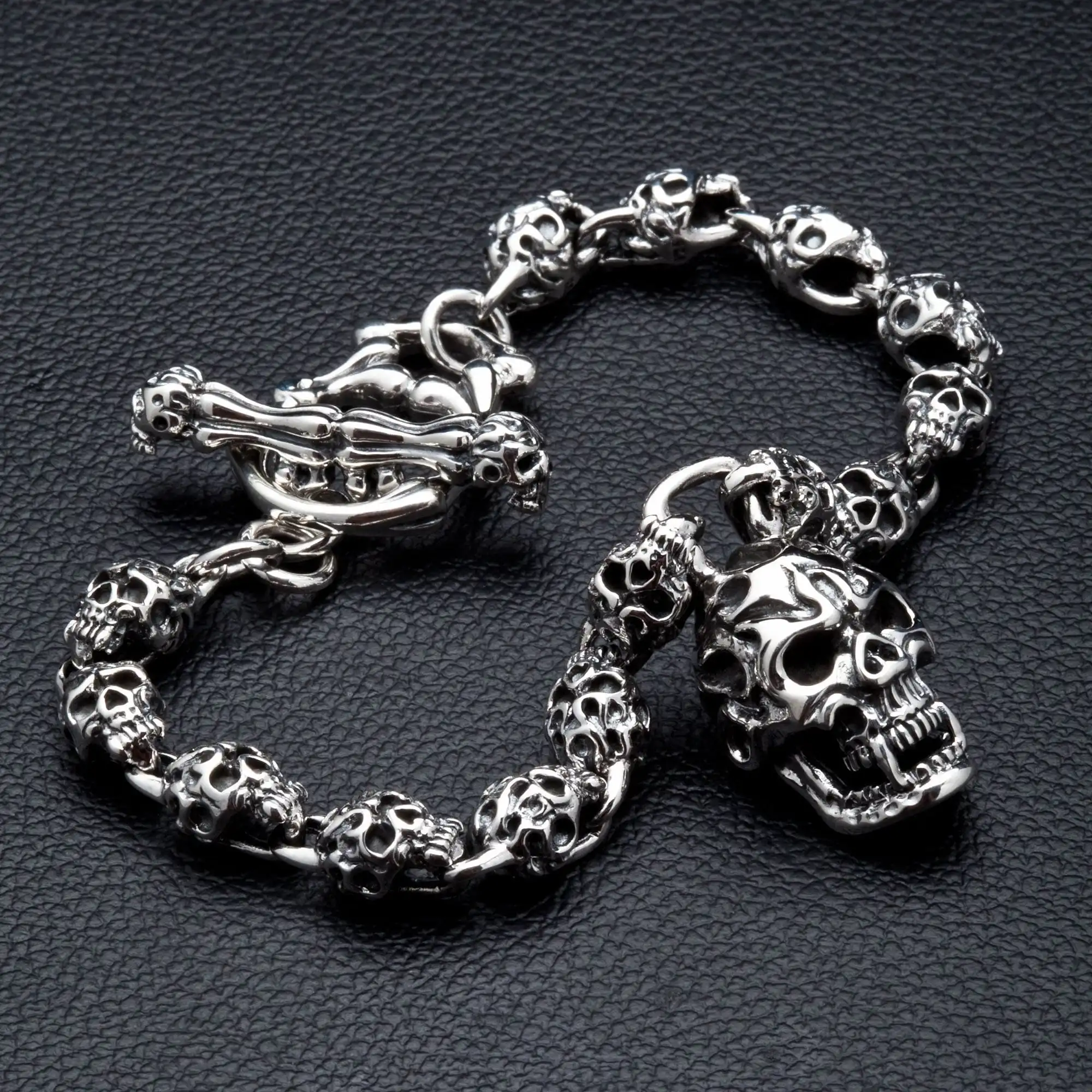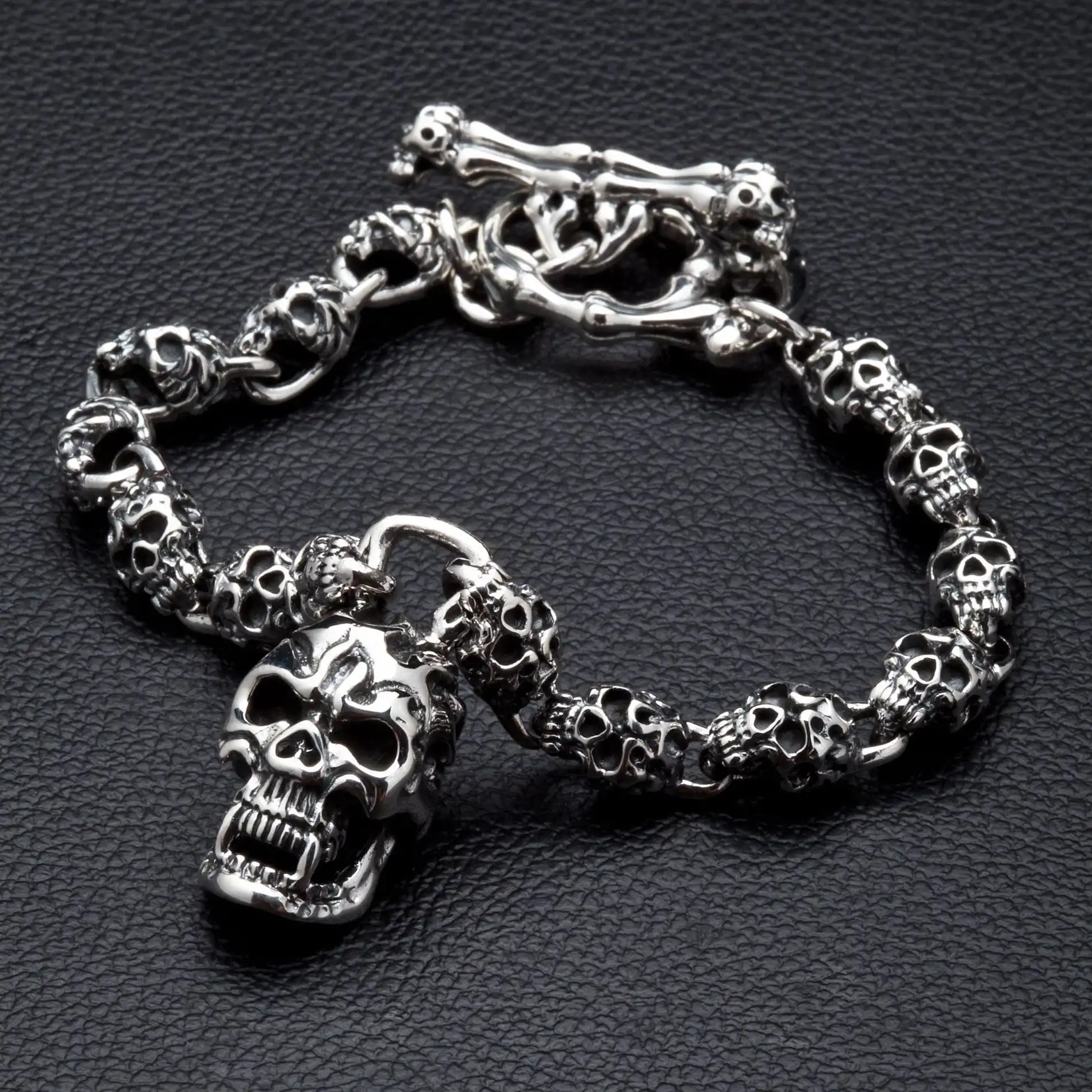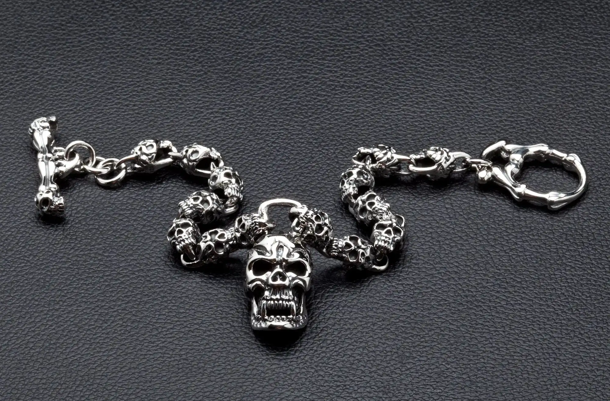 Small 100% solid sterling silver skulls have been attached mouth to chain to create this stunning bracelet. The clasp has the appearance of a bone adding to the overall statement of this piece. The main focus of this bracelet is the large skull that dangles down in the middle of the bracelet. This would make an ideal gift for any occasion either for a friend, family member or for yourself.