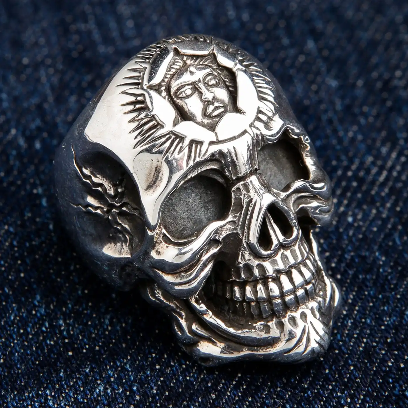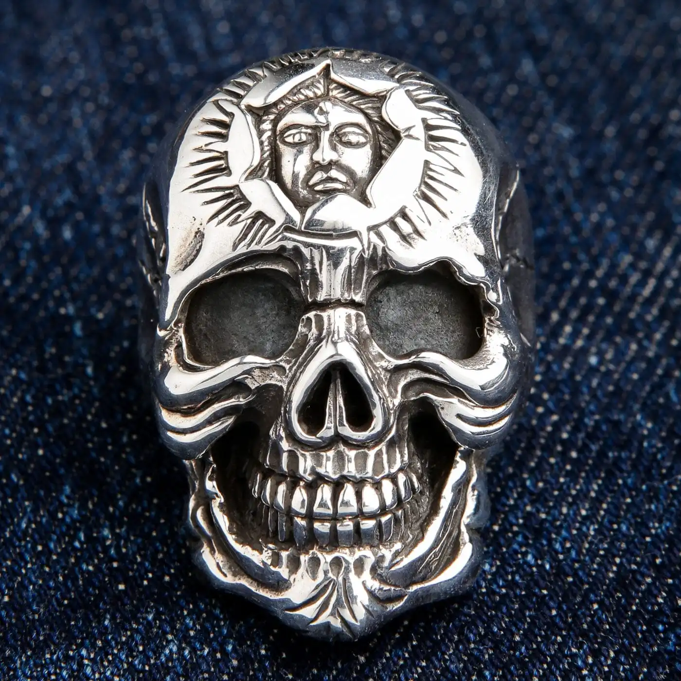 Make a bold statement with this Sun God Skull sterling silver ring!