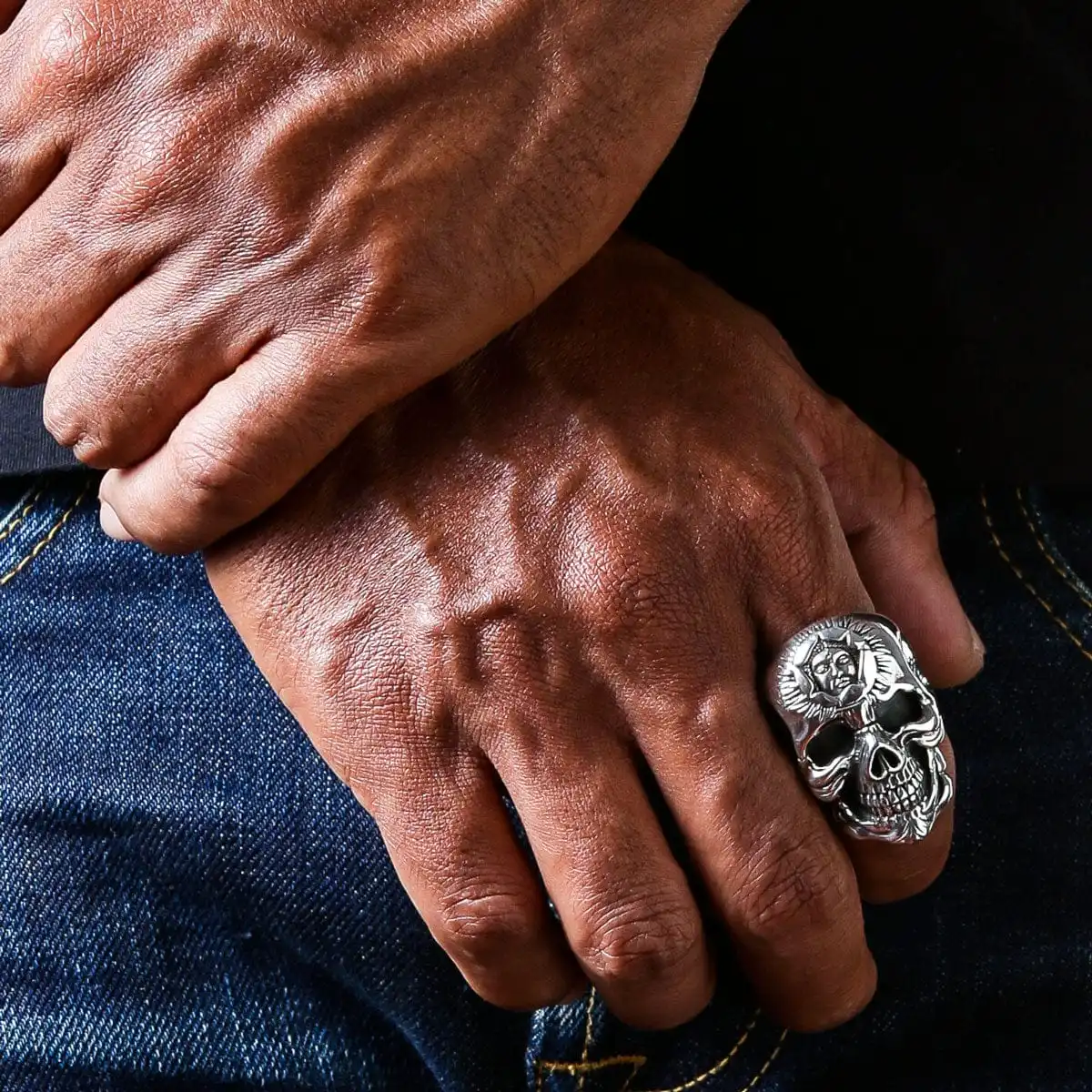 Featuring a detailed sun god skull design, this sterling silver skull ring will compliment a range of outfits and looks particularly suited when paired with leather clothing, or biker wear.