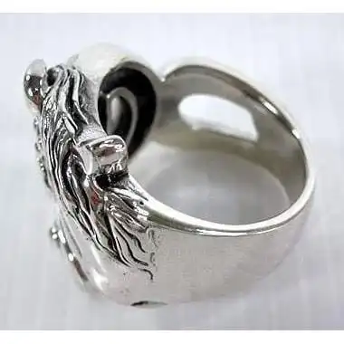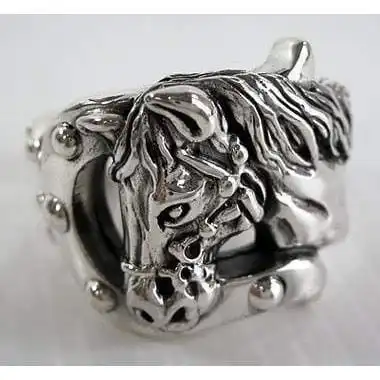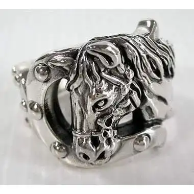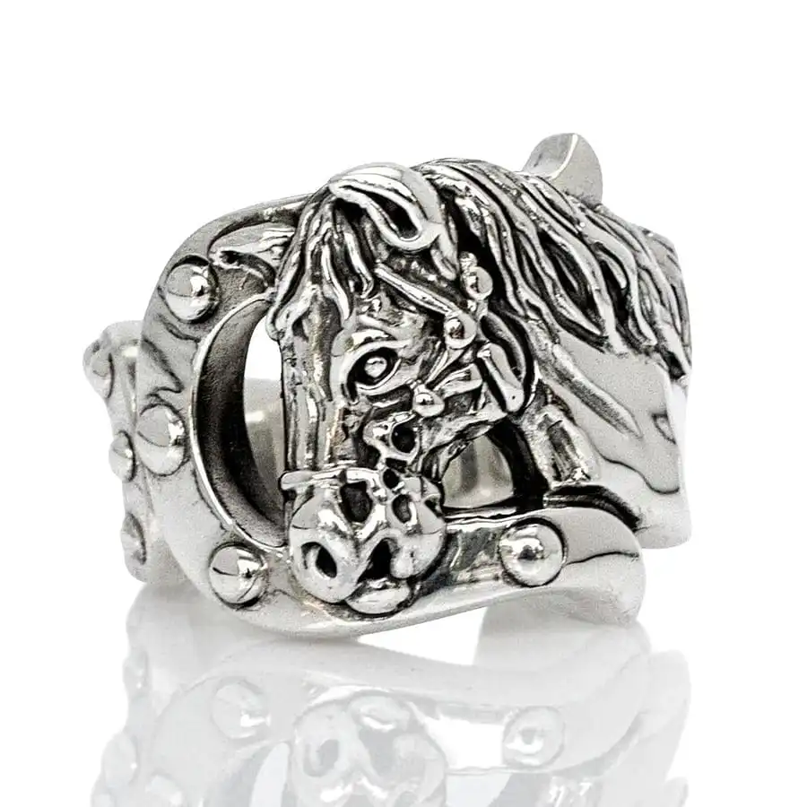 The textured and furred head of a proud horse, complete with flowing mane and headwear stares out. Adding to its beauty, the curved bar of a horses shoe moulds around the finger – adding detail at every single angle. A piece that embodies enough skill and unique charm to capture the eye of everyone.