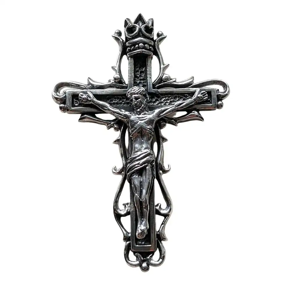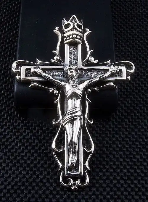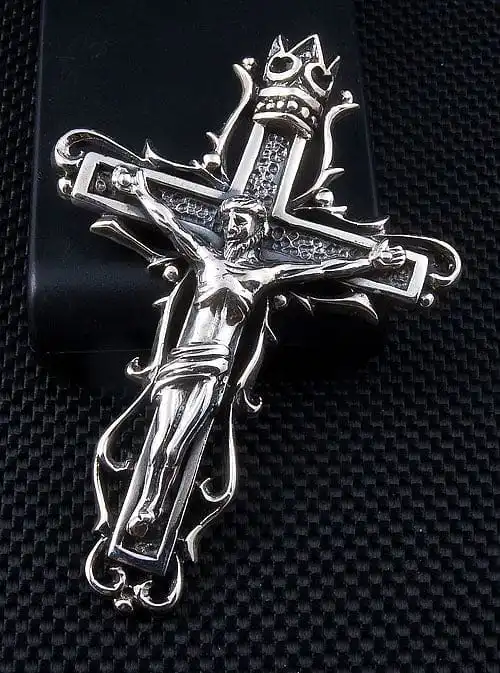 Christian crucifixes are normally deprived of ornamentation. This crucifix is different. The figure of Christ stands alongside plant patterns and a crown atop the cross. The floral pattern refers to blackthorn, which is metaphorically used to depict the devastating consequences of the Judgment Day when a beautiful and fruitful land turns into a desert. The crown, as an attribute of a martyr, means victory over sin and death. As you can see, the whole piece is bristling with Christian symbolism, which makes it a good choice for a believer. But if you’re only looking for an original and edgy accessory, it will fit the bill as well.We intentionally made this pendant larger-than-life and heavy to please Gothic and biker enthusiasts as well as bold fashionistas. Like any other item in Bikerringshop inventory, it shows off lots of character and individuality. No wonder, we made this pendant by hand to preserve the touch of individuality in it.