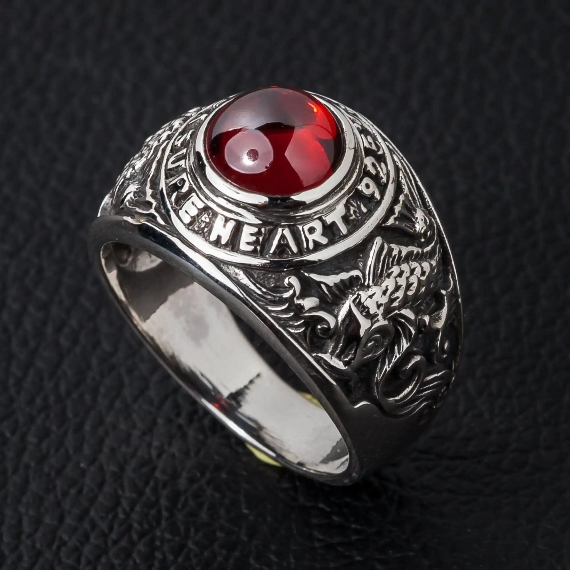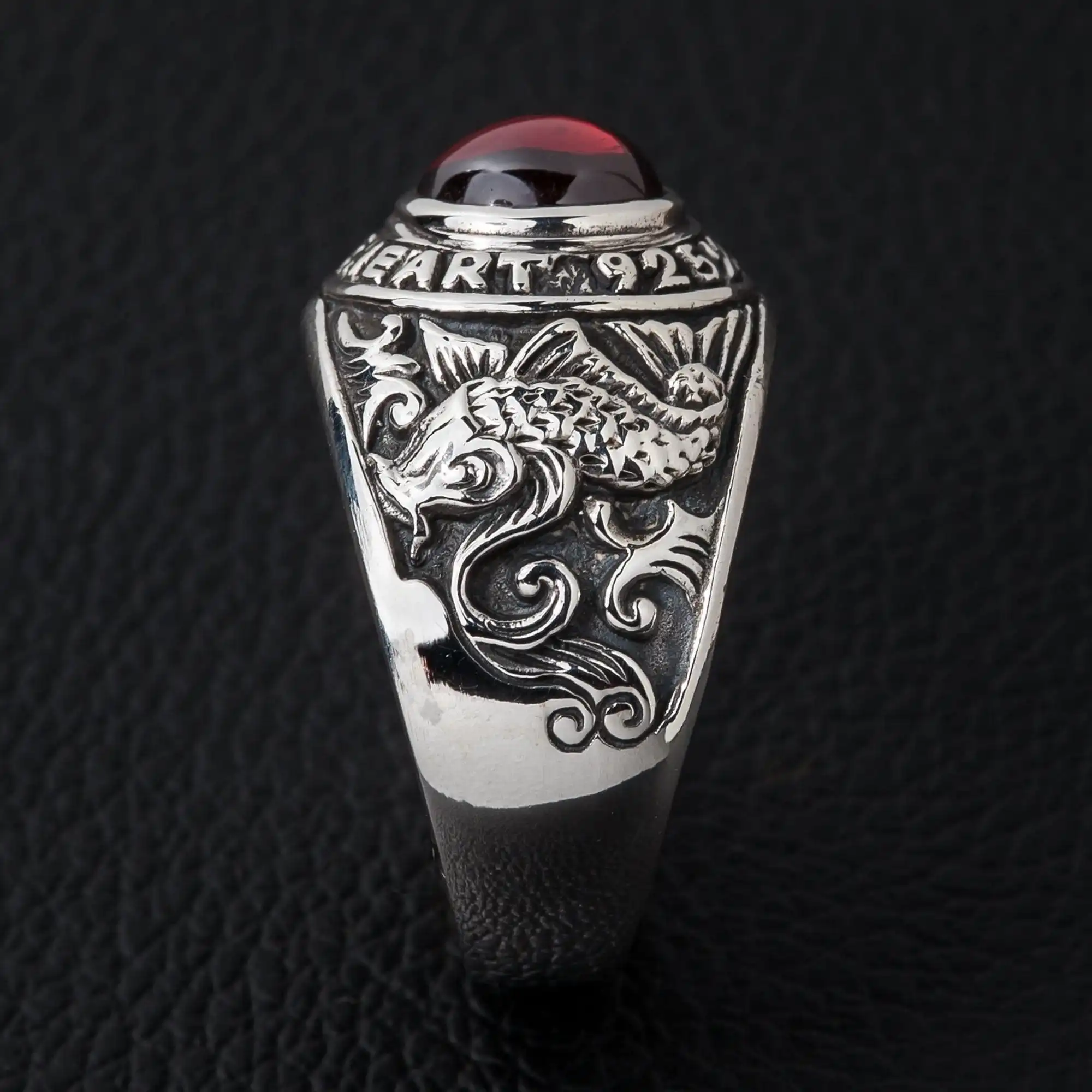 This mesmerizing piece of jewelry allows you to command a room without much effort. It is thanks to its massive size, a bold gem in the center, and overall masculine vibe. Those who dare to come closer will notice two beautiful Koi Carps on both sides from the centerpiece. In Japan, these fish are loved and admired for their persistence, determination, and never-give-up attitude. They became a symbol of hardy and confident men who boldly peruse their goals. On top of that, a pair of colorful fish symbolizes family ties, affinity, fidelity, and loyalty. So, if you want to choose this ring as your make-a-statement accessory, it will convey a bunch of beautiful meanings.Like any other item in our jewelry collection, we made this piece by hand because we believe that every person deserves a personal touch. Besides, it helps us to maintain the highest standards regarding the look and quality. We crafted this ring from 925 sterling silver, and it boldly declares it. Look at the wording around the gem’s bezel, the first thing you’ll notice is 925 alongside the Treasure Heart inscription. To help all the design elements stand out, we oxidized the recessed areas of the ring.