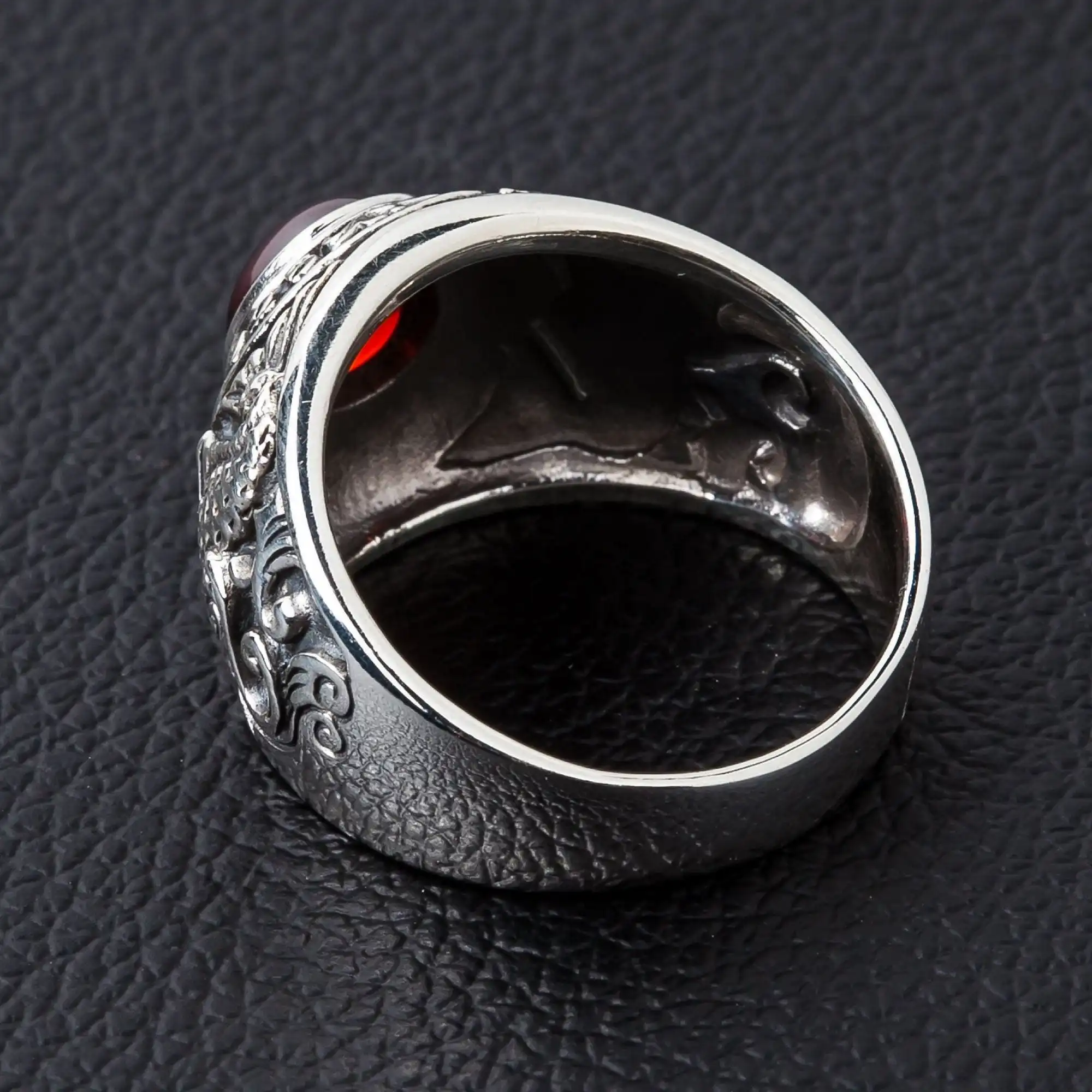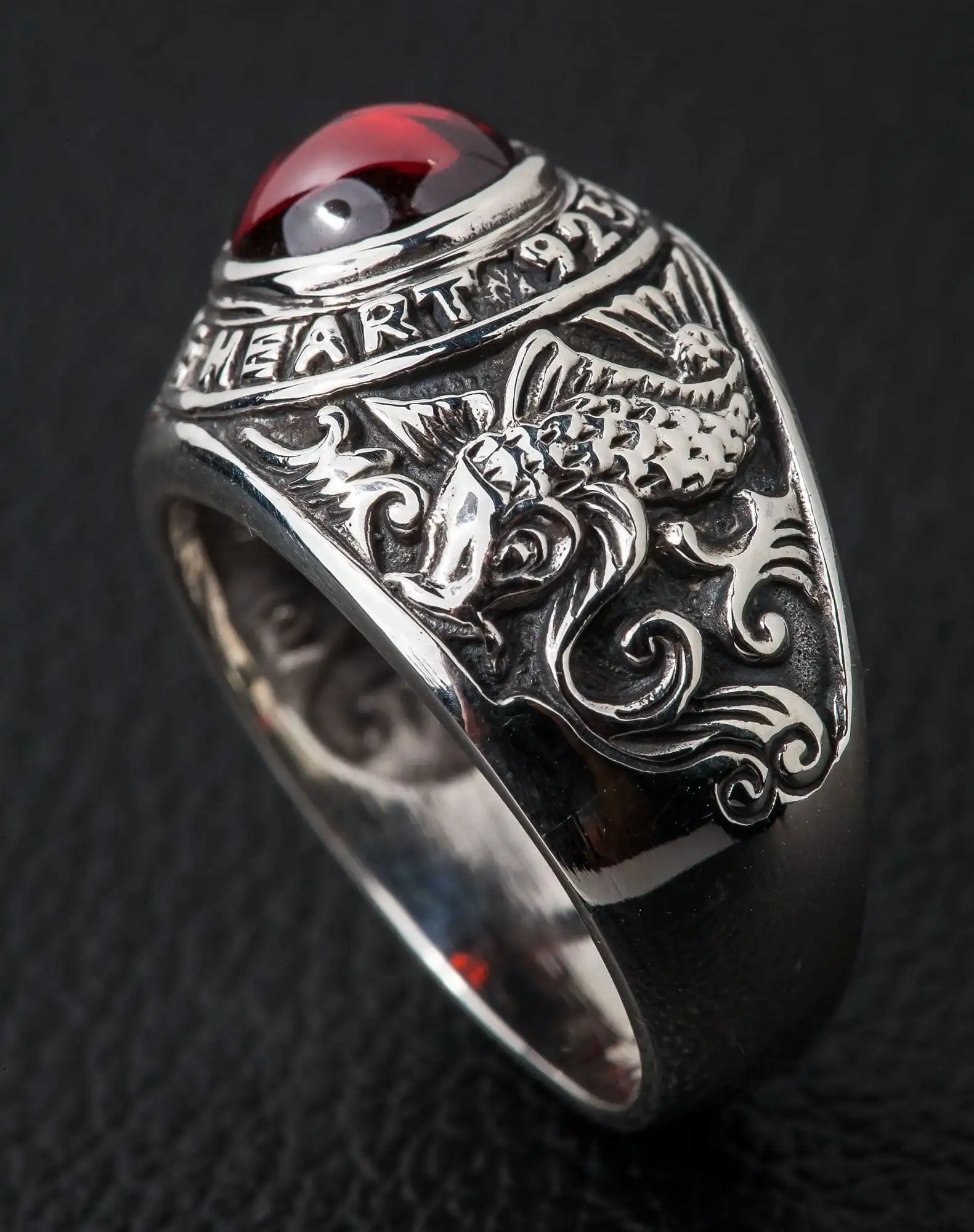 If you want something a little more elegant and less typical for your next biker ring then this piece wouldn’t come amiss. With a beautifully polished gemstone center and an intricate Koi fish pattern on each side, this Koi Ruby Silver Mens Ring is both bold and elegant.