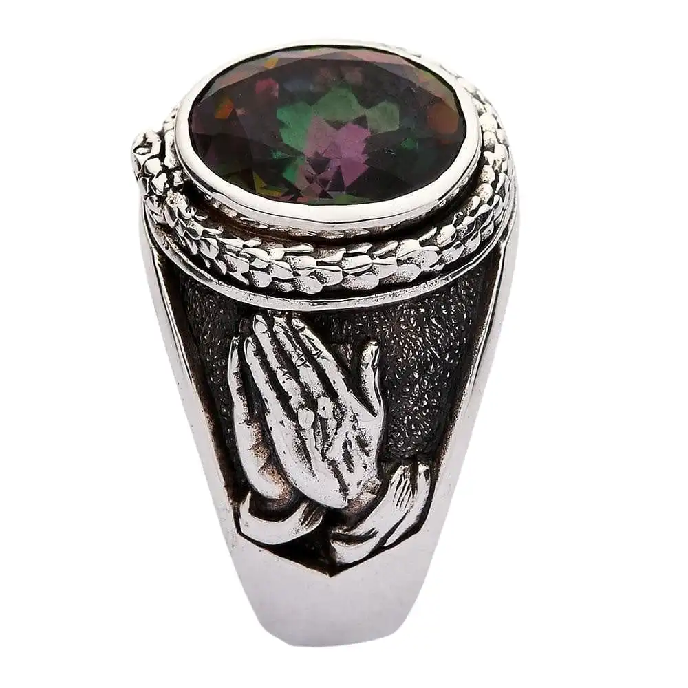 Our Mystic Topaz Praying Hands Gothic Ring provides so many intriguing details to command attention. With a huge iridescent gemstone, colossal size, and commendable symbolism, you will never leave a room unnoticed.