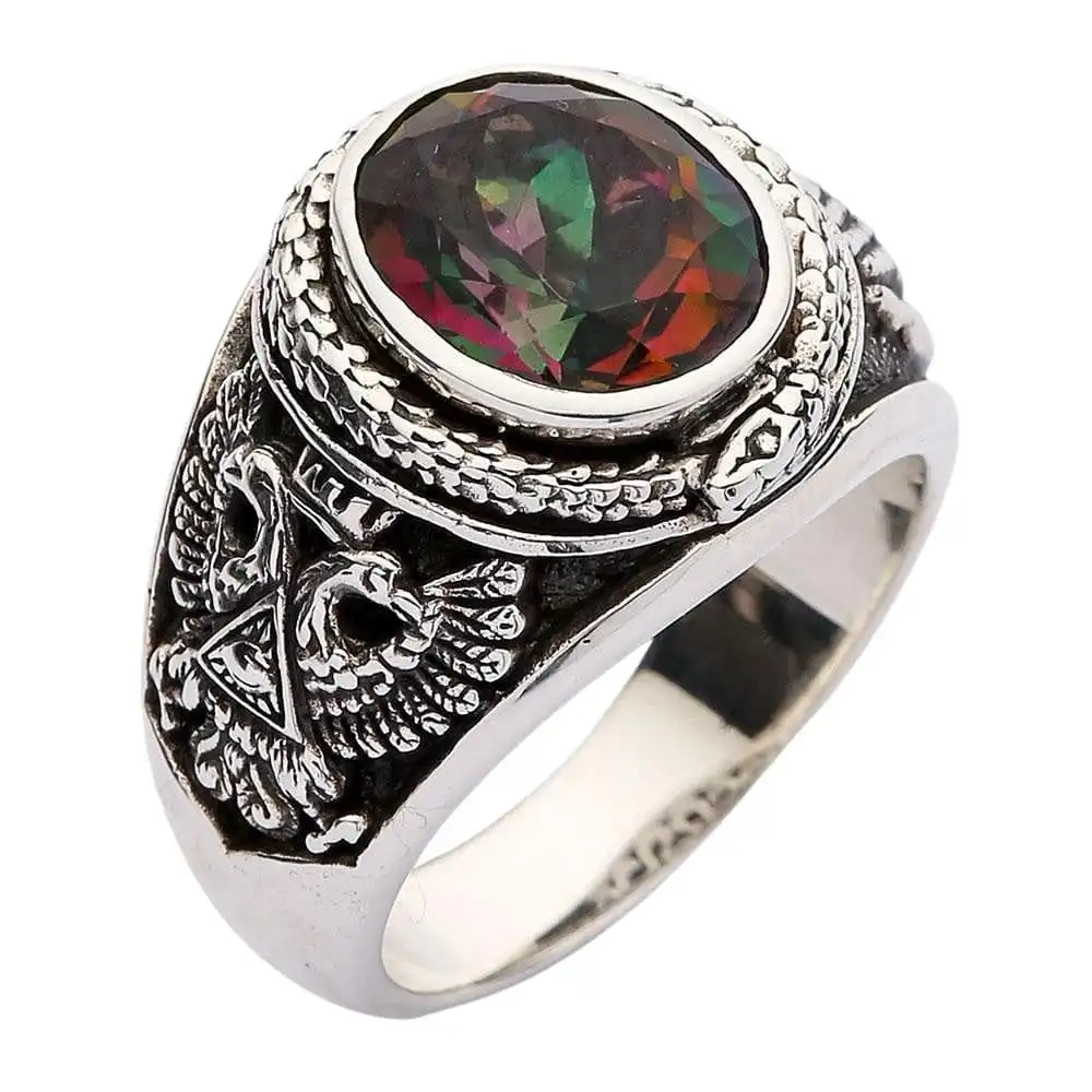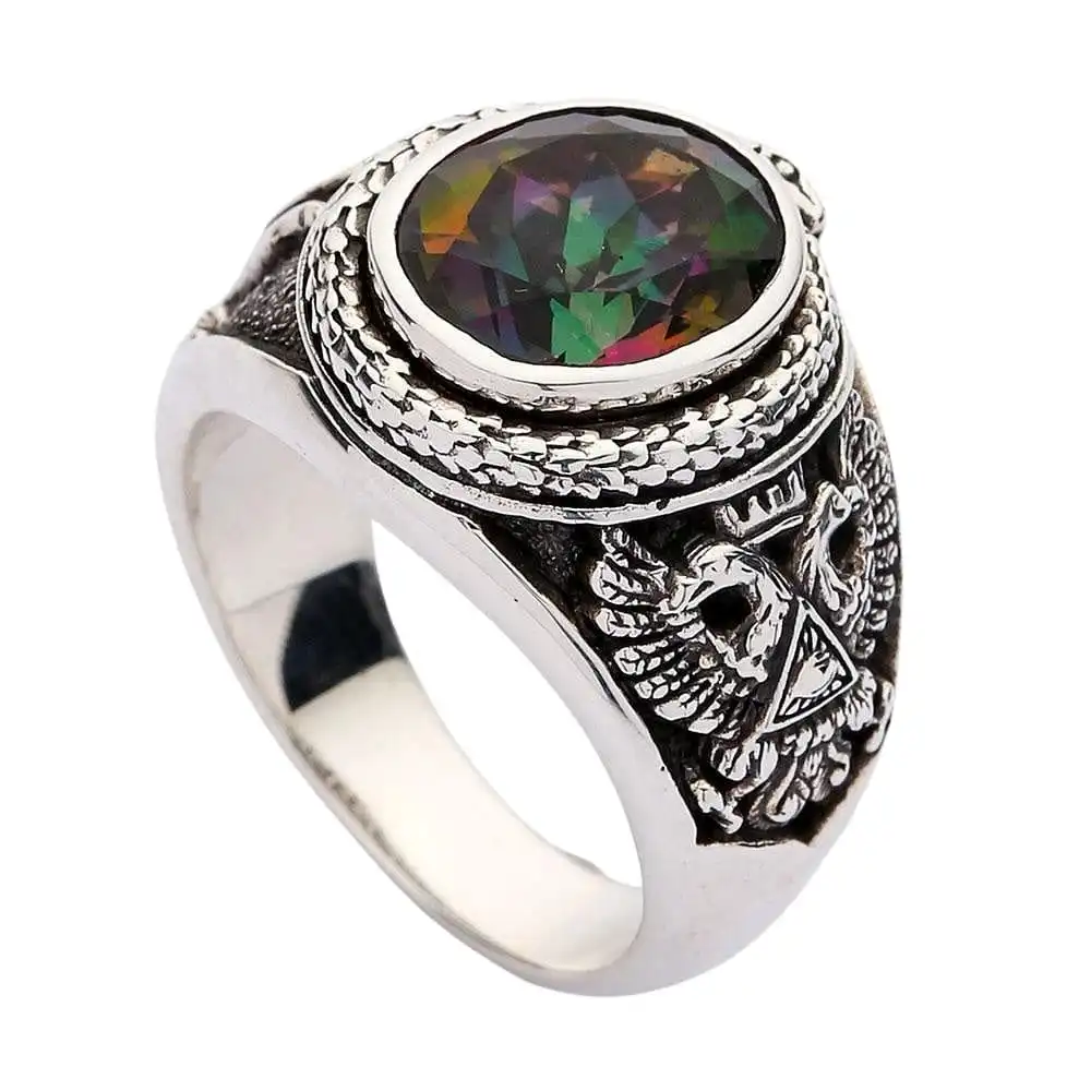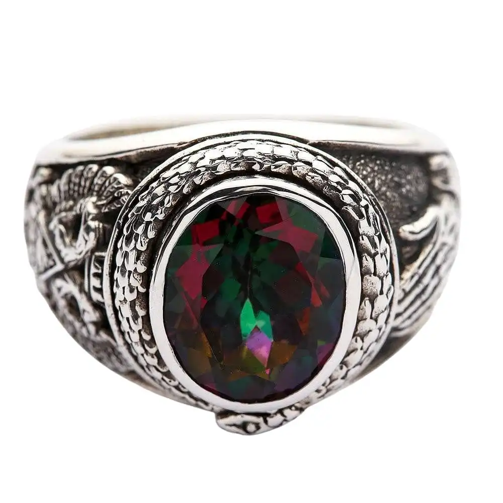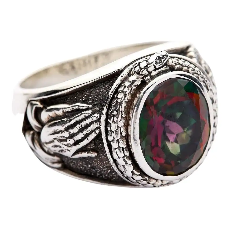 The focal point of this piece is a sublime mystic topaz boasting red and green sparkles. This is a genuine topaz stone treated with high temperature to acquire this dazzling rainbow color effect. This beautiful gem is mounted into a frame of sterling silver with a three-dimensional snake scale pattern around the bezel, polished shank, and two raised designs sitting on both sides of the setting. One of them is two praying hands, and the other is a two-headed eagle completed with the symbol of the crown and the all-seeing eye.The ring’s dome design and the sparkling stone are ideal to draw attention to your persona. Its Gothic vibe adds a sense of mystery and charisma while tough and beautiful sterling silver gives hope for longevity and endurance. We always craft our jewelry by hand, and this topaz ring is no different from others.