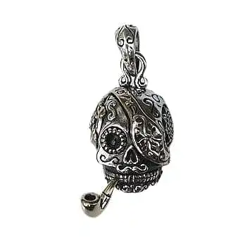 This artist pirate skull pendant has been inspired by the Steampunk genre. One of the skulls eye sockets has been covered by a decorative eye patch, a true pirate in the making. Coming out of its mouth is a gentleman pipe, showing his sophisticated side.