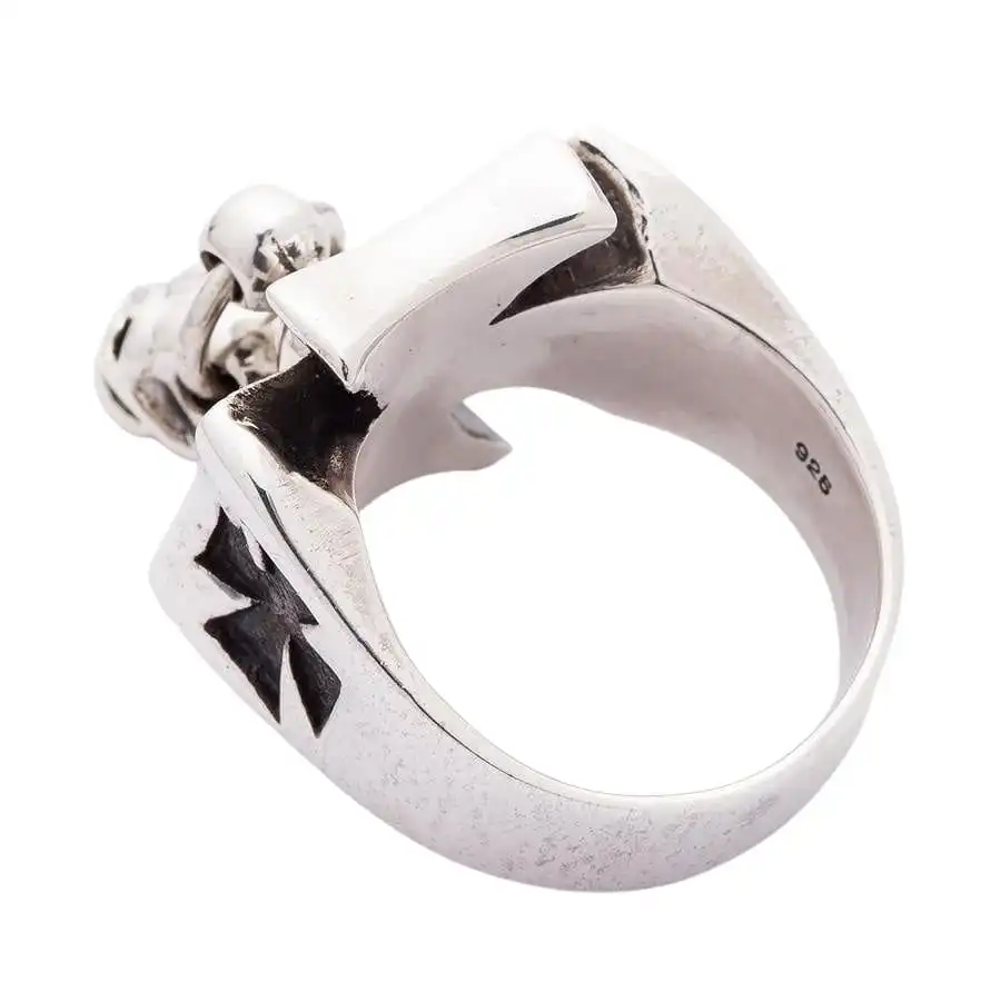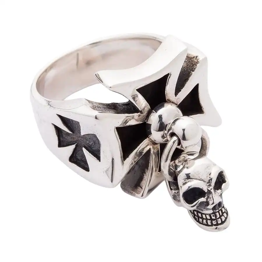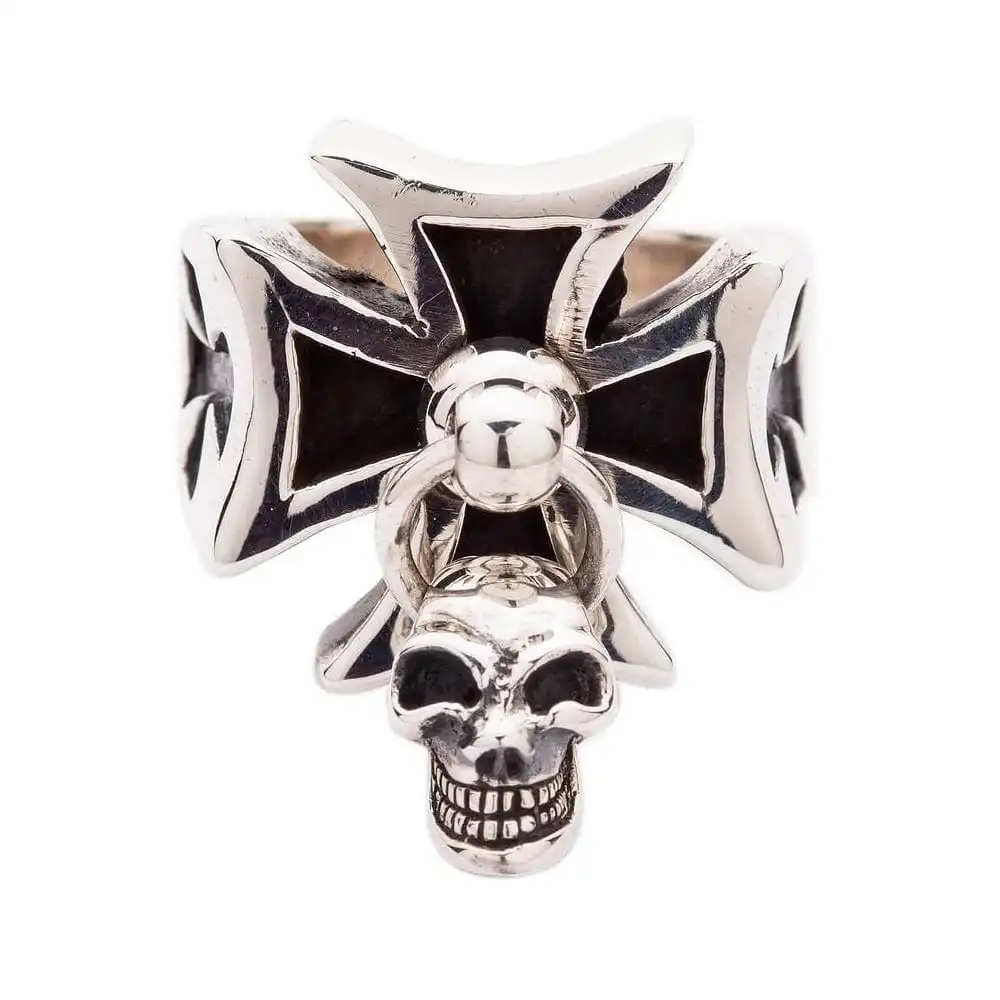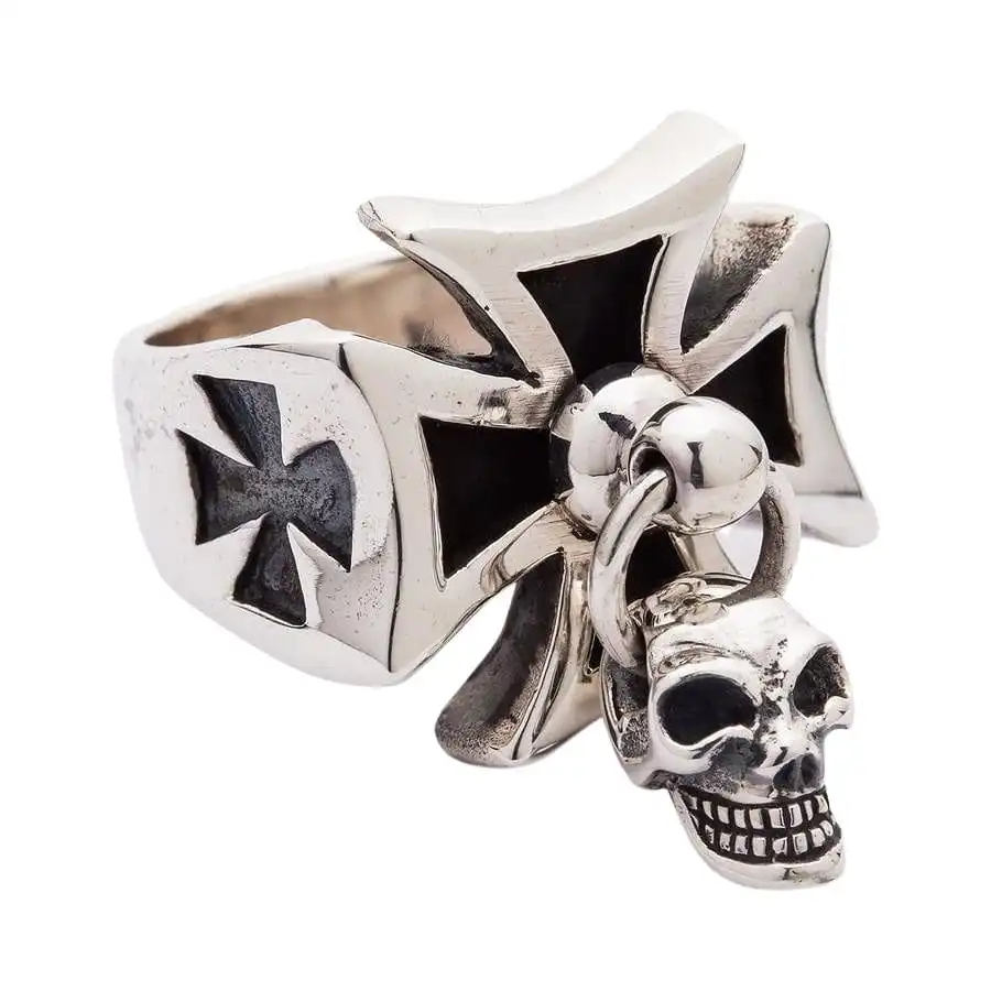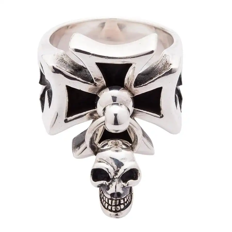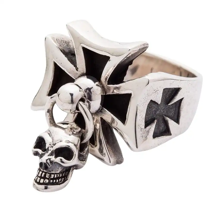 Be fierce and bold with this iron chopper cross and punk ring, with 100% sterling silver dangle skull attached. The skull gives this ring an added, creative element.