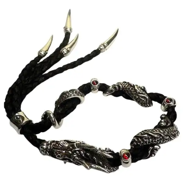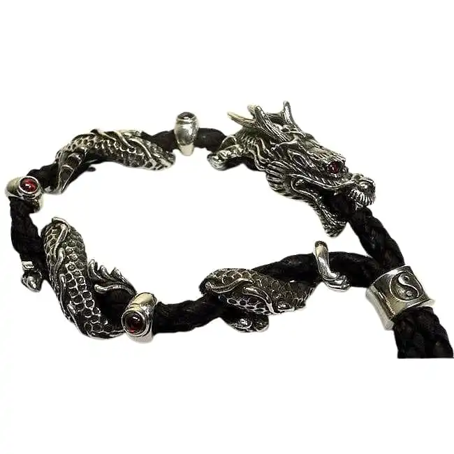 RED EYES DRAGON GENUINE LEATHER BRAID & STERLING SILVER BRACELET ~NEW