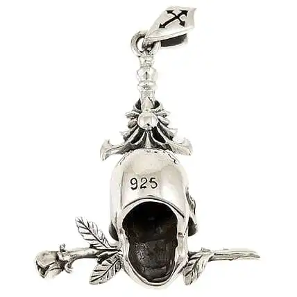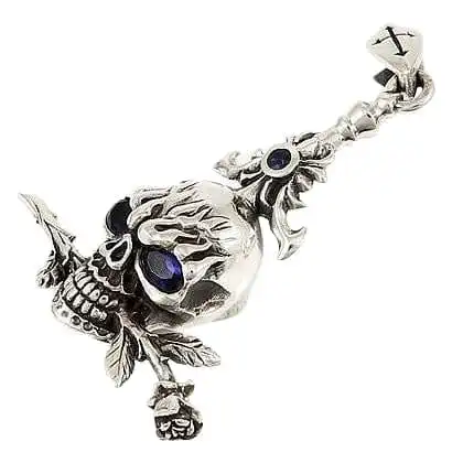 TATTOO SKULL & ROSE SAPPHIRE EYES MEN’S STERLING SILVER PENDANT ~NEW