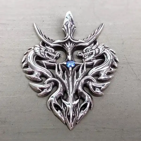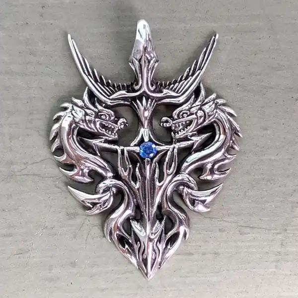 Even if you don’t believe in any magical stuff, a dragon is simply an attractive symbol. Putting this double dragon pendant on will surely give you the attention you desire. The beauty of the flying creatures is emphasized by the noble sheen of sterling silver as well as a sparkling faceted CZ stone of deep blue color. We made this piece by hand because you’re worth the best quality and a personal touch.