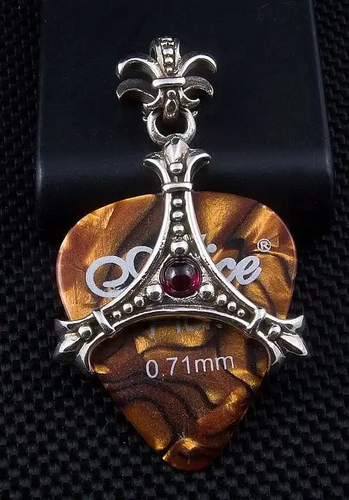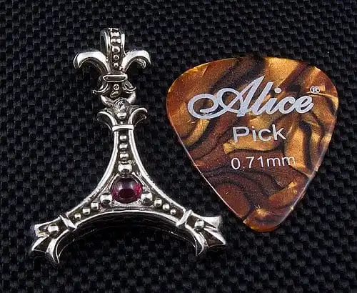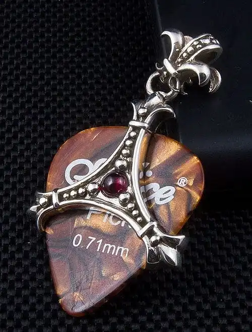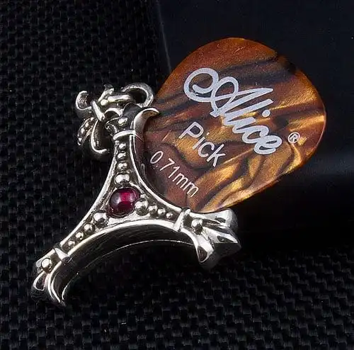 An appealing accessory and serves a useful function. In the centre of the pick holder pendant is a Ruby Red stone, which will grab anyone’s attention.