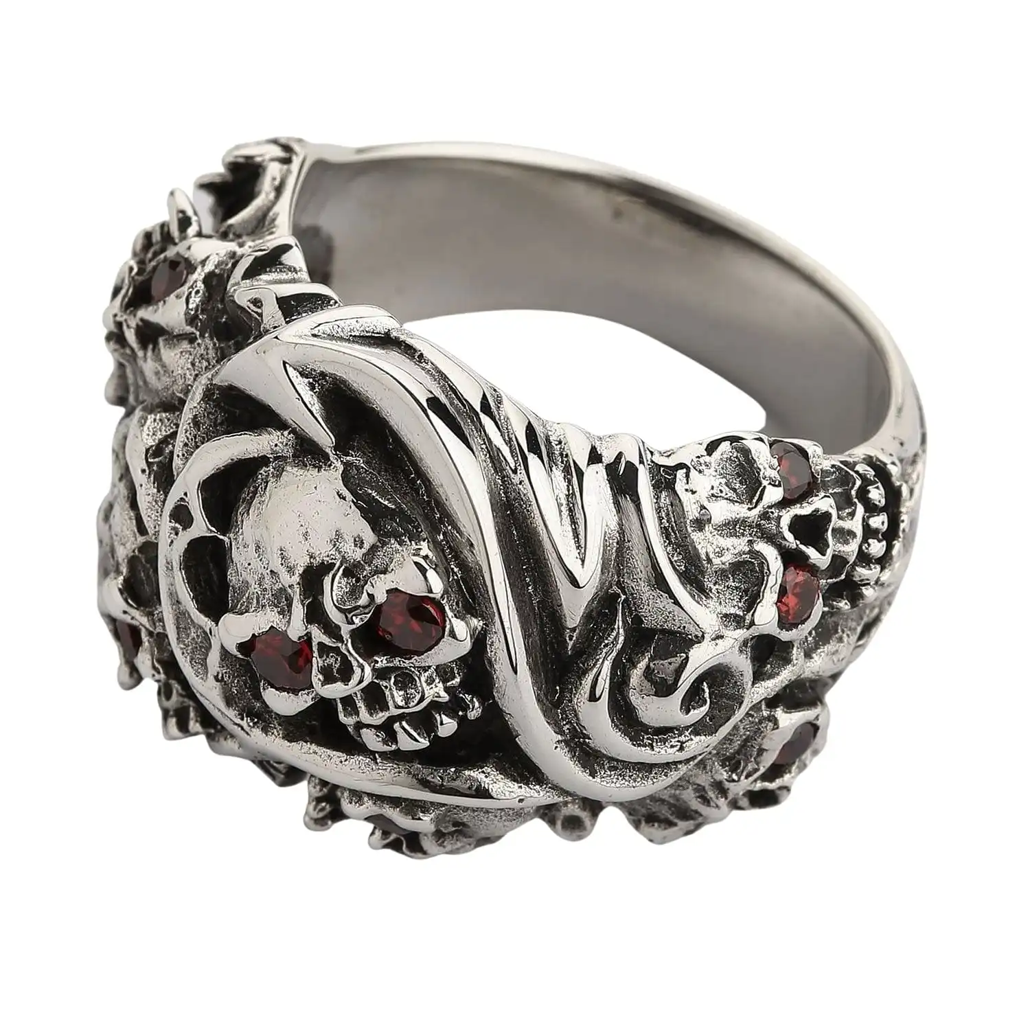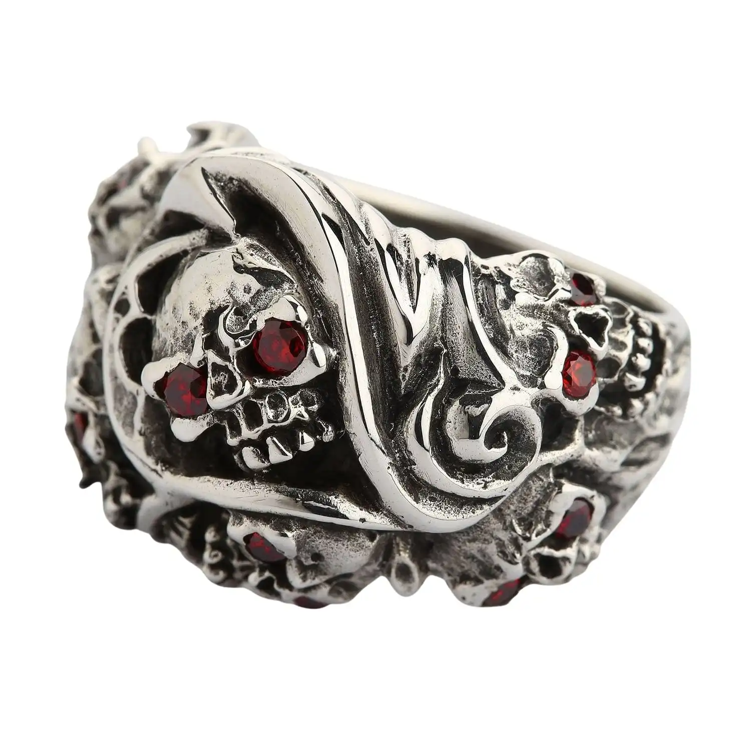 You will hardly find a ring skullier than this one. With so many demonic skulls, this ring will speak of your passion without any words. Silver Red Eyes Inferno Skull Rings by Bikerringshop are designed for audacious fashionistas who don’t mind extra attention to their persona.
