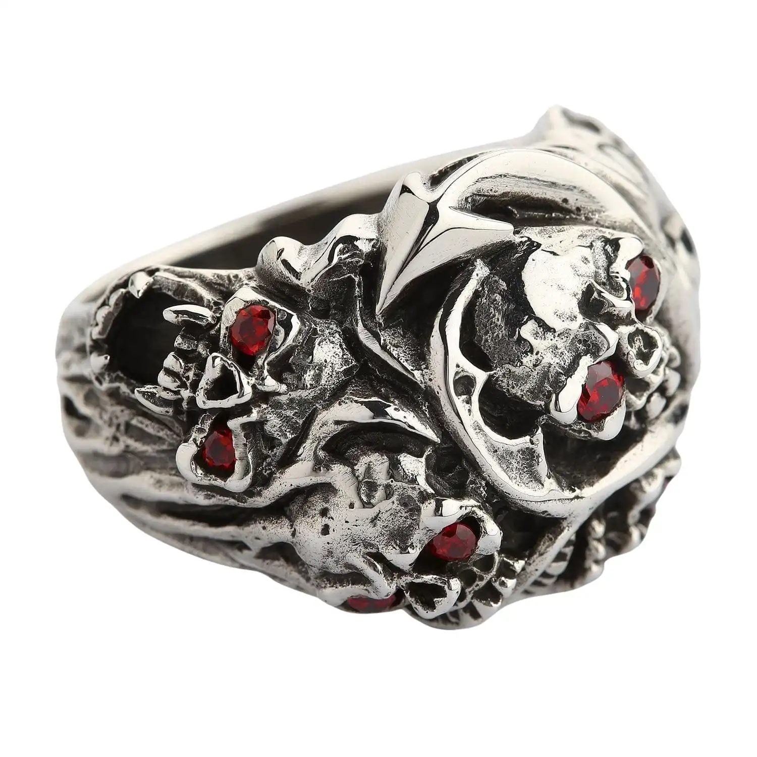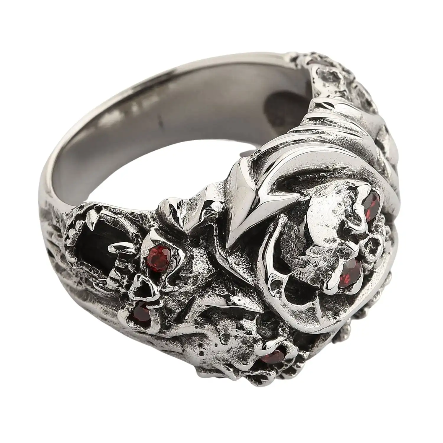 This skull ring came straight from hell. A clique of fierce skulls is proof of that. You can see in their fanged grins, horns, and pointed tails that they are of a demonic race. But don’t worry, if you treat your skulls with respect, they are no harm to you. On the contrary, they are a powerful talisman that ensures protection against death. For this reason, this ring is an excellent accessory for bikers and everyone who believes in the supernatural powers of skull jewelry.This ring is made of noble sterling silver. We polished some of its raised parts while leaving recessed ones rough and darkened to emphasize its ruggedness. Red CZ stones in skulls’ eyes add the arresting quality and enrich this piece with radiance. We craft our products by hand to preserve a touch of individuality in every piece you buy.