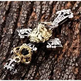 Masculine with a touch of luxury, our Royal Crown Lion Cross Pendant will impress every acquaintance. Designed for the modern man, it merges a universal symbol of strength with that of Christian faith. The ornate cross plays host to a majestic lion head, completed with a multicoloured encrusted open circle within its teeth. And, for an added touch of regality, the entire piece is topped with a solid brass 14k gold-plated crown.