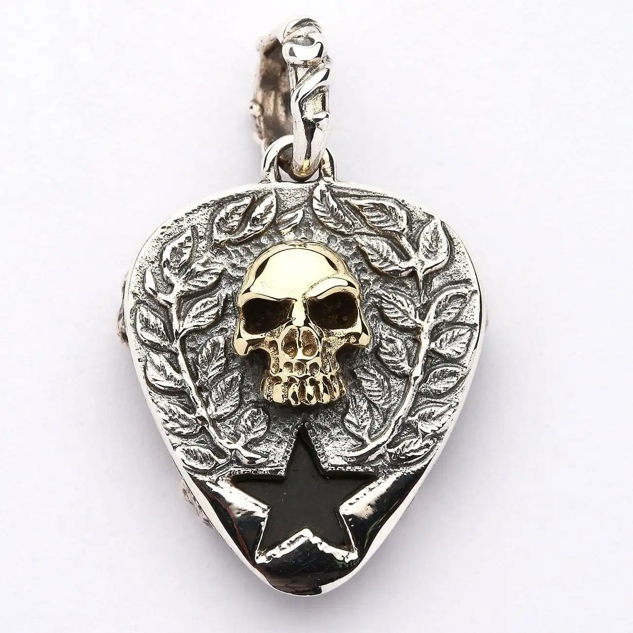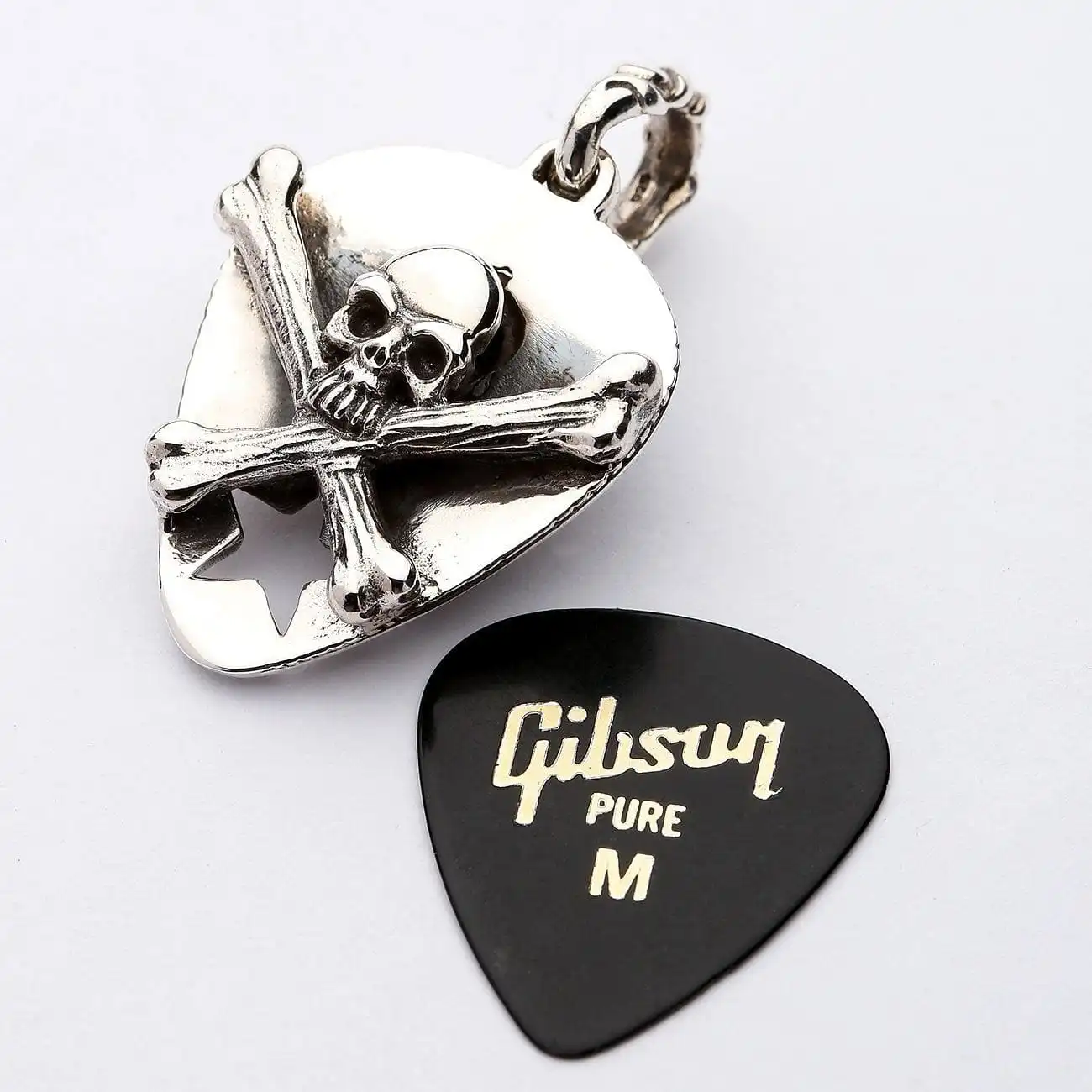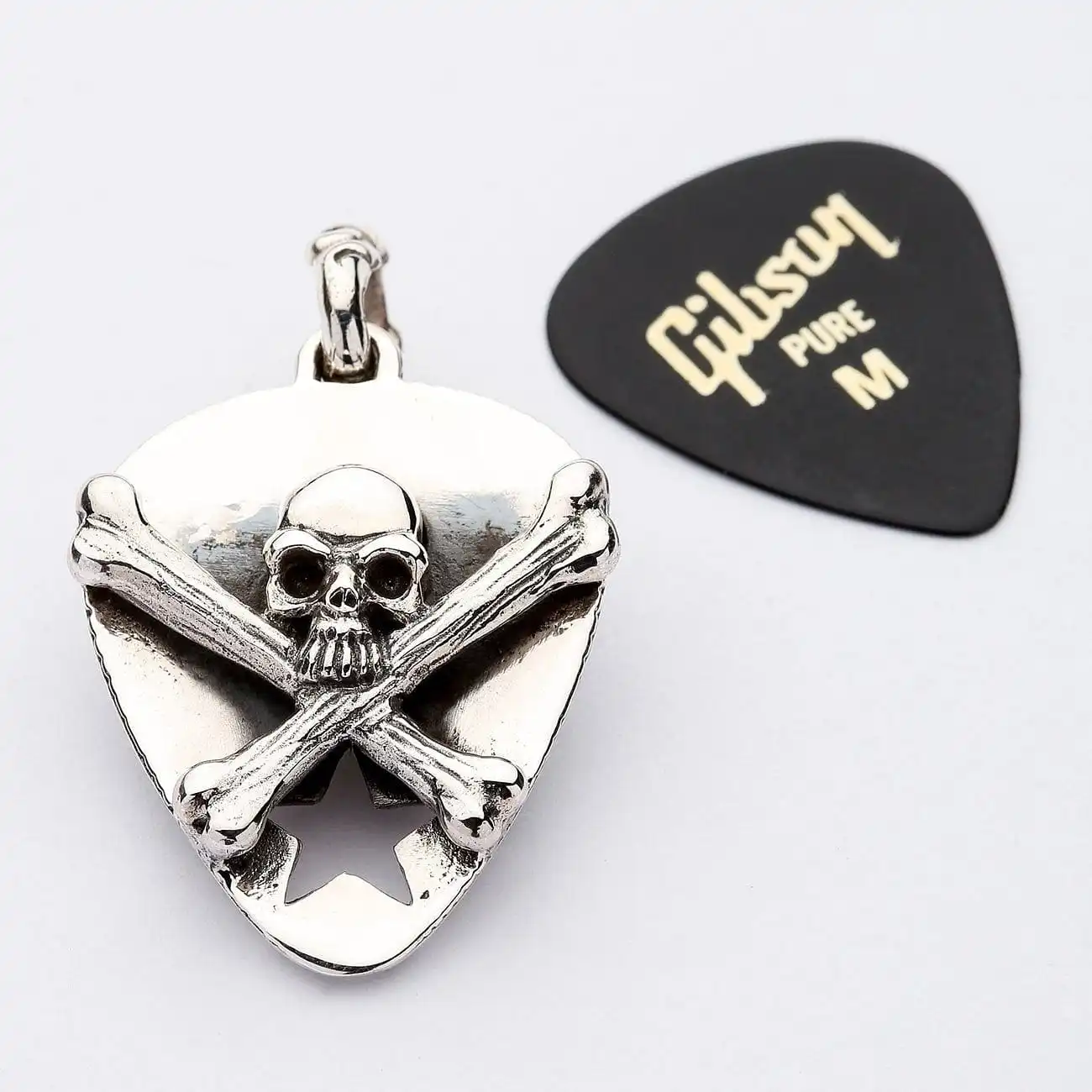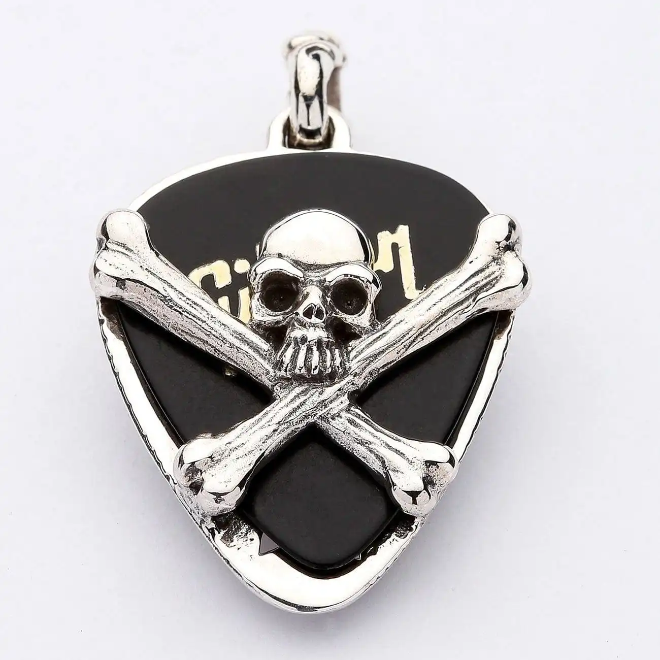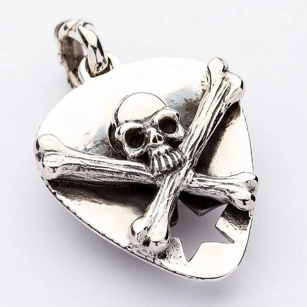 Sterling Silver Skull & Crossbones Guitar Pick Holder Pendant Necklace