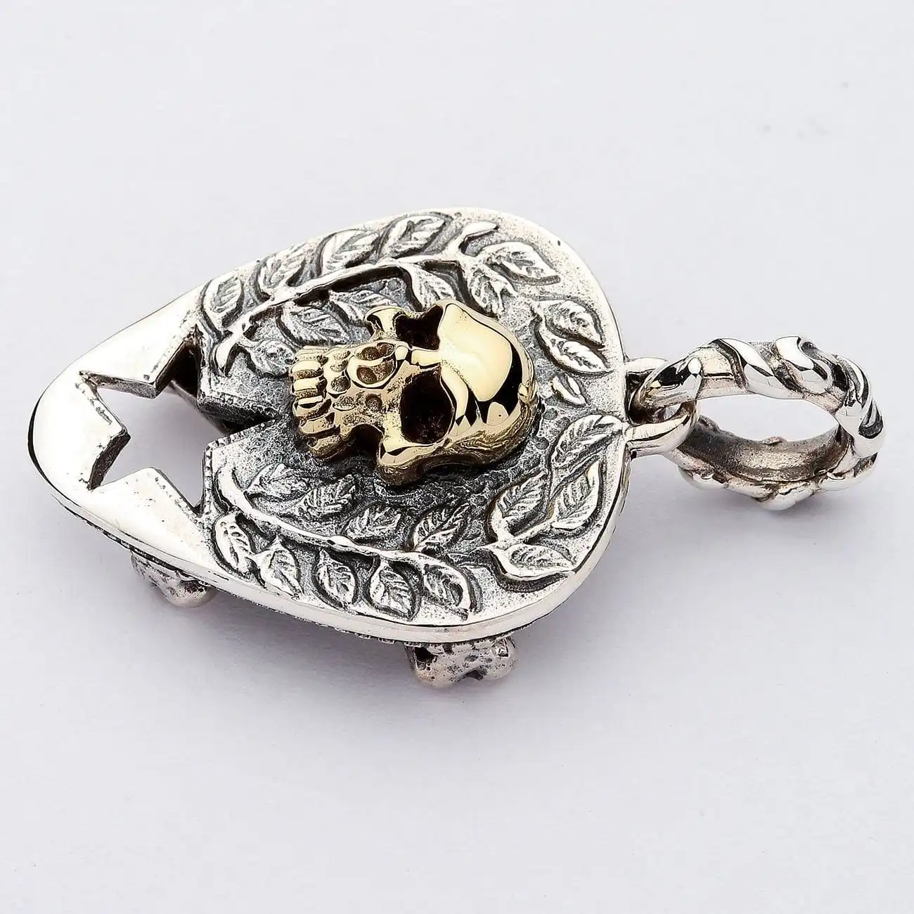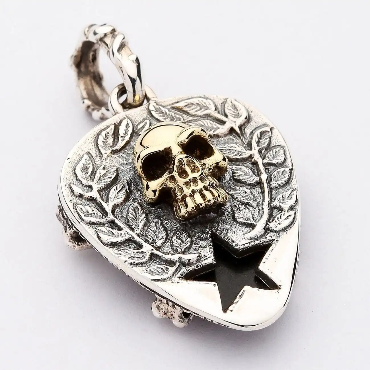 Slightly larger than your average guitar pick, this pendant has been made from the finest sterling sliver, stamped with the 925 mark of quality as proof of this. The skull on the front has been given a gold-plated finish to create an incredible stand-out design. Solid and heavy, it sits upon a thin leather cord chain that won’t distract from the cleverly designed pendant.