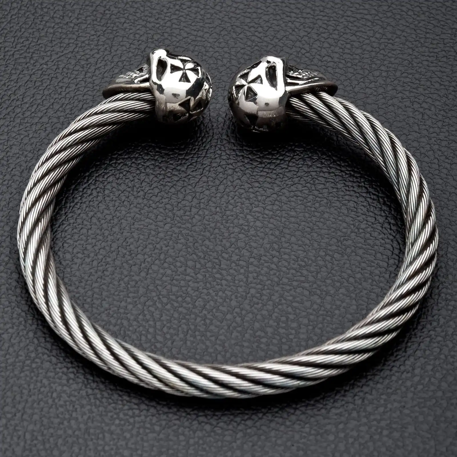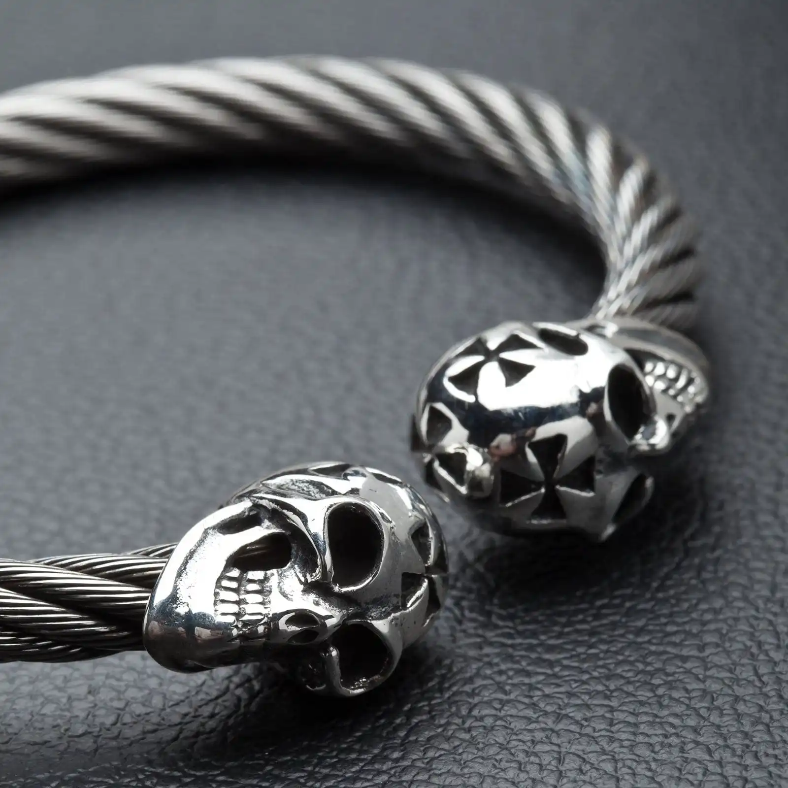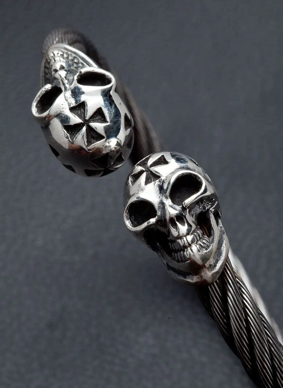 Shopping for bracelets on our site will leave you spoiled for choice as there are so many beautiful and unique designs. This sterling silver cuff bracelet is yet another example of how this kind of jewellery can look stylish and trendy at the same time.With a woven pattern all along, and finishing up with a skull with a cross on each side, it is certainly a very distinctive design. This cuff bracelet has an adjustable size of up to 9 inches and it weighs 50grams.