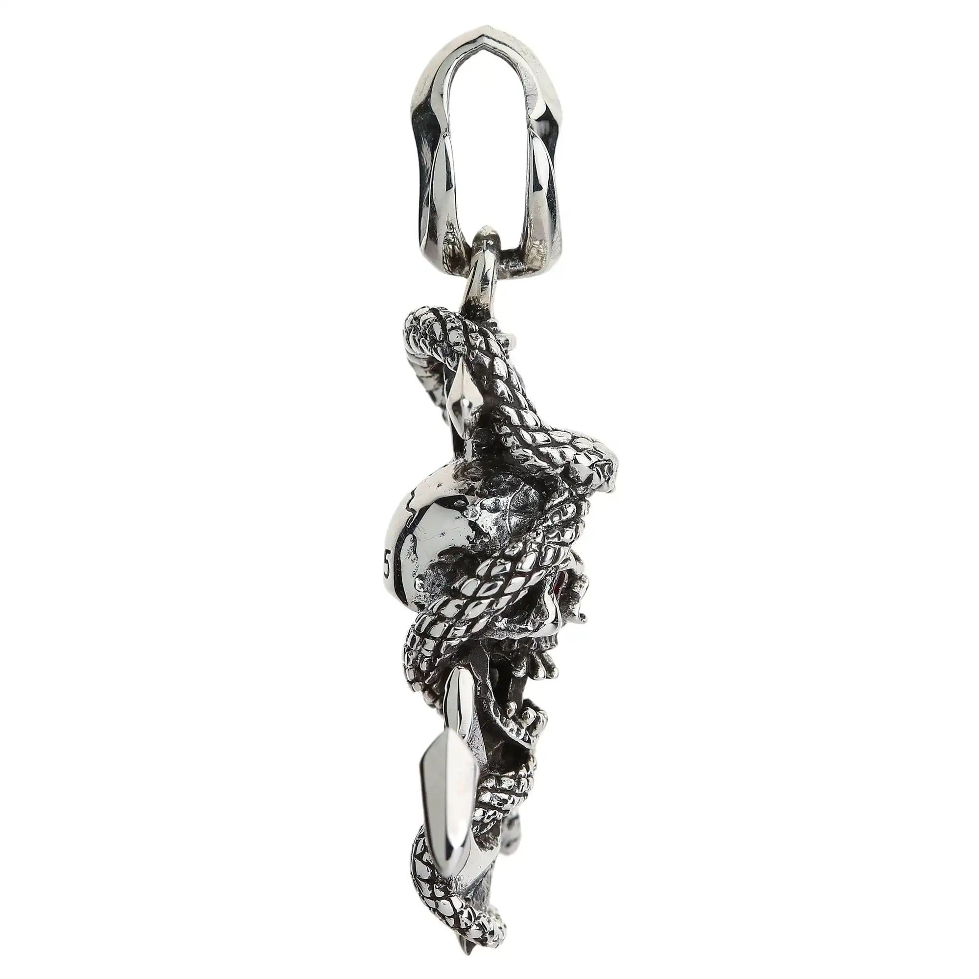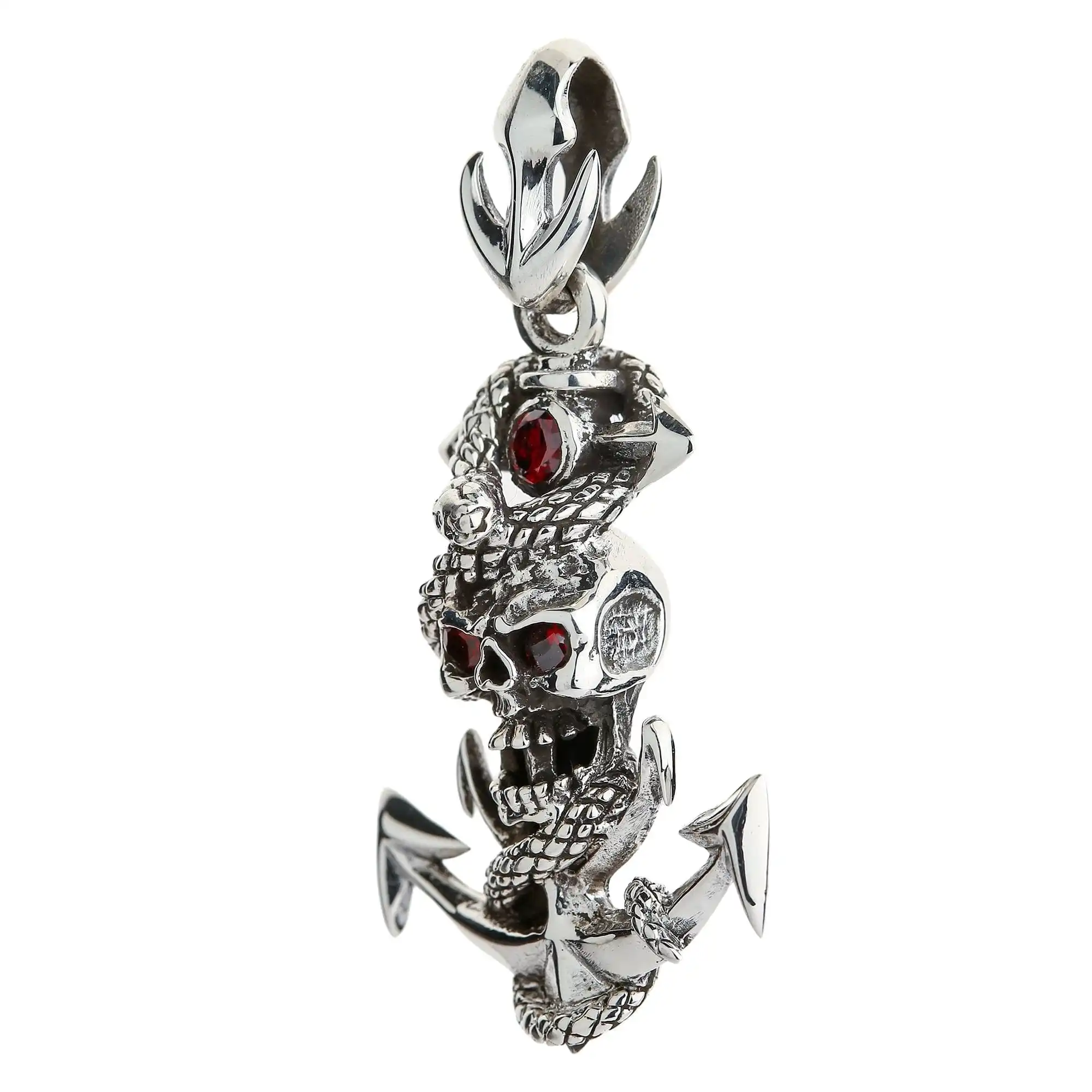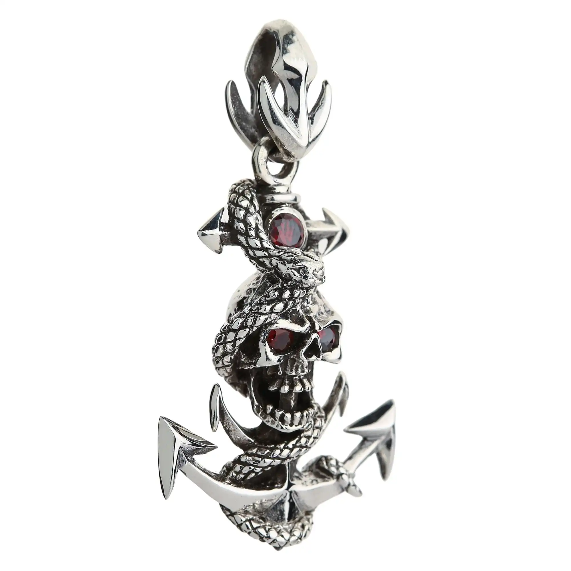 An anchor is a multi-faceted symbol. It represents hope, safety, salvation, strength, caution, luck self-confidence, and many other things. A skull isn’t inferior to an anchor in its significance. This frightening image stands for death and life, intelligence, danger, fraternity … the list can go on and on. And a snake is a symbol of change, resurrection, and health. As you can see, these seemingly repelling images represent very attractive aspects of our life and even beyond our life. Hence, this pendant from Bikerringshop is a great choice for people who believe in the magic of symbols.We cast this imagery in sturdy silver that is said to have supernatural powers on its own. To make it look irresistible, we polished silver to perfection and darkened its grooves and cavities for more definition. Solid metal ensures unbelievable resilience and a pleasant heft on your neck. We also embellished this piece with contrasting CZ stone inlays that help draw looks from near and far.