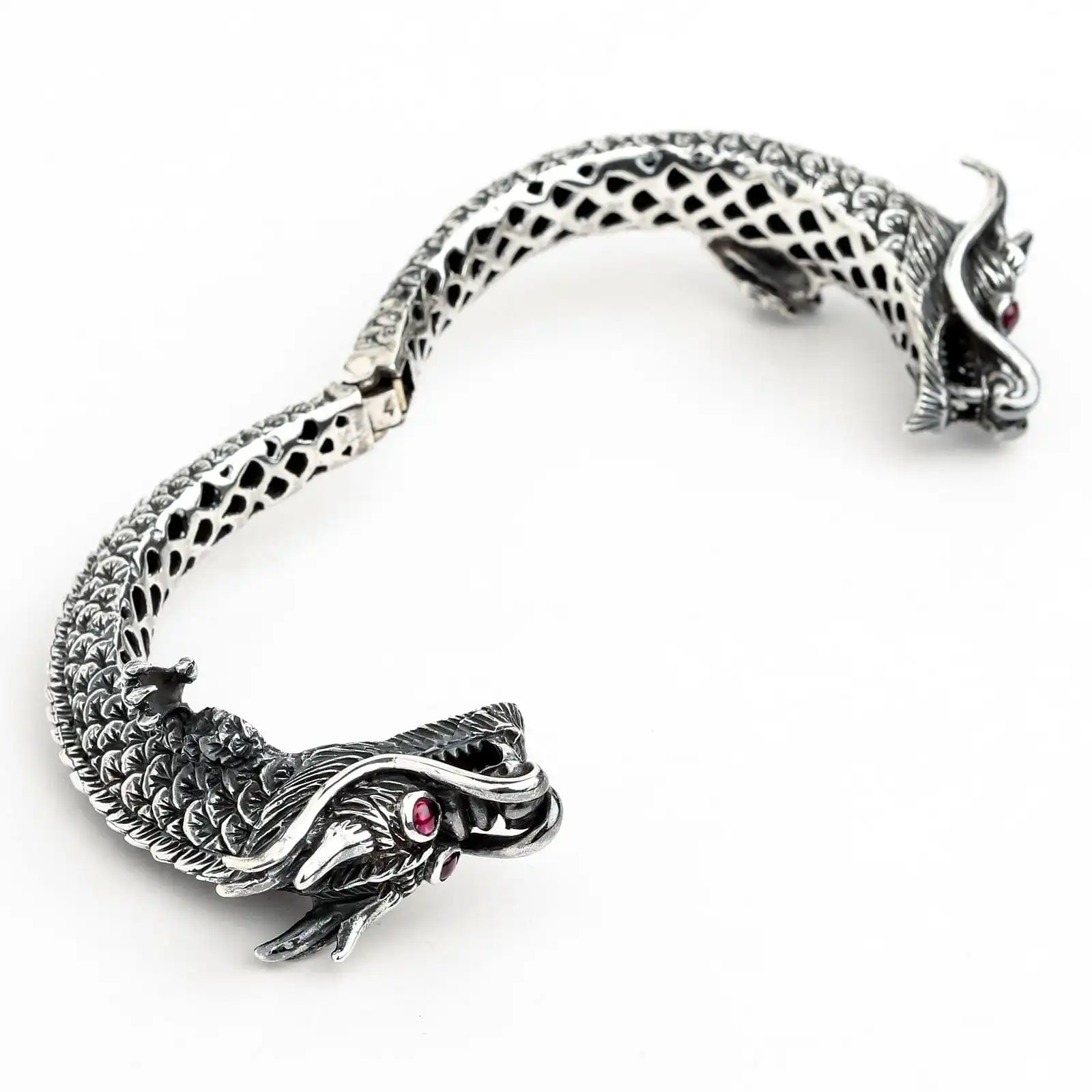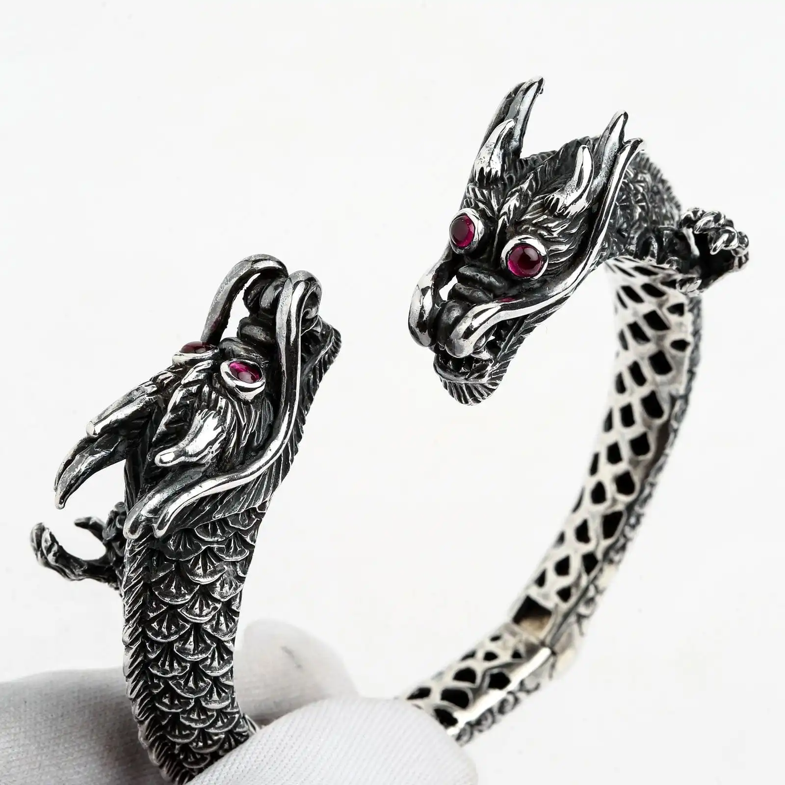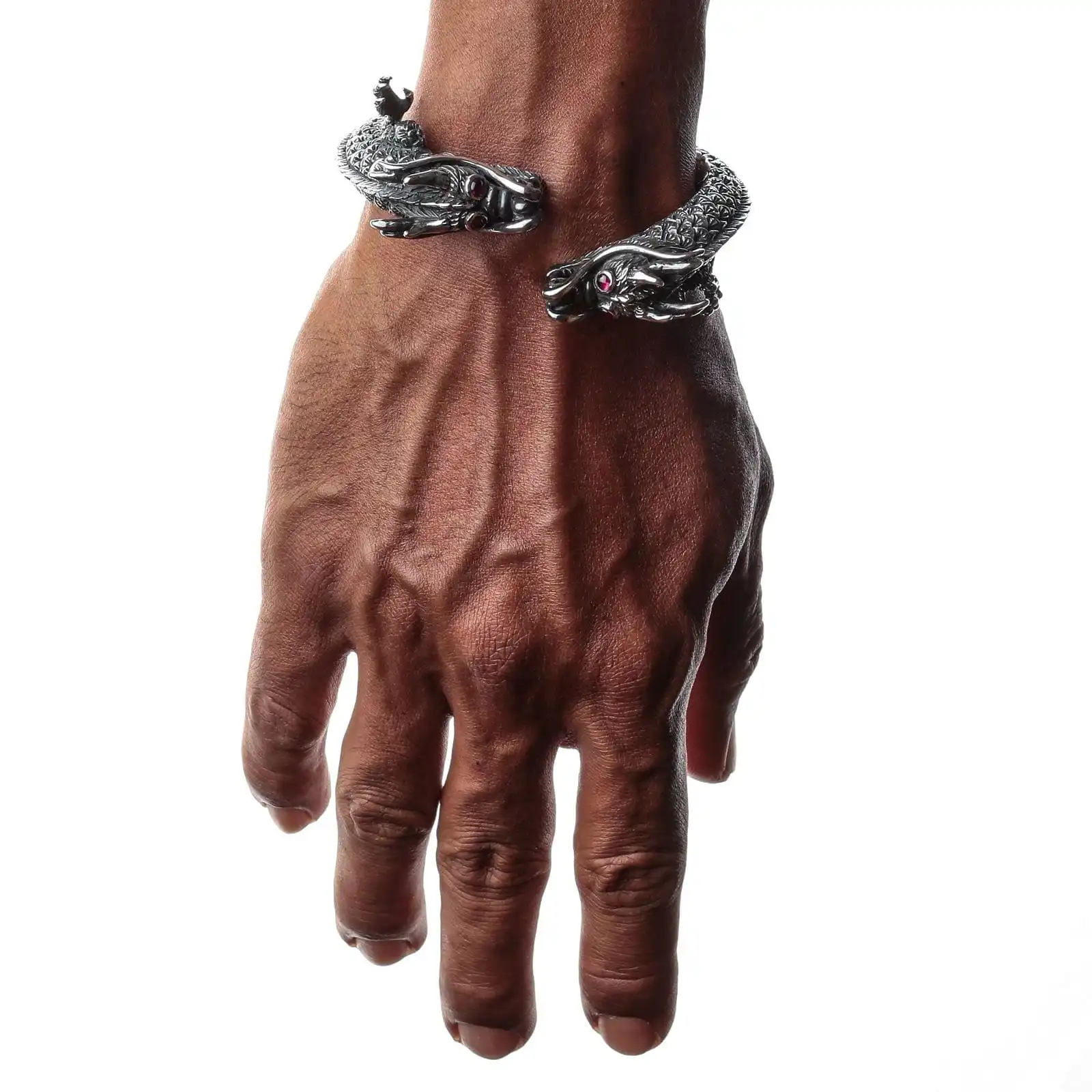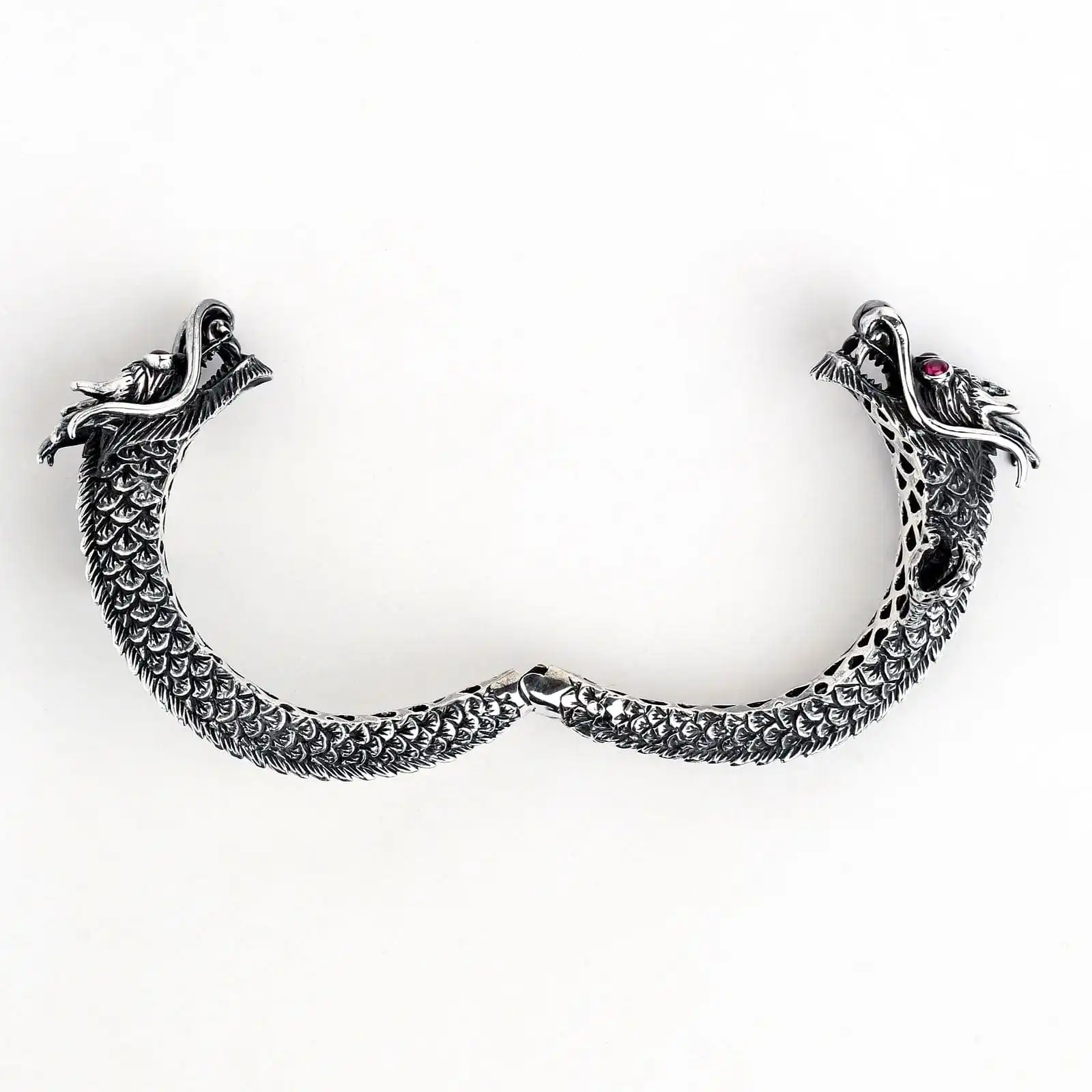 Red Eye Inlaid Sterling Silver Big Dragon Men’s Cuff Bracelet