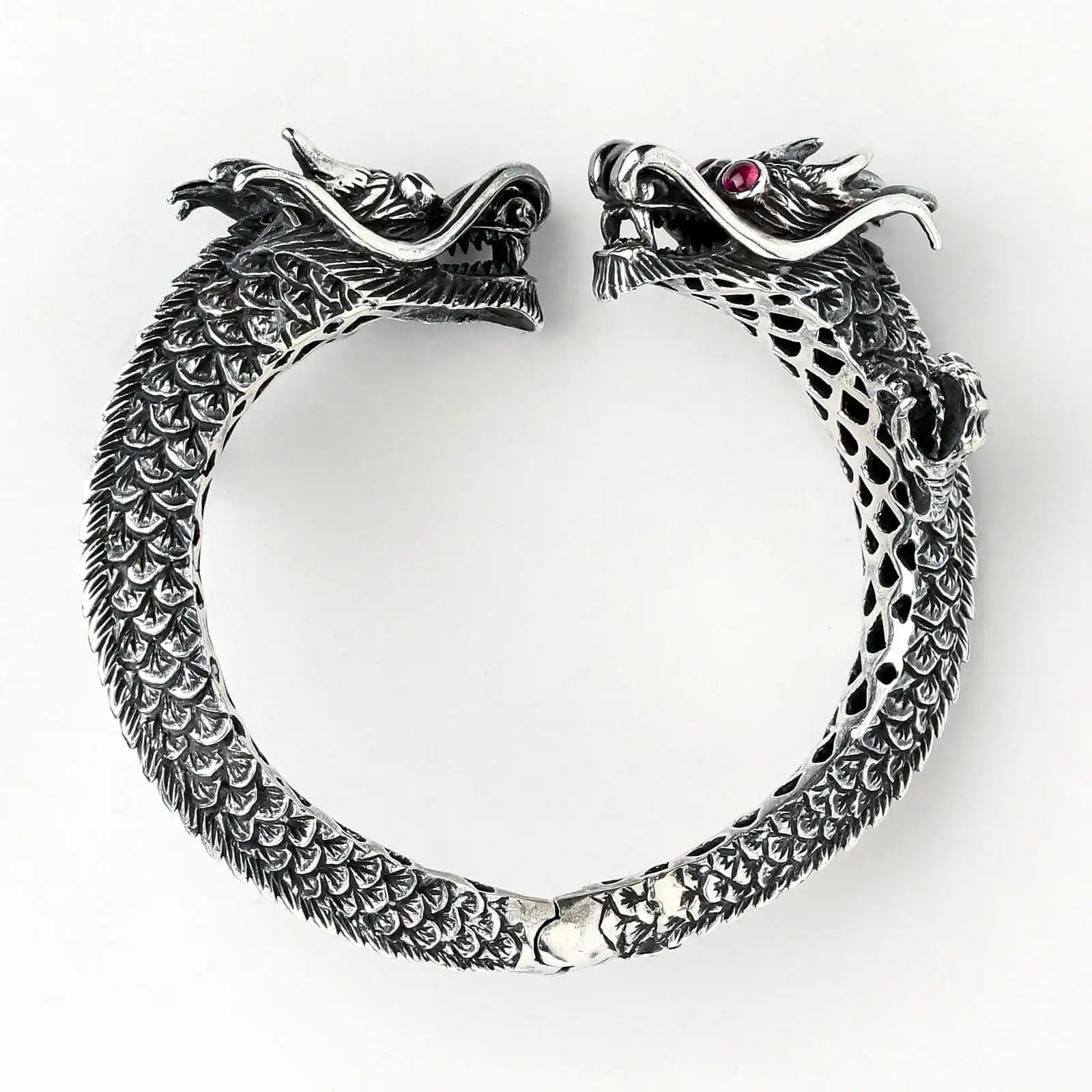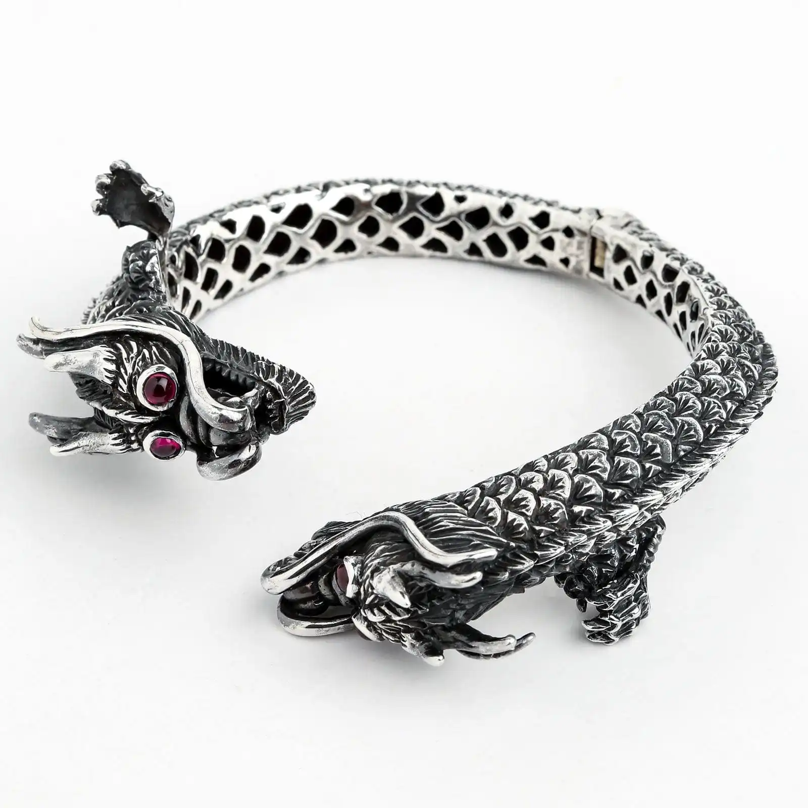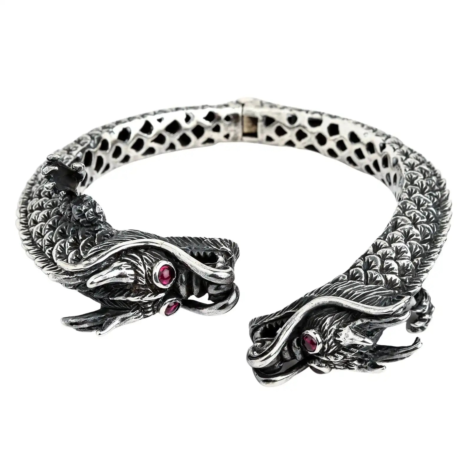 This cuff bracelet has not one but two guardian dragons. We crafted them with the utmost attention to detail – their bearded muzzles, horns, and scales are carefully cast in the precious white metal. As an extra touch, we incorporated red stone inlays that represent the dragon’s eyes. Not only do they add a pop of color but also complement the delicate sheen of polished sterling silver.