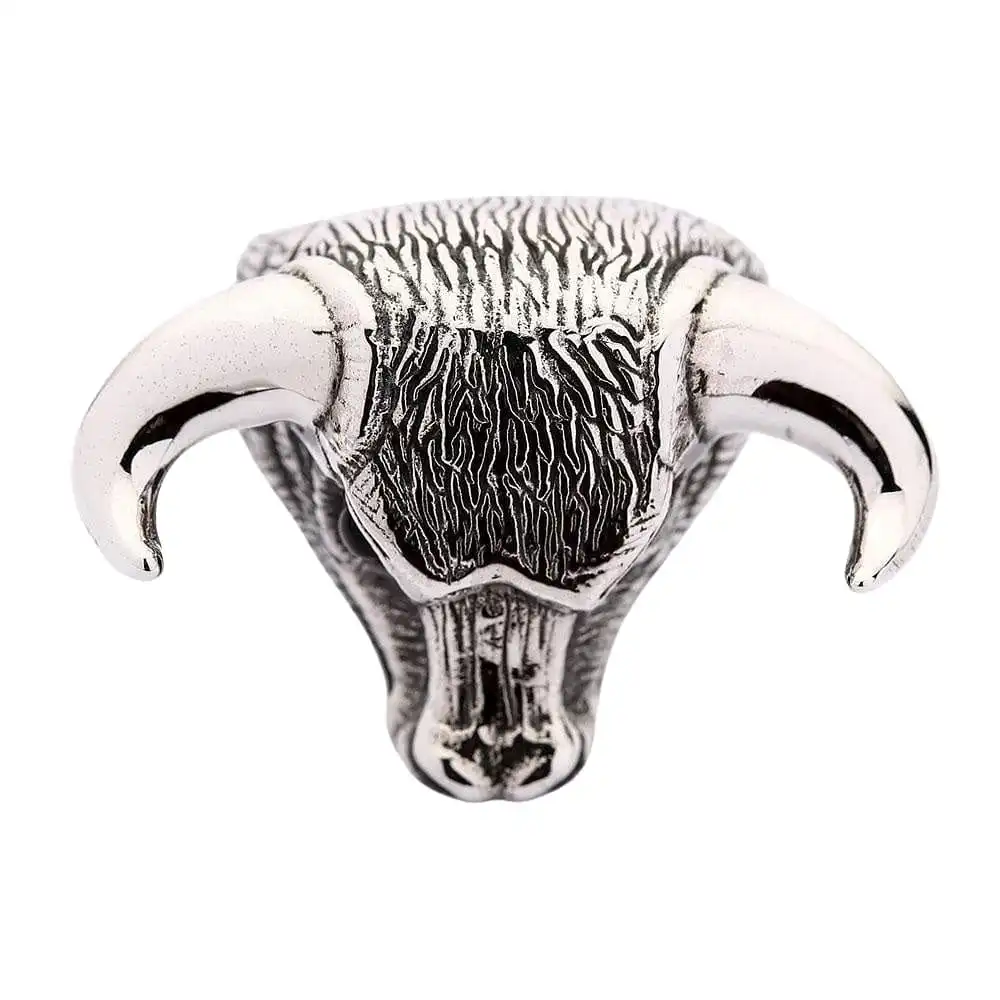 An ox or a bull is one of the most expressive and powerful personifications of masculinity, strength, and fertilizing energy. In a broader sense, it showcases the life-giving force of the universe, it is a symbol of Spring, and the fertility of the earth. Whether you believe in symbolism or not, this ring will definitely help attract interest to your persona once you put it on your finger.We made sure to make this ring as colossal as possible. A bulging bull’s head and its intimidating horns won’t let your presence come amiss. This ring provides a unique wearing experience for its owner while giving the passers-by something to whisper about. The ring is pretty heavy as well (22 grams!) thanks to solid sterling silver. We meticulously polished the bull’s horns and its muzzle to add some shine while simultaneously leaving oxidized furrows on its head and face to imitate fur. A pair of black cabochon onyx stones for eyes completes the bull’s stern look. As always, this piece of jewelry is 100% hand-made because you deserve high-quality at a reasonable cost.
