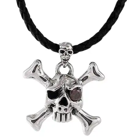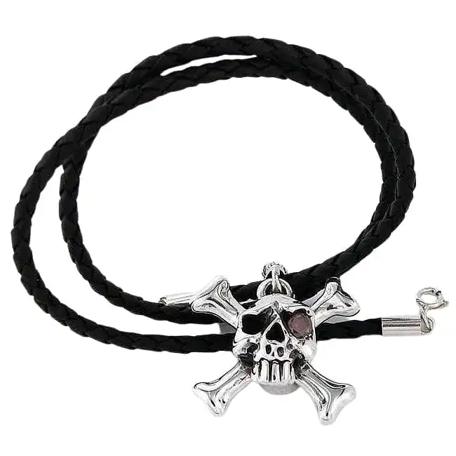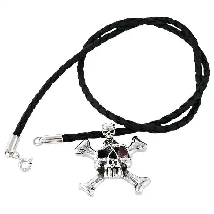 Sterling Silver Red Eyes Crossbones Skull Pendant Leather Necklace