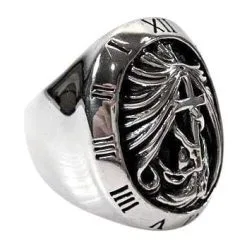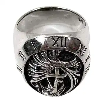 This signet-style dress ring is one that combines masculinity and strength. It is surely a piece for those bold enough to step outside of the box. From the roman numerals that border it through to the engraved, gothic crucifix across the face, it calls out for a person with the confidence to carry this piece off.