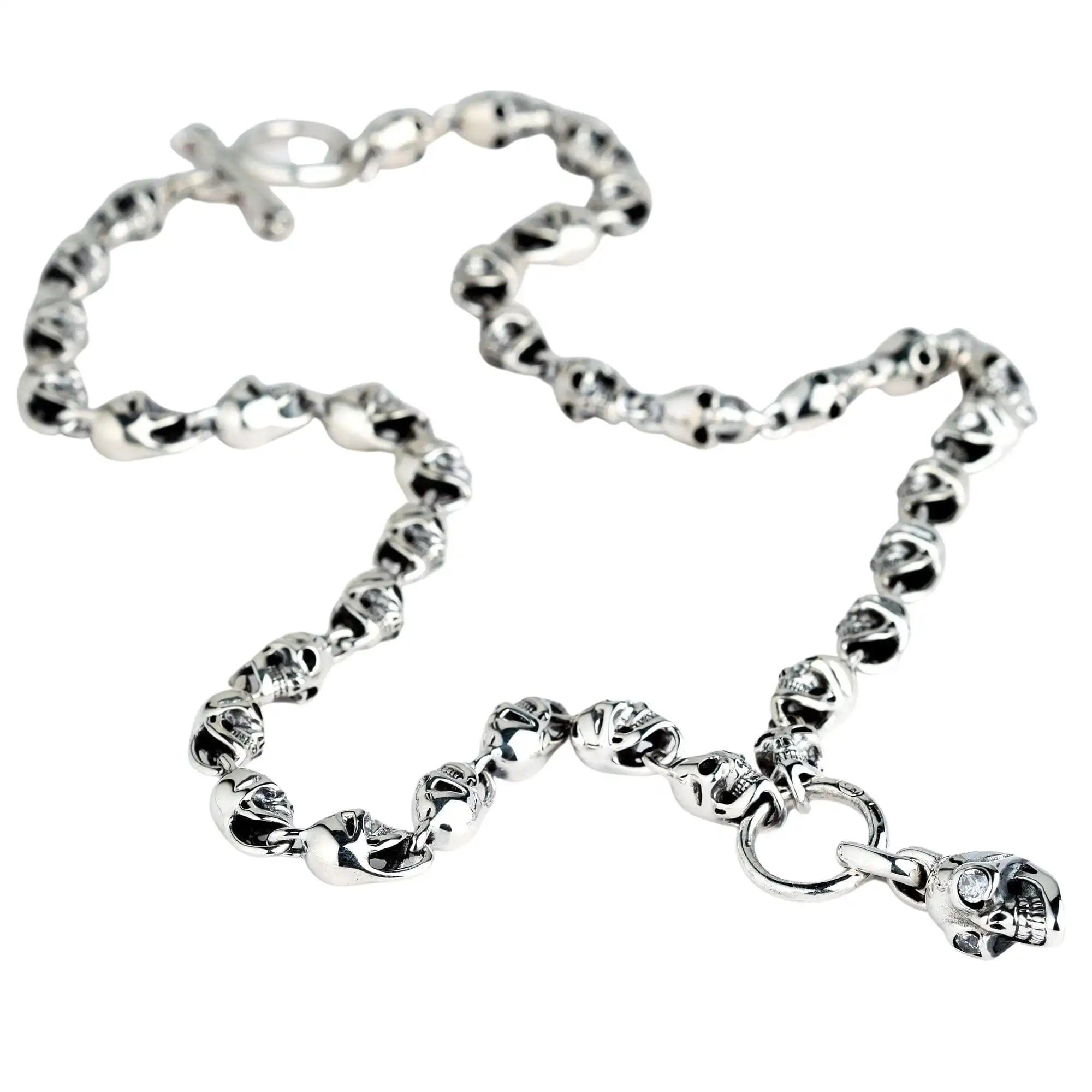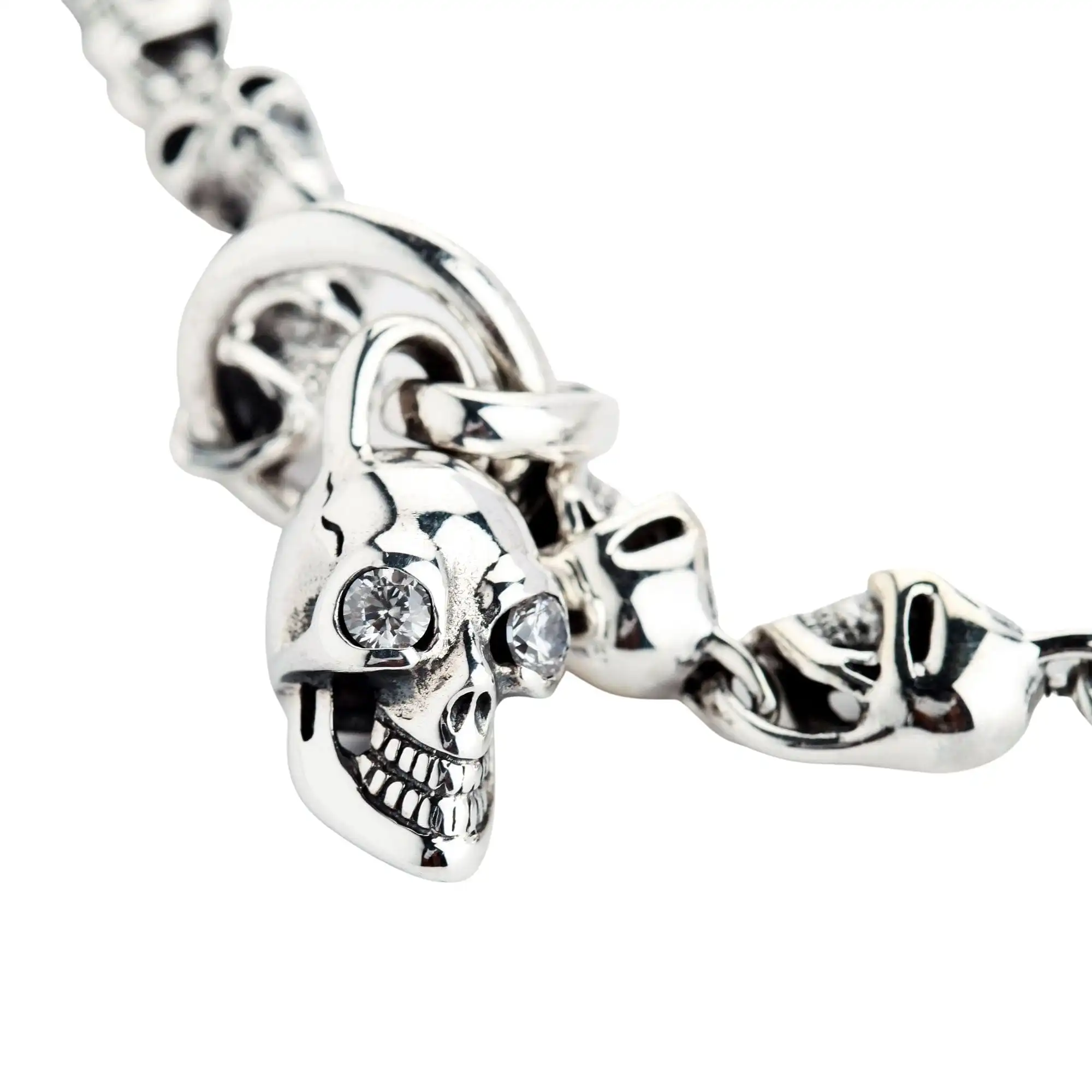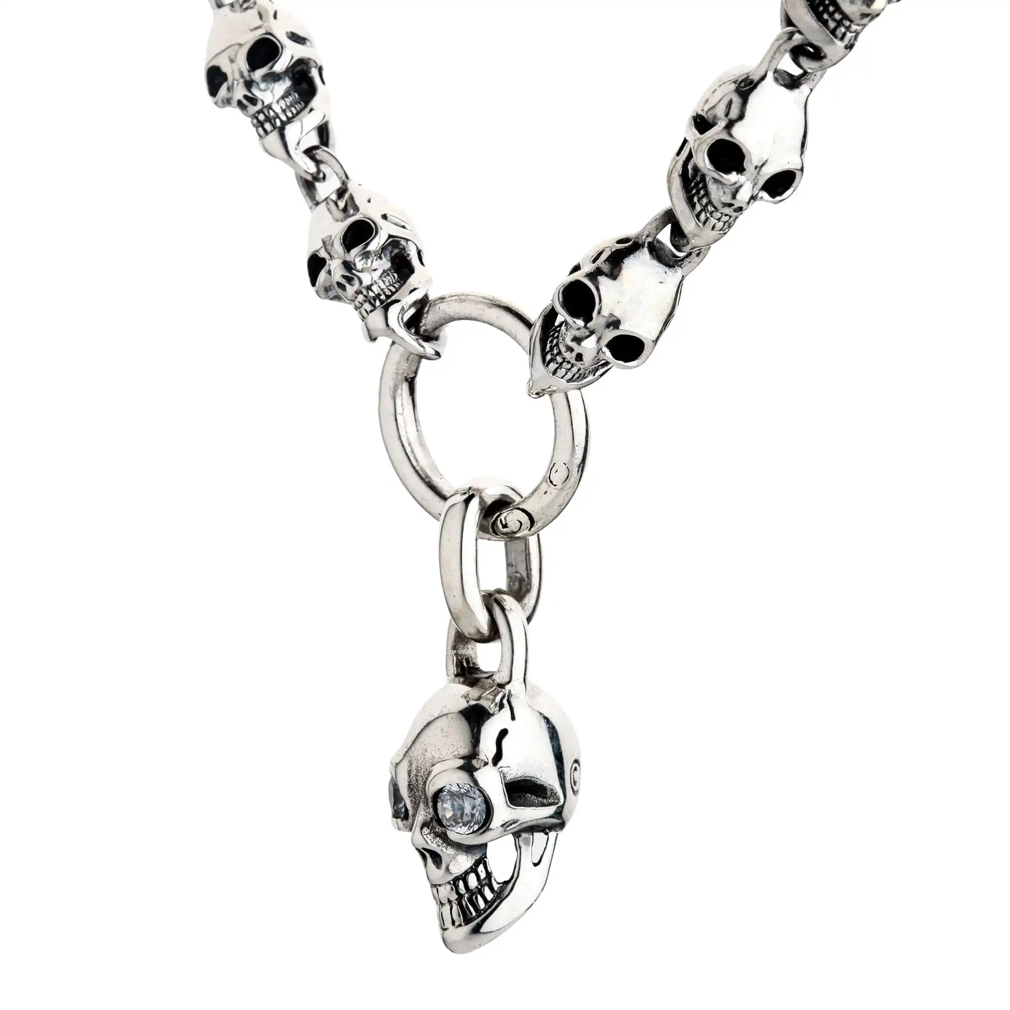 An impressive level of detail presents itself in our Diamond Biker Skull Necklace. With a feeling of power and Gothic inspiration, the dead-eyed glare of immortal skulls pass their gaze over every passer by. Stacked along the chain with a master taking hi place at the pendant, it has an ominous feel to it, inspired by Gothic and rocker fashion.