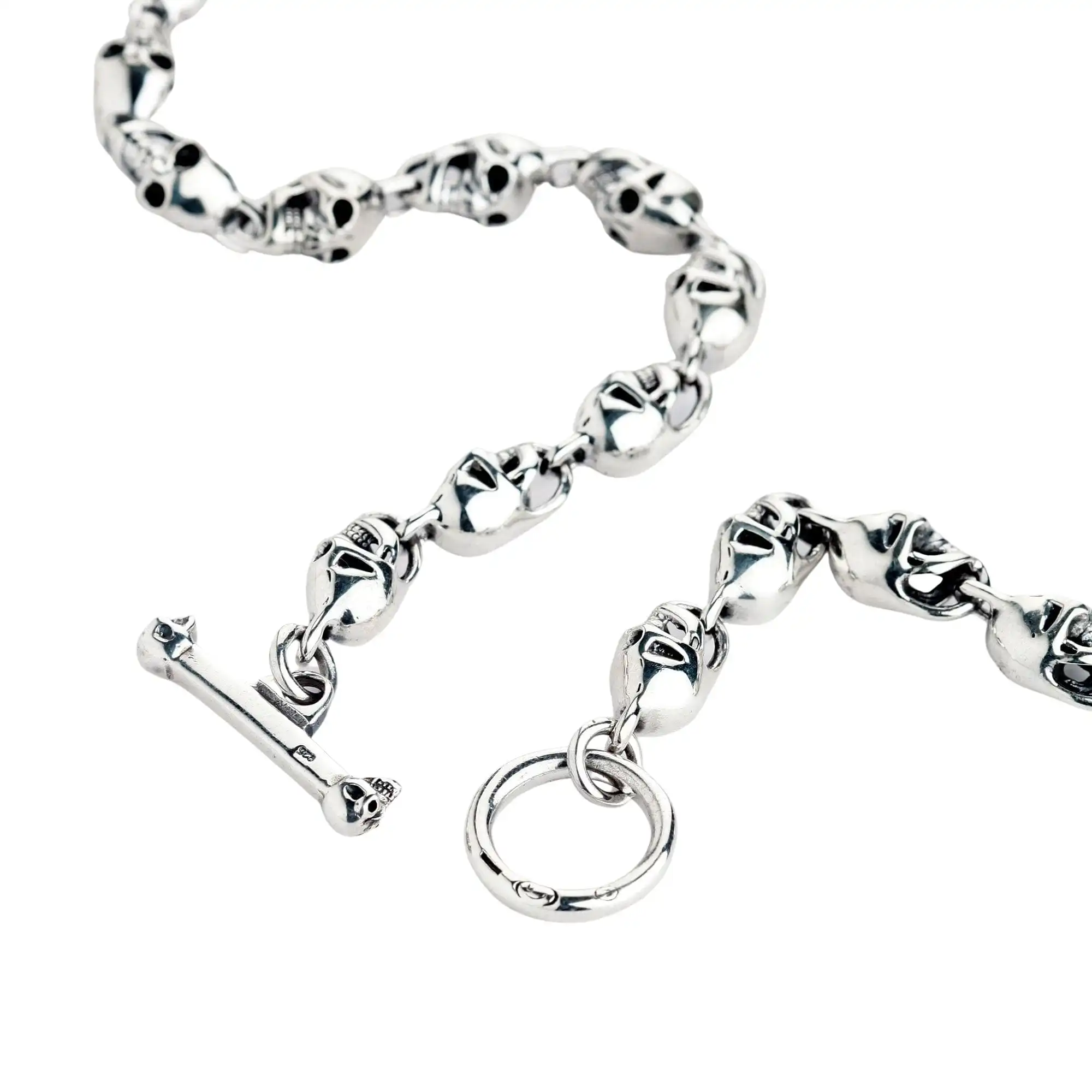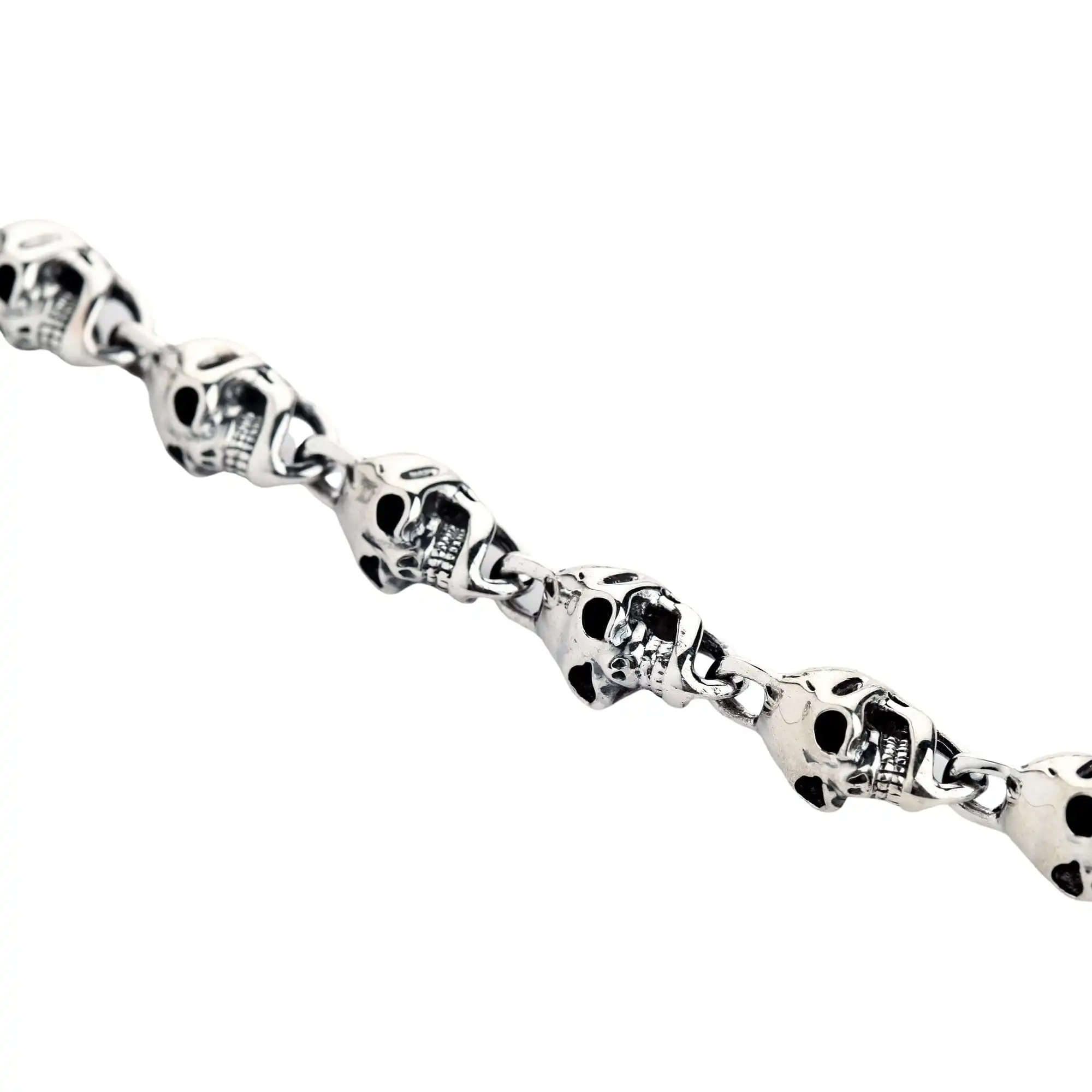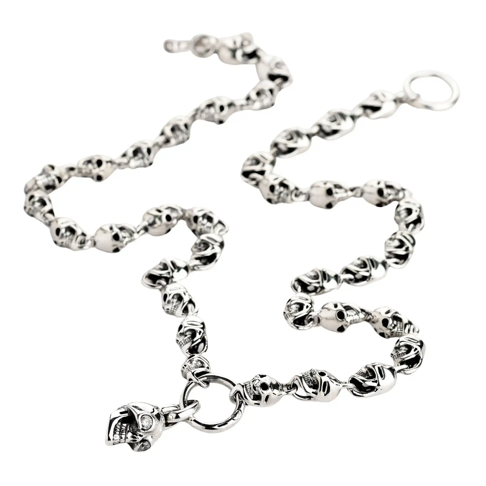 An impressive level of detail presents itself in our Diamond Biker Skull Necklace. With a feeling of power and Gothic inspiration, the dead-eyed glare of immortal skulls pass their gaze over every passer by. Stacked along the chain with a master taking hi place at the pendant, it has an ominous feel to it, inspired by Gothic and rocker fashion.