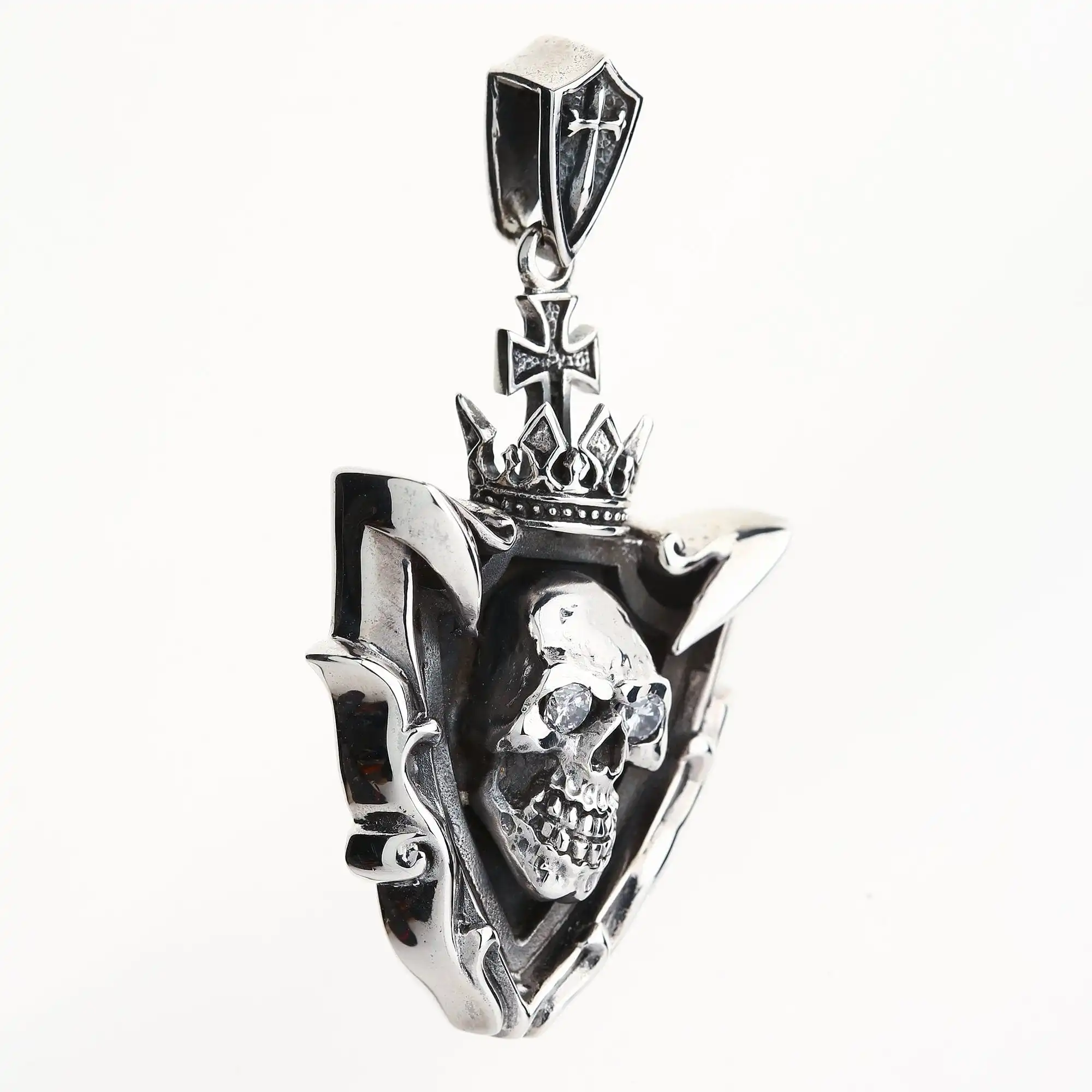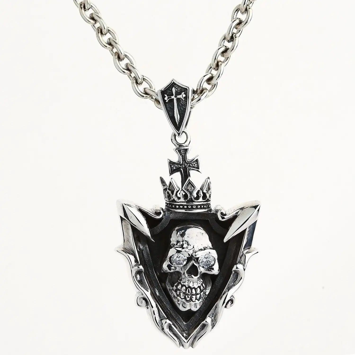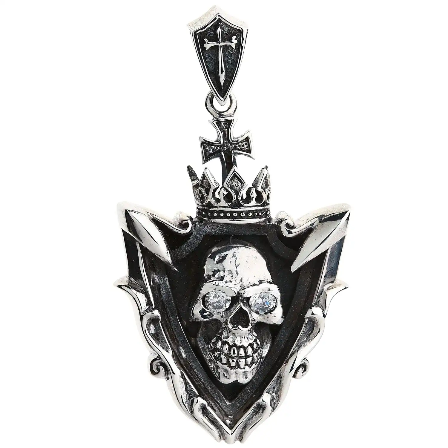 The very first thing that strikes the eyes is an intimidating skull emerging from the depths of the unknown. We didn’t spare sliver to turn shiny light silver into a rough and black texture to convey the feeling of darkness. The skull is enclosed in a shield, which, in turn, is adorned with swirly Gothic patterns. Whilst a skull represents danger, a shield is protection and defense. The corners of this design showcase sharp claw-like elements referring to a beast or evil you have to fight. The flat summit of the shield proudly wears a crown as a symbol of nobility, prudence, and power. A cross rising from the crown speaks of spirituality and powers that guide us on our way. Finally, the pendant’s bail carries an interesting design as well. Its shield shape and darkened appearance coordinates with that of the pendant. A shield is useless without a sword, so we added one to make the look – symbolically and meaningfully – complete.This pendant is a solid piece of sterling silver, masterfully crafted by our expert silversmiths. They cast and finished it by hand.