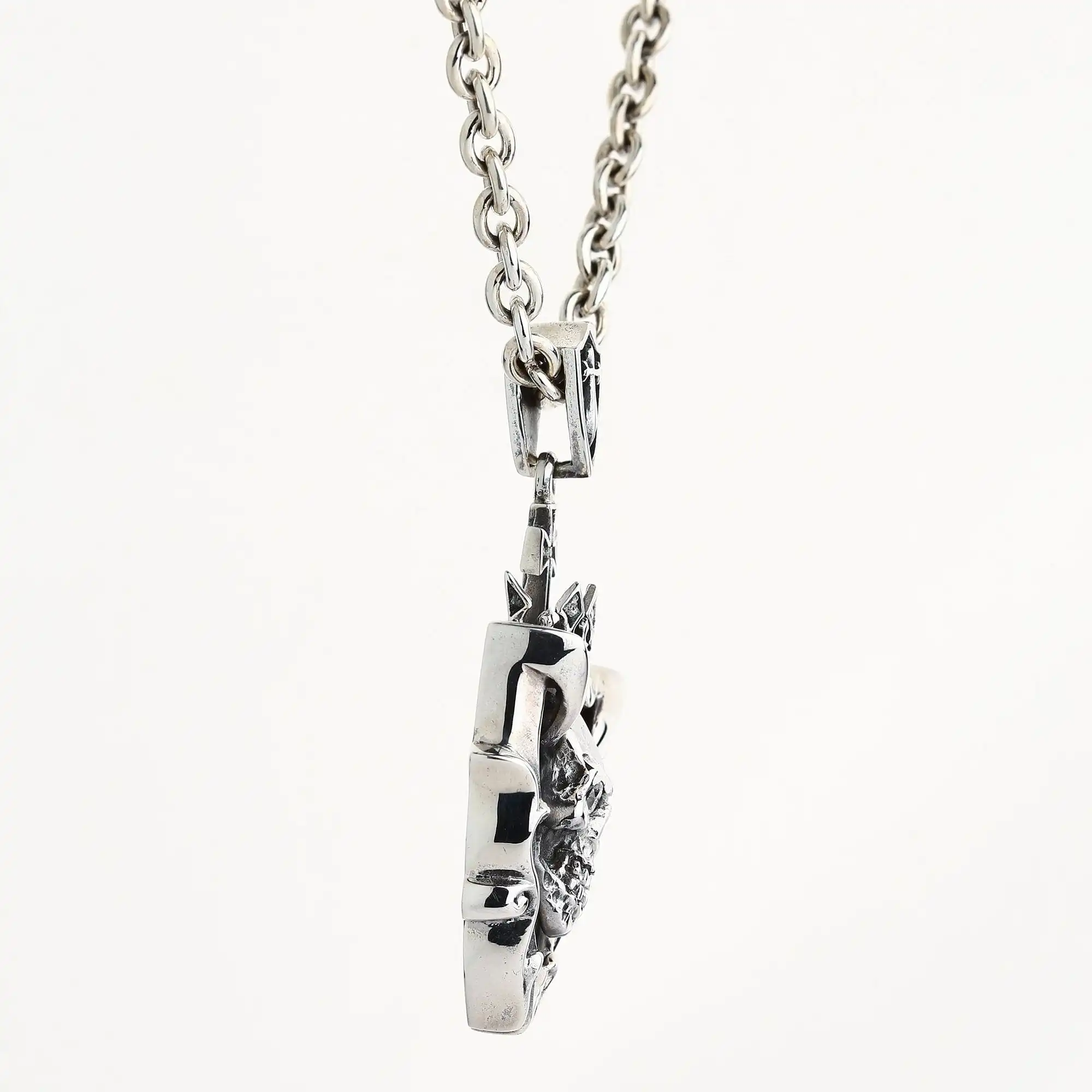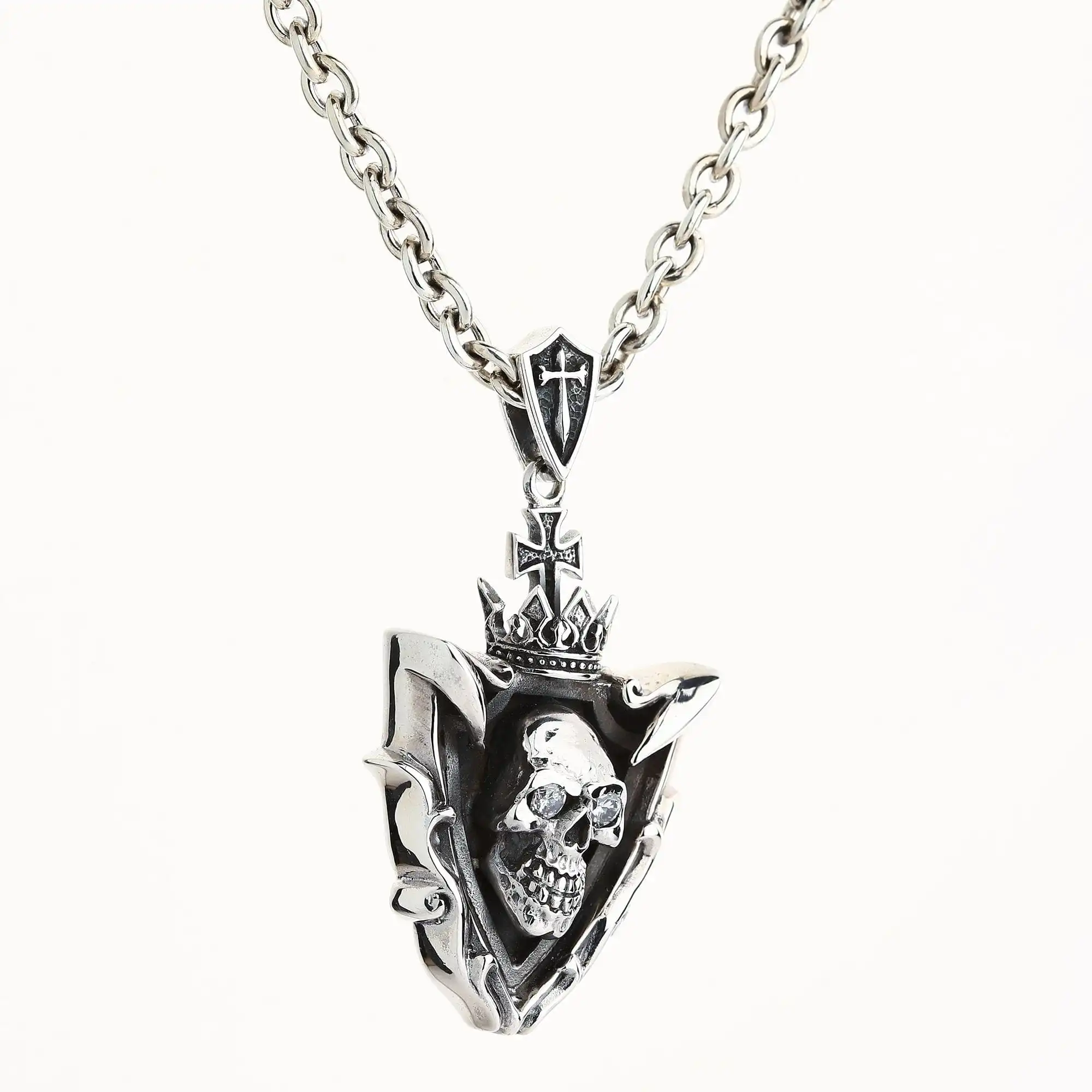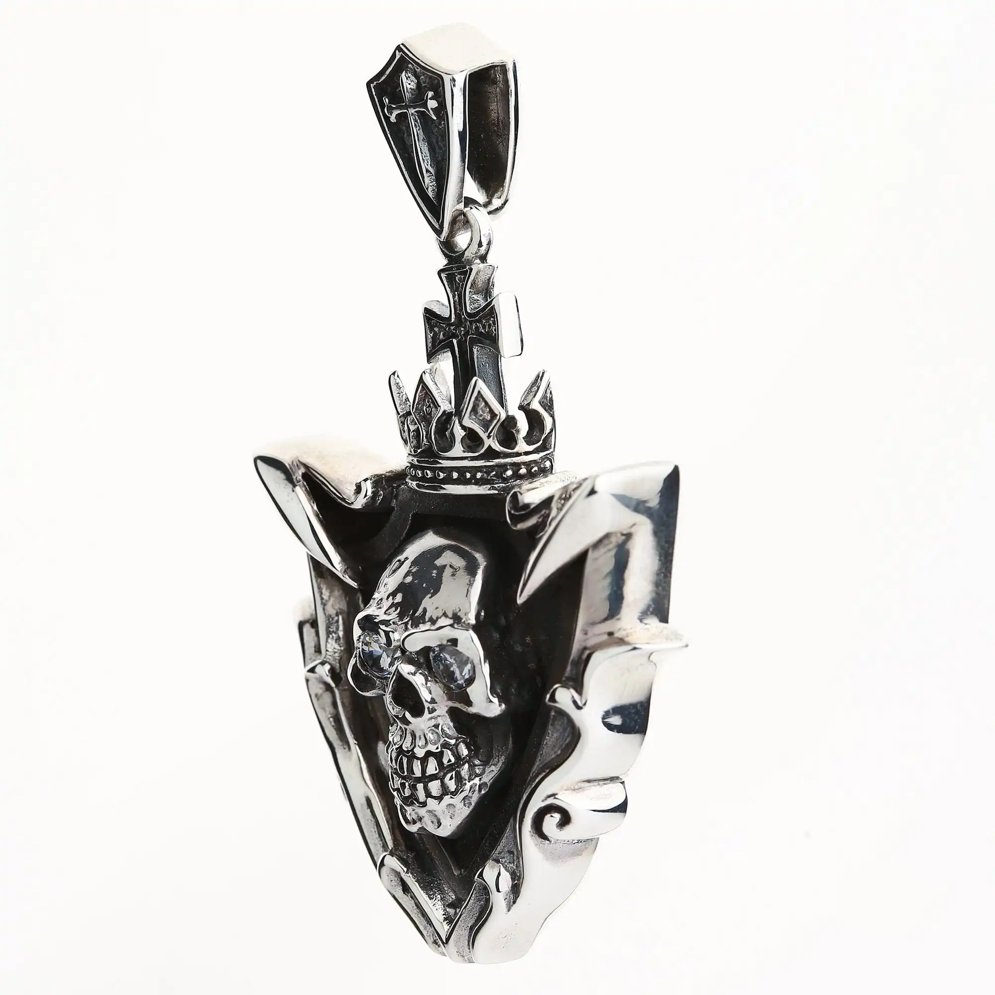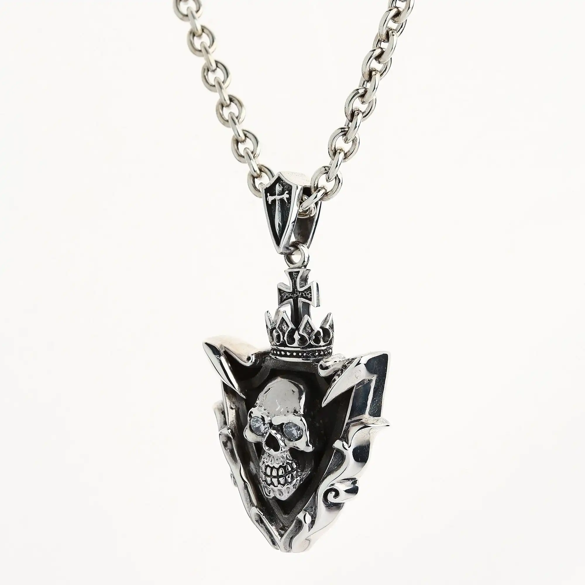 The very first thing that strikes the eyes is an intimidating skull emerging from the depths of the unknown. We didn’t spare sliver to turn shiny light silver into a rough and black texture to convey the feeling of darkness. The skull is enclosed in a shield, which, in turn, is adorned with swirly Gothic patterns. Whilst a skull represents danger, a shield is protection and defense. The corners of this design showcase sharp claw-like elements referring to a beast or evil you have to fight. The flat summit of the shield proudly wears a crown as a symbol of nobility, prudence, and power. A cross rising from the crown speaks of spirituality and powers that guide us on our way. Finally, the pendant’s bail carries an interesting design as well. Its shield shape and darkened appearance coordinates with that of the pendant. A shield is useless without a sword, so we added one to make the look – symbolically and meaningfully – complete.This pendant is a solid piece of sterling silver, masterfully crafted by our expert silversmiths. They cast and finished it by hand.