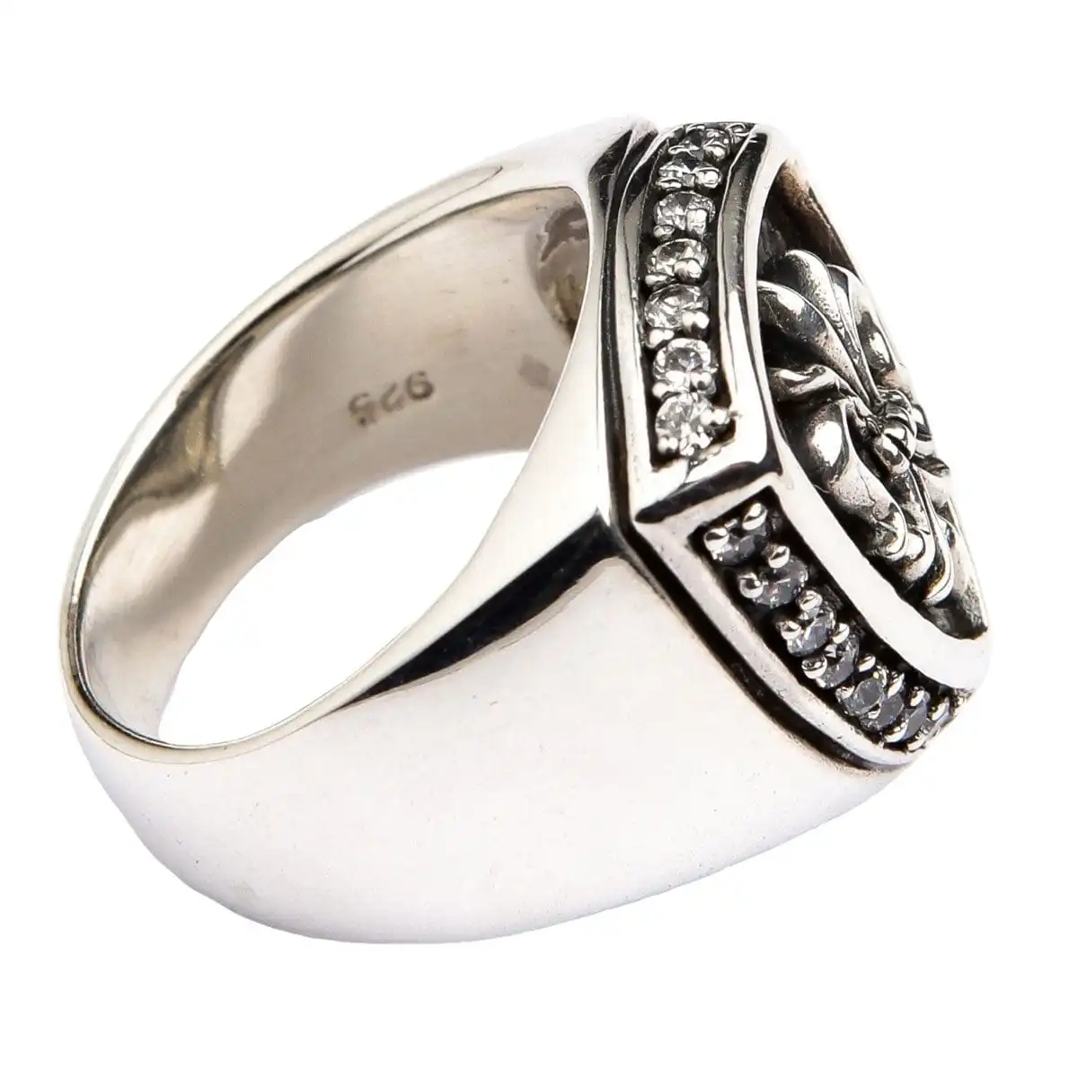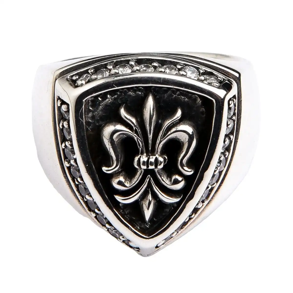 A symbol of unity, this masculine dress ring features the recognisable symbol of the Fleur De Lis. Long since recognised in the Catholic church, this three leaf lily has been bound together to symbol a united front within French history. Here, it sits proudly from a darkened silver shield background and surrounded by a border of shimmering clear diamond stones.