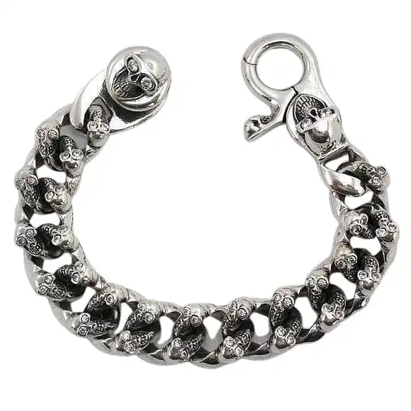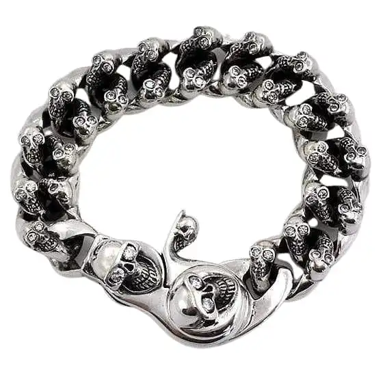 Eyes that glare out as they sparkle – the Diamond Skull Bracelet is a piece that takes centre stage in your collection. Throughout the menacing grin of skull heads peek out at passers by with glistening diamond clear stones sitting in each eye socket. It takes its inspiration from the classic curb bracelet